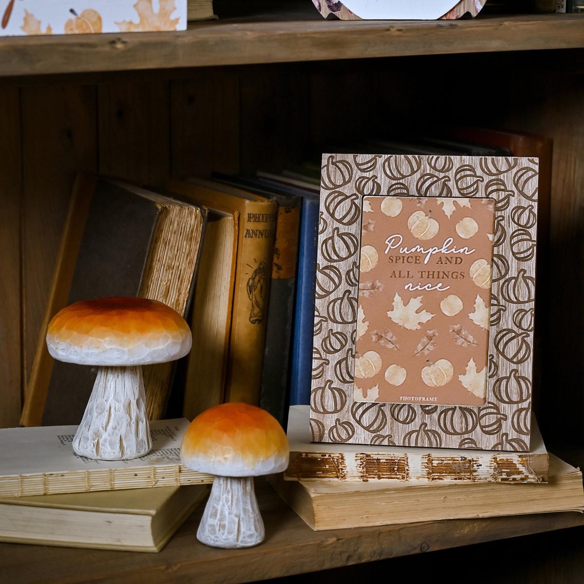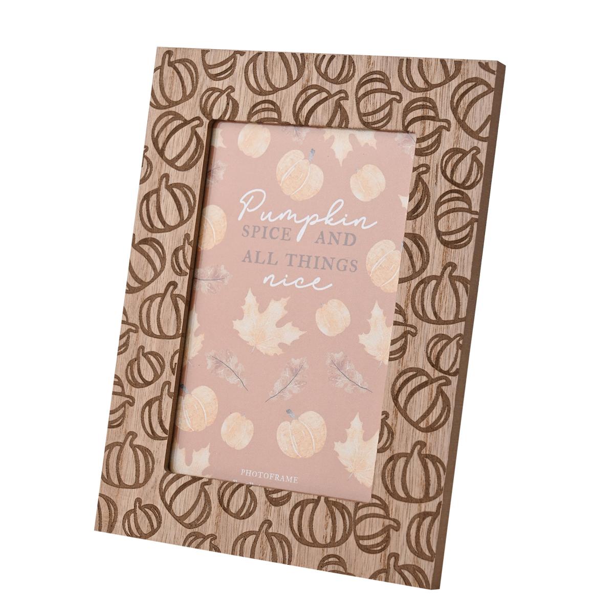 * Wooden frame* 6” x 4” (15cm x 10cm)* Freestanding* Pumpkin pattern Autumn has arrived with this pumpkin patterned photo frame. Display your favourite photo with style. The frame is freestanding and will stand in a portrait orientation. Perfect for shelves or bookcases, this will bring a sprinkle of autumn fun to any room.