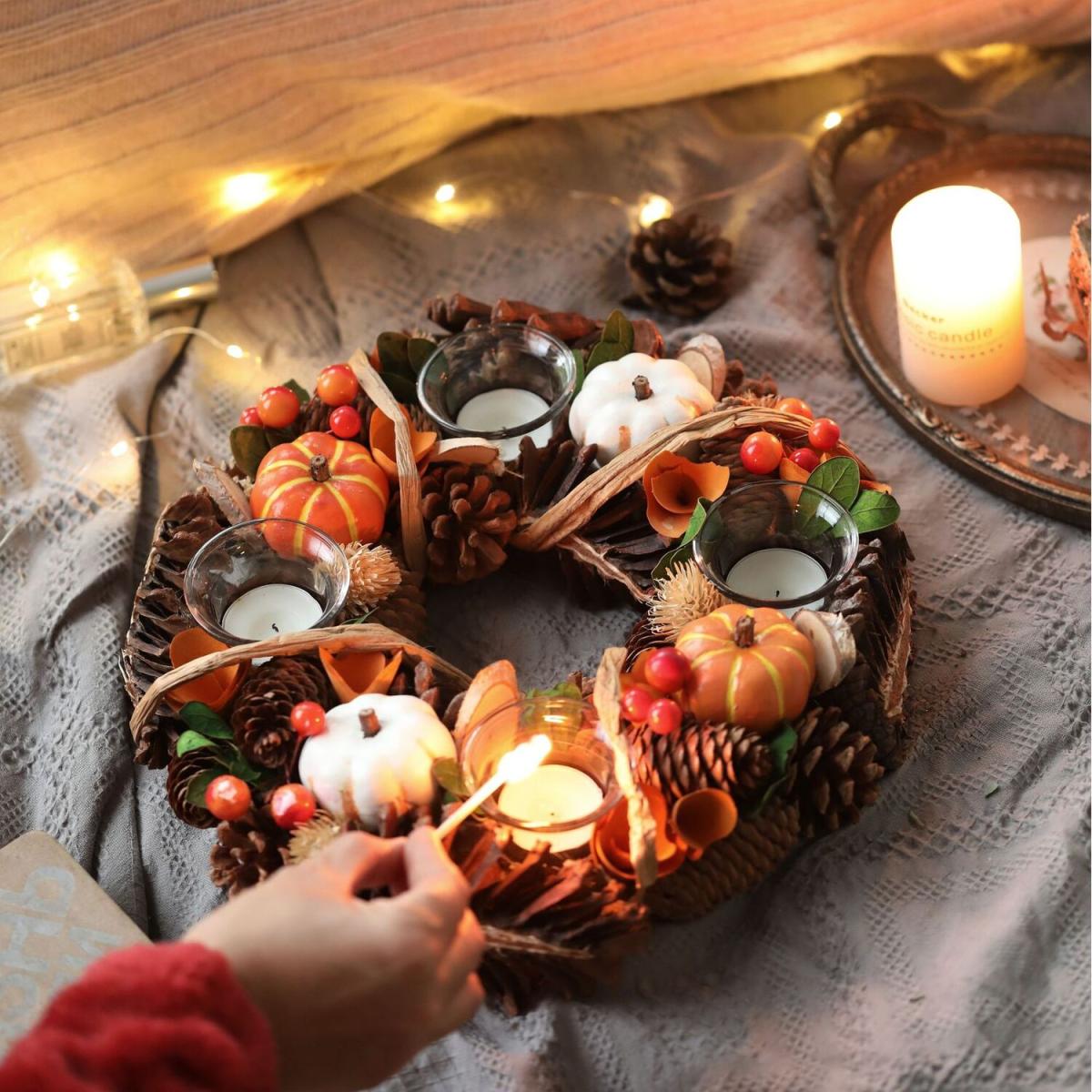 Pumpkin Pine Cone Candle Centerpiece Farmhouse Christmas Halloween Decor - Green