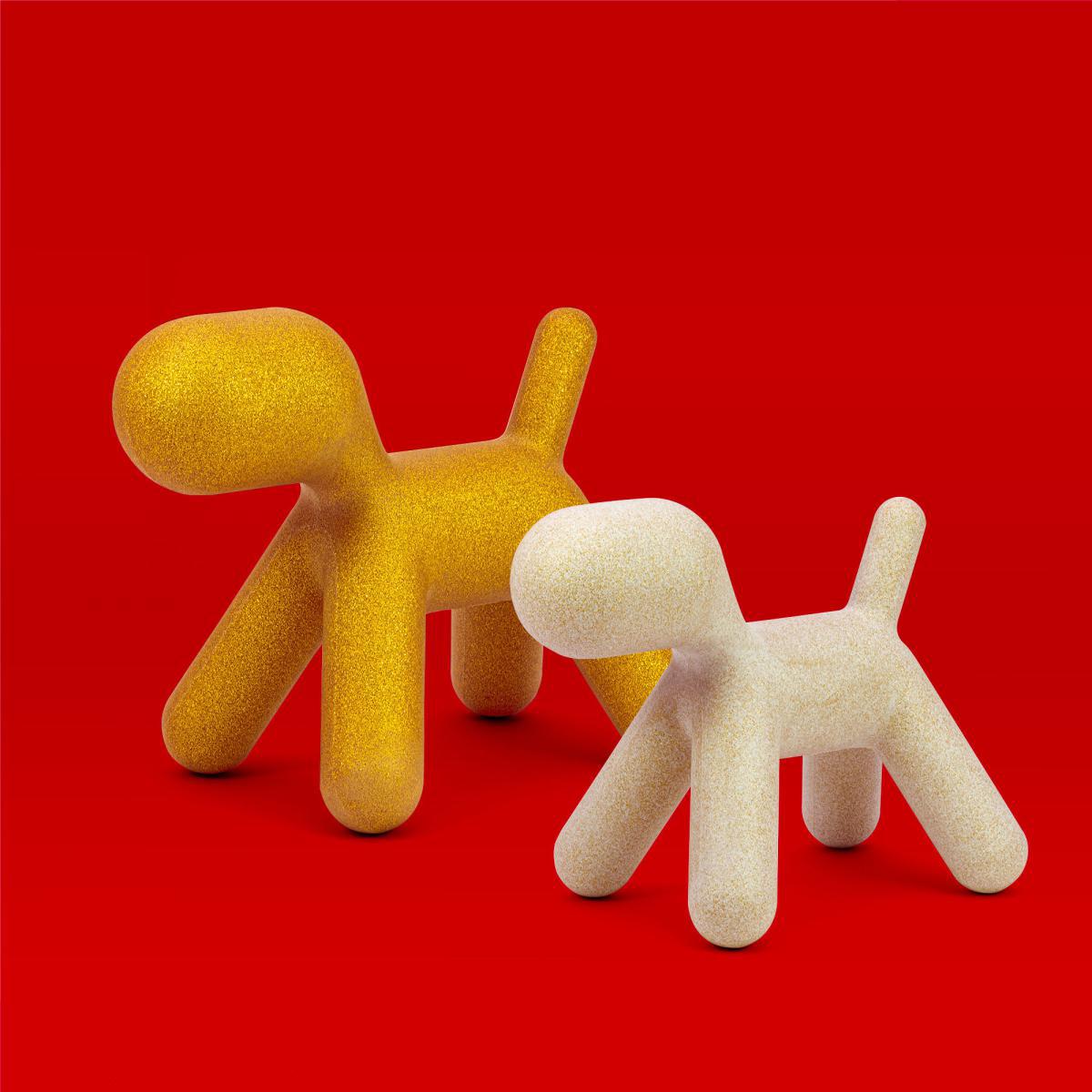 Notice to collectors: for Christmas, Magis has a surprise in store! The iconic Puppy dog is available for the festive season in a new, chic, glamorous version: it's dressed in golden glitter. This limited edition is a future collector’s item: THE perfect gift to give, or to keep for yourself! Created by the king of pop design, Puppy has achieved iconic status. It was in 2003 that this stylised dog came out of the affectionate, playful imagination of Eero Aarnio, the famous Finnish designer who created the iconic Ball chair in the 60s. Straddling the border between art and design, Puppy is both a sculpture and a child's seat. This dog, which doesn’t bark and never bites, is the perfect companion! Made from rotomoulded polyethylene, Puppy is lightweight, strong and can be used outdoors. In a child's room, Puppy is a really fun seat for kids who will delight in sitting on it. Its rounded lines and the lightness of the plastic material are safe for toddlers. Its clean lines are a springboard for the imagination of children, who will make it their playmate. In living room or garden, Puppy acts as a contemporary sculpture. With its ultra-trendy style and iconic silhouette, Puppy catches the eye of all design aficionados. One thing is sure: Puppy's success is not about to come to an end!