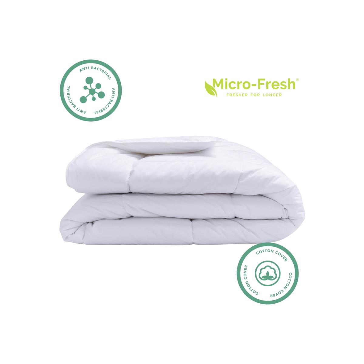 Encased in crisp 100% 233 thread count cotton, this anti-bacterial range features a super soft touch cover treated with Micro-Fresh which helps reduce dust mites and protect against bacteria, keeping your bedding fresher for longer.