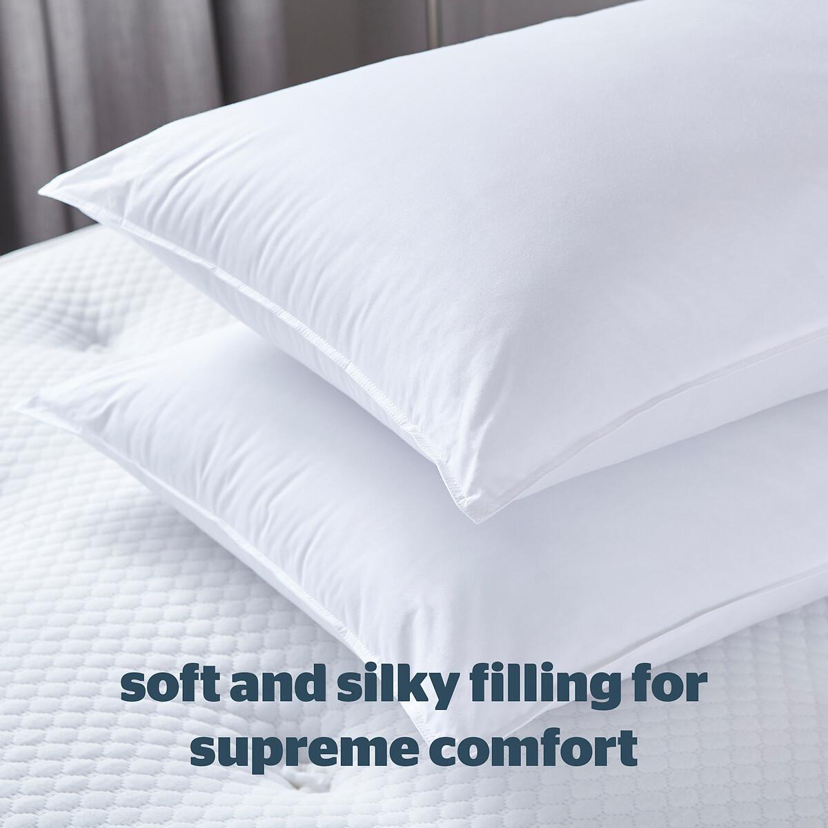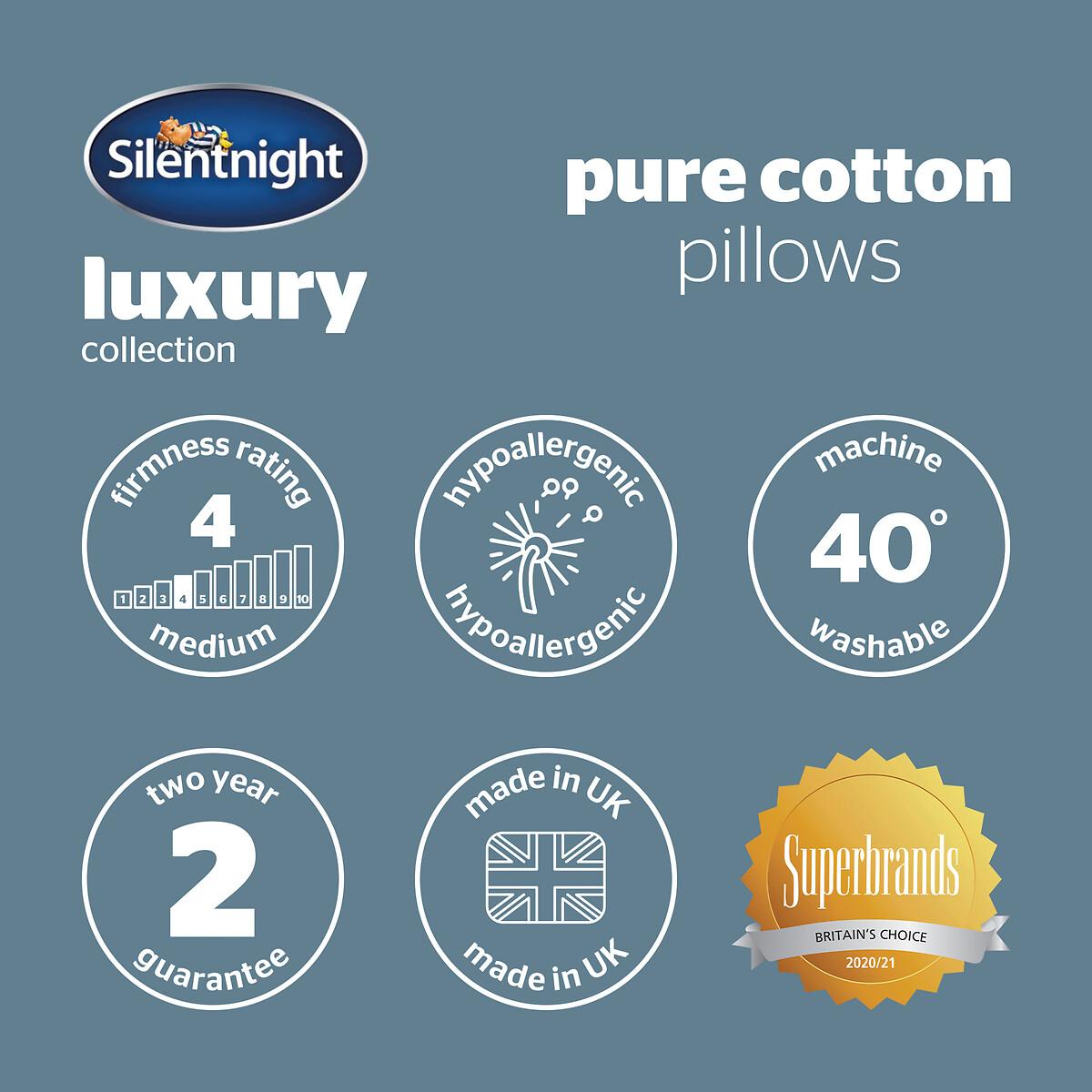 Relax in ultimate luxury with the Silentnight Pure Cotton pillows. The premium 100% cotton covers are naturally breathable, smooth and soft, making sure you get the perfect night’s sleep. The extra soft hollowfibre filling provides unbeatable comfort and gentle support. The Pure Cotton pillows are made in the UK and come with a 2 year manufacturer’s guarantee so you can feel rest assured with your purchase. These pillows are machine washable to ensure they stay fresher for longer. The pillows have hypoallergenic properties taking away any worry from those who suffer any household allergies.•Crafted with luxuriously soft and smooth pure cotton covers that are naturally cooling and breathable.•Filled with soft and silky fibres for supreme comfort.•Use one pillow for soft comfort or two pillows for medium comfort.•The pillows do not contain any materials that are likely to cause allergies.•You can wash your pillow to keep them feeling fresh and clean.•Guarantee: 2 year manufacturer’s guarantee for ultimate peace of mind, made in the UK.This product will be dispatched by one of our trusted suppliers. You’ll be contacted by their selected courier about your delivery. COMFY01. Goods must be unused and returned in their original packaging. If sealed for health/hygiene reasons they must also be returned unopened with seals, stickers and tags intact.