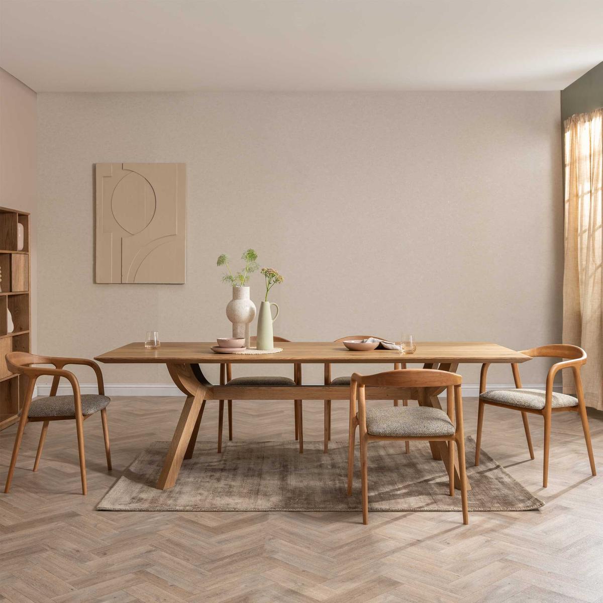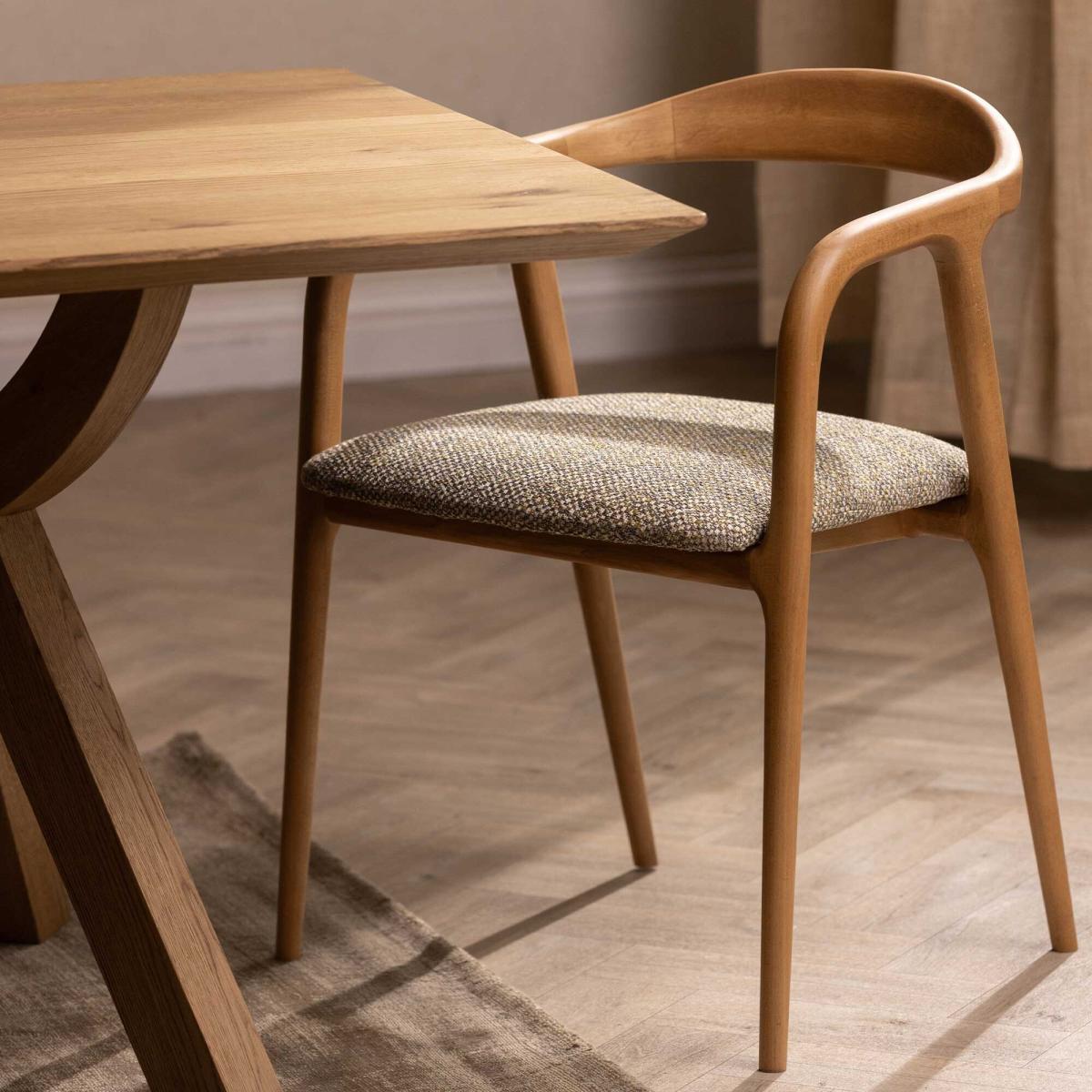 I’m a fan of the Nelda chair for its clean lines and gentle curve, which offer both comfort and a subtle design statement. The solid wood frame and tapered legs sit beautifully in Scandi, mid-century or contemporary schemes, while the upholstered seat adds a tactile contrast that stops the look feeling too cold. Styling tip: mix it with a light oak or marble-topped table and layer in natural linens or a simple patterned runner. A group of four around a round table creates an inviting dining nook, and adding a few potted plants nearby will soften the overall look.
