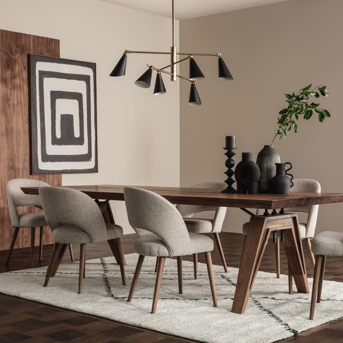 I’m a fan of the Tiros table for its sturdy, lived-in look and generous scale - it immediately anchors both open-plan kitchens and dedicated dining rooms. The rich brown finish and clean lines suit a range of interiors, from Scandi-inspired schemes to modern rustic or pared-back contemporary spaces, and it plays beautifully off both metal and upholstered seating. For styling, keep the tabletop clutter-free: a pair of tapered candles in brass holders or a low, ceramic fruit bowl will add warmth without overwhelming its grain. Mix dining chairs - think grey upholstered alongside simple black metal - for a relaxed, collected feel, and layer a neutral jute runner or natural-fibre rug underneath to define the area and protect your floor.