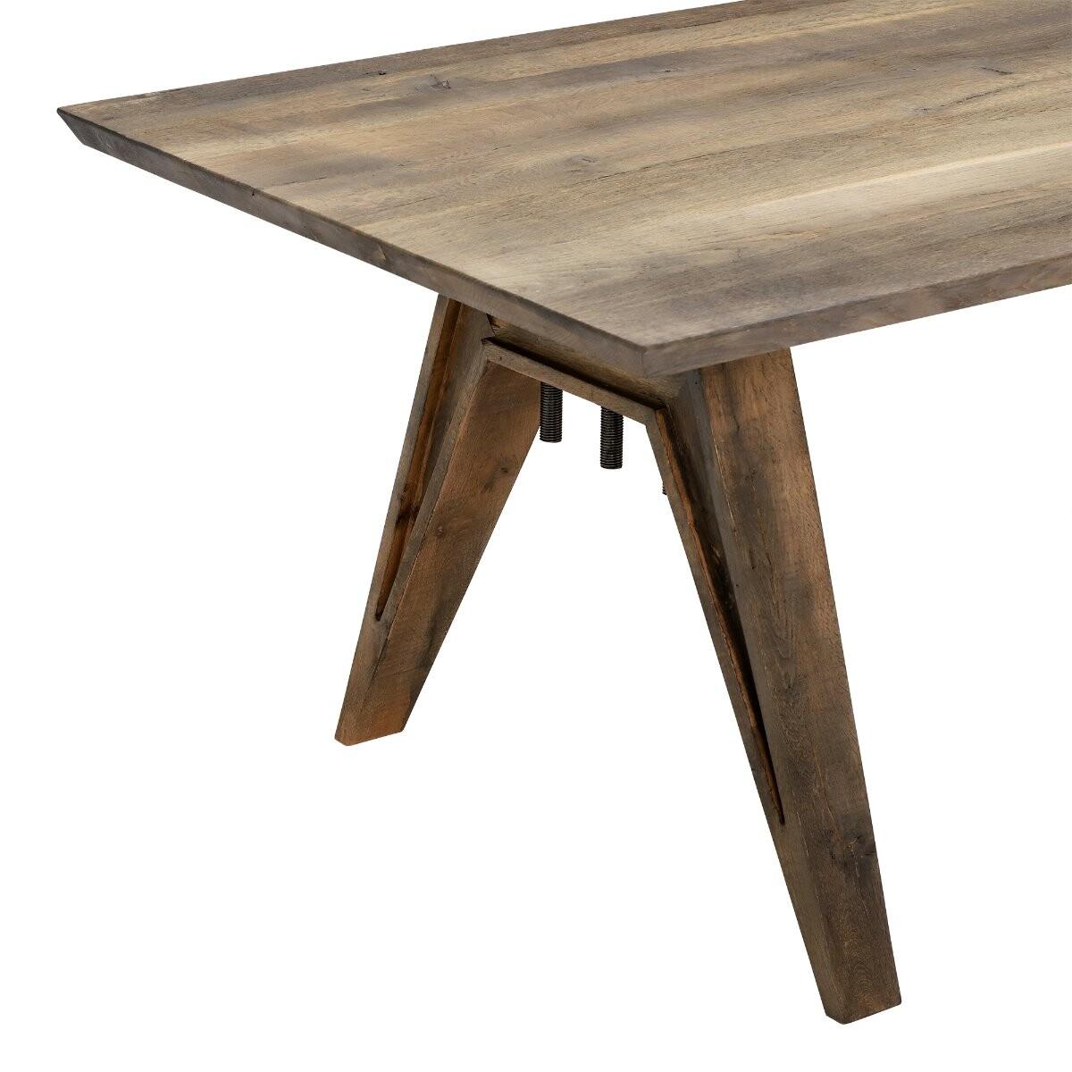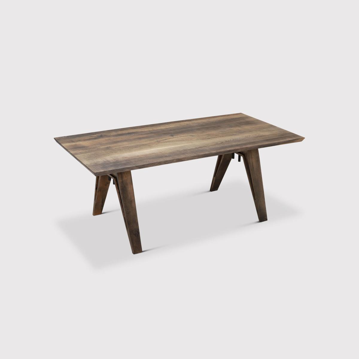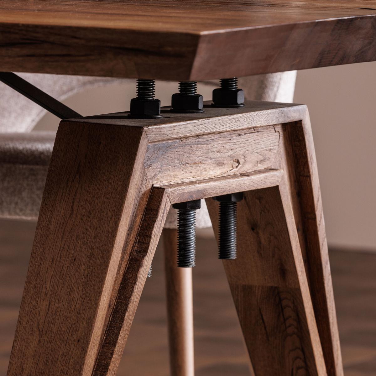 With its striking design details and unique shape, the Tiros dining table will make any mealtime a stylish occasion. Full of character, its wood is heavily distressed that complements the overall industrial feel. Sharp, angular legs lend a futuristic