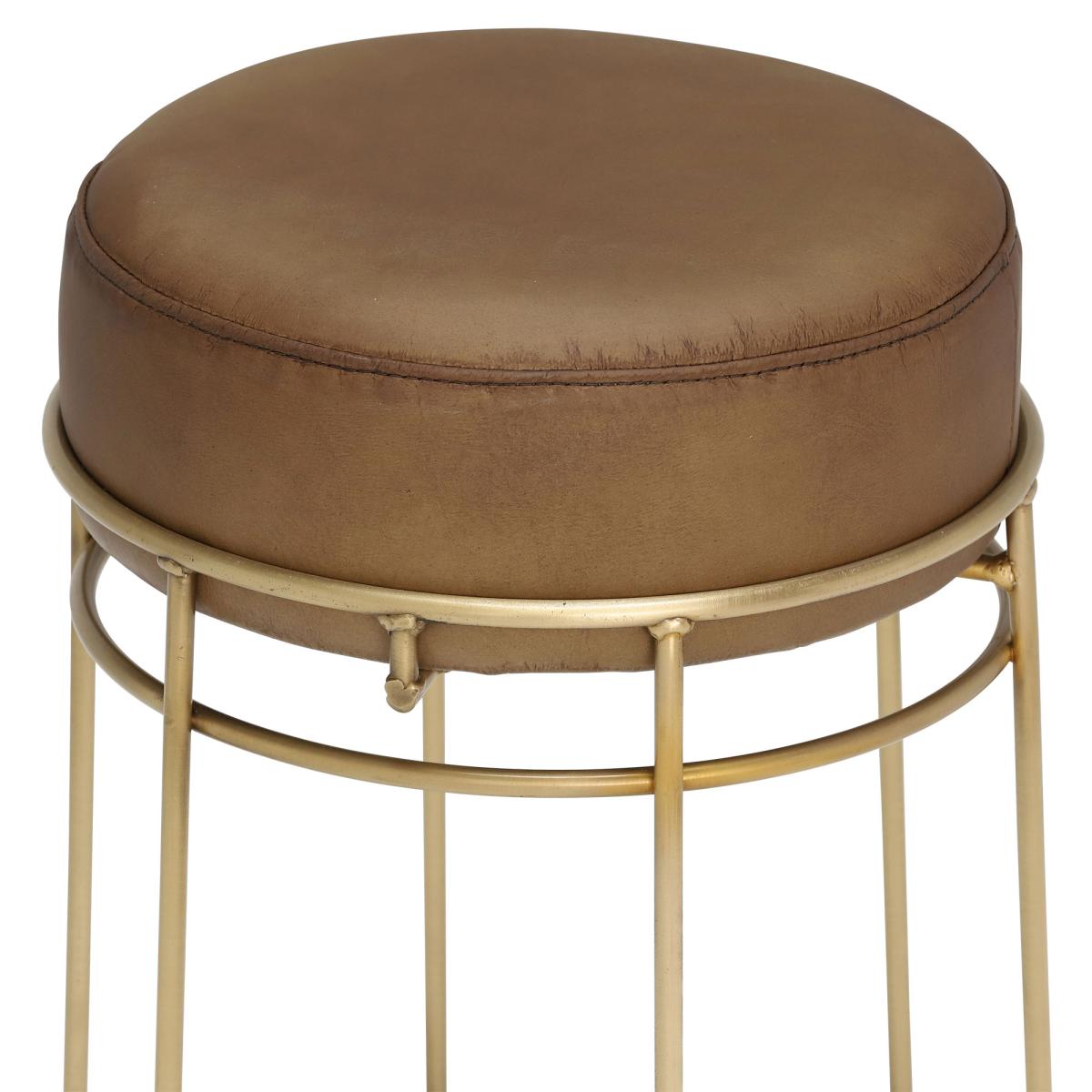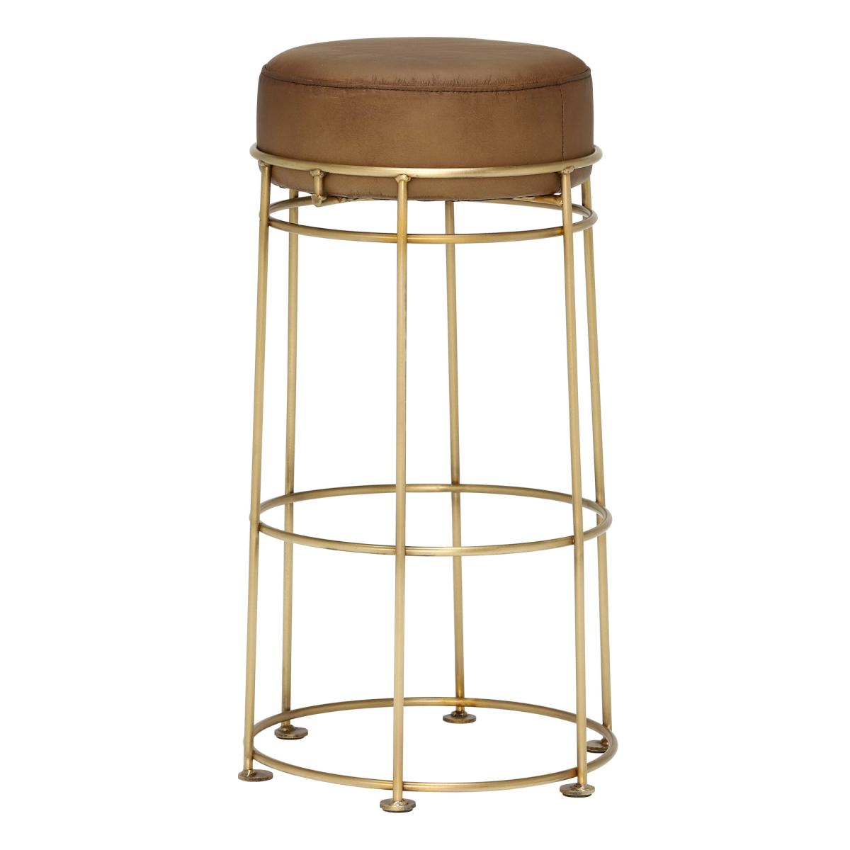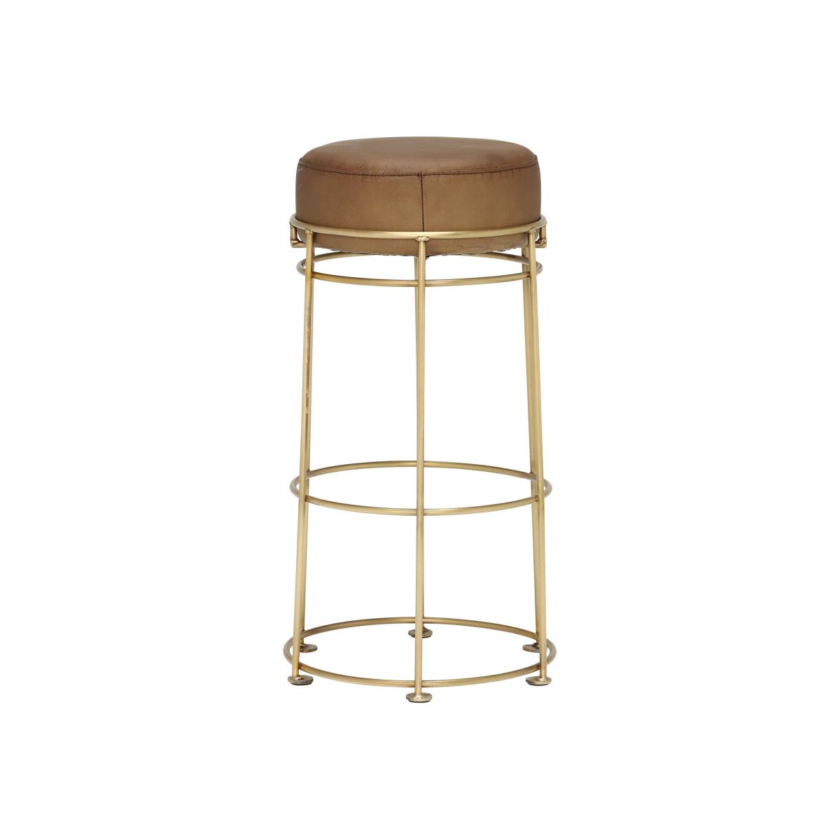 A sophisticated seating choice for your home bar or kitchen island, the Vesper leather bar stool features a sleek metal frame finished in on-trend brass for a vintage touch. Incredibly comfortable, the seat is filled with high-quality foam that provides lasting support. Beautifully upholstered in your choice of hand-treated leather, its detailed with stylish exposed stitching. With a simple round design and an open frame, this bar stool offers a practical place to perch without taking up too much space. Choose between earthy browns, blacks and greys, or colourful red, blue and yellow.