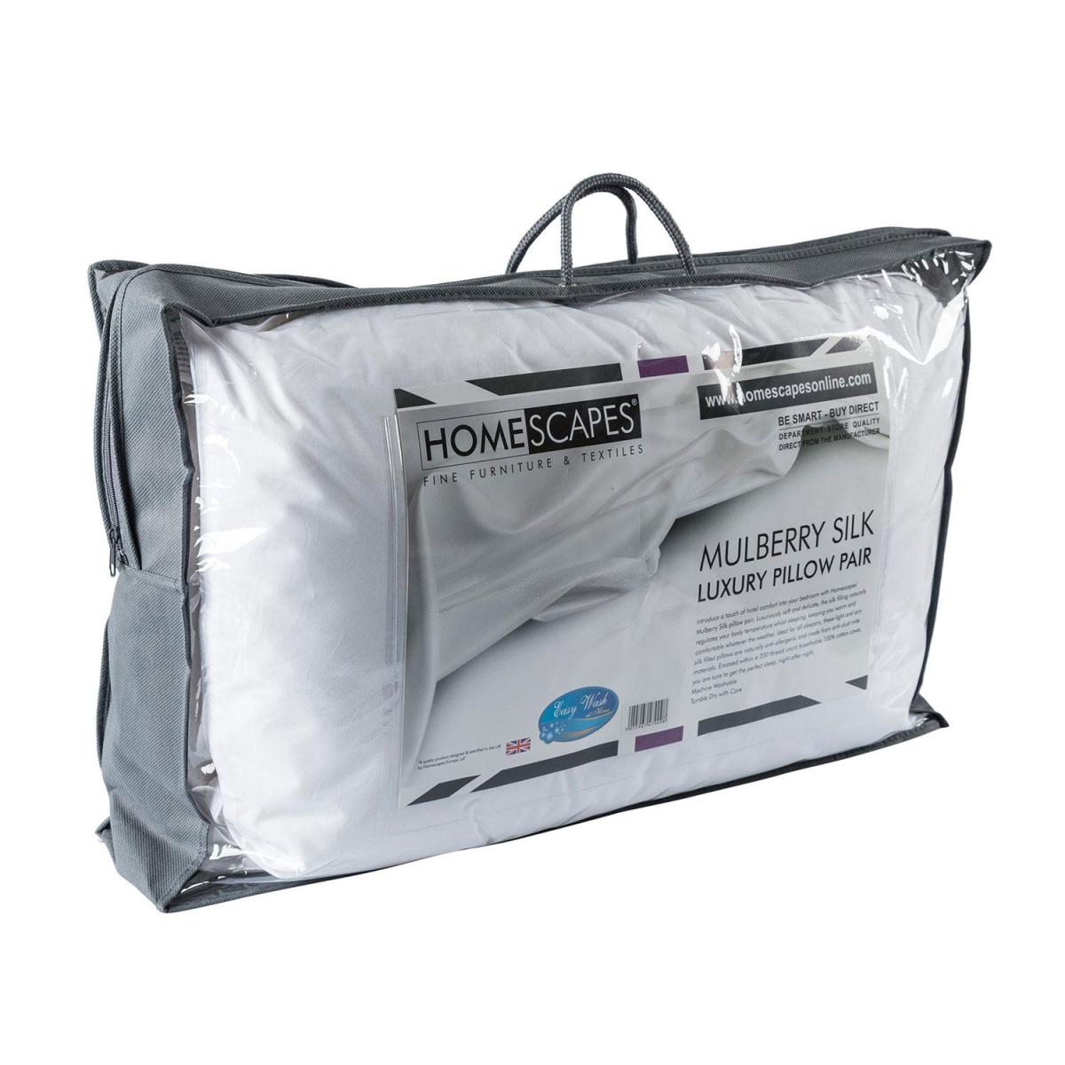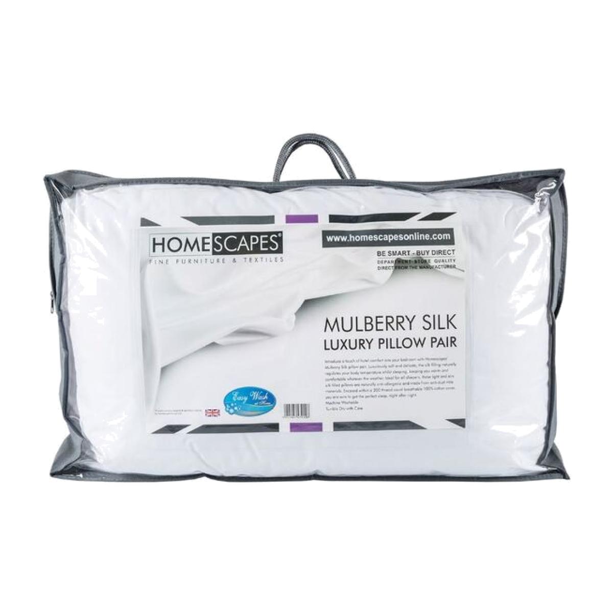 Treat yourself to the best night's sleep with this Homescapes 100 Mulberry Silk Pillow Pair. Created with luxury in mind, these pillows are filled completely with 100 Mulberry Silk unlike other silk pillows on the market. For breathability, the natural filling is encased within a 200-thread count 100 cotton cover to keep you cool. Regarded as the highest quality silk, Mulberry silk will naturally regulate your body temperature to ensure that you remain comfortable throughout the entire night. This soft and delicate filling offers soft support whilst you sleep, and these light and airy pillows are even suitable for those who suffer from allergies. This is due to the Mulberry Silk being naturally hypoallergenic and anti-dust mite. Pack includes two 100 Mulberry Silk Pillows and both are UK standard size.