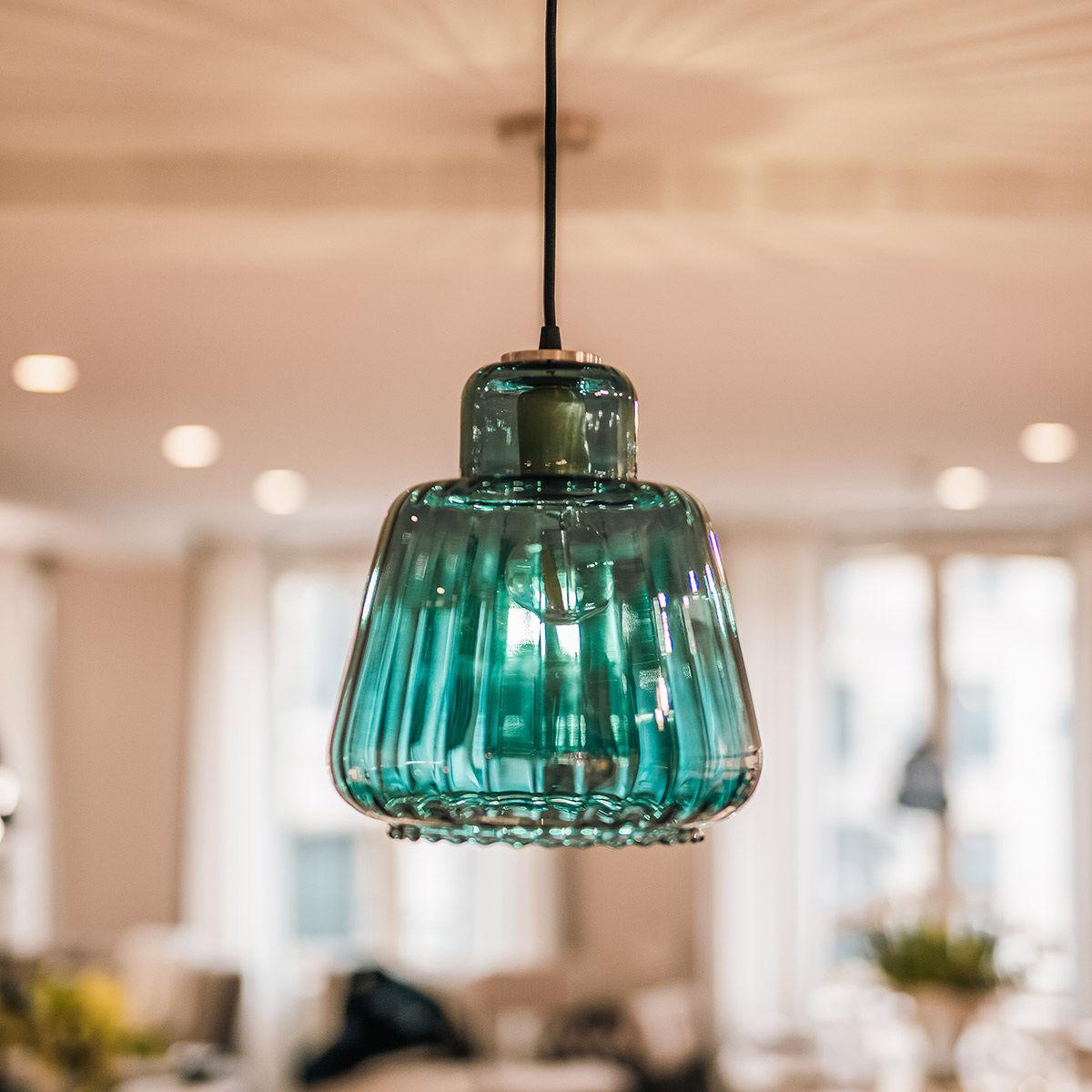 The Pure pendant, with its sober, elegant design, brings a very special shine to any room. Made in Portugal, this striated glass pendant is blown in an aluminium mould, then lacquered in Sarah Blue.