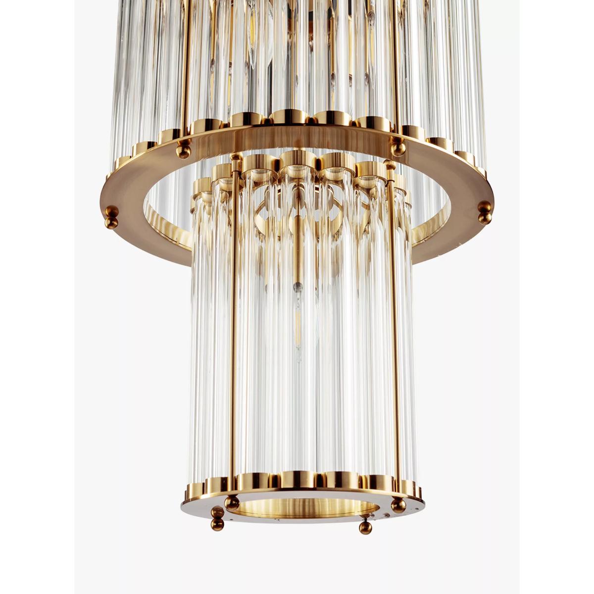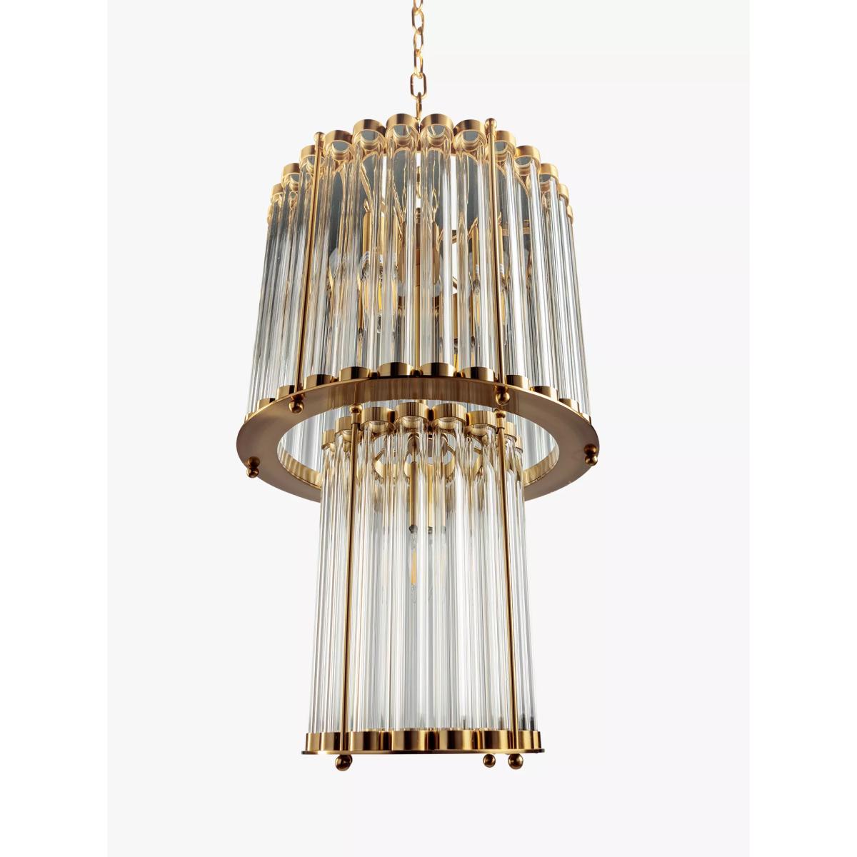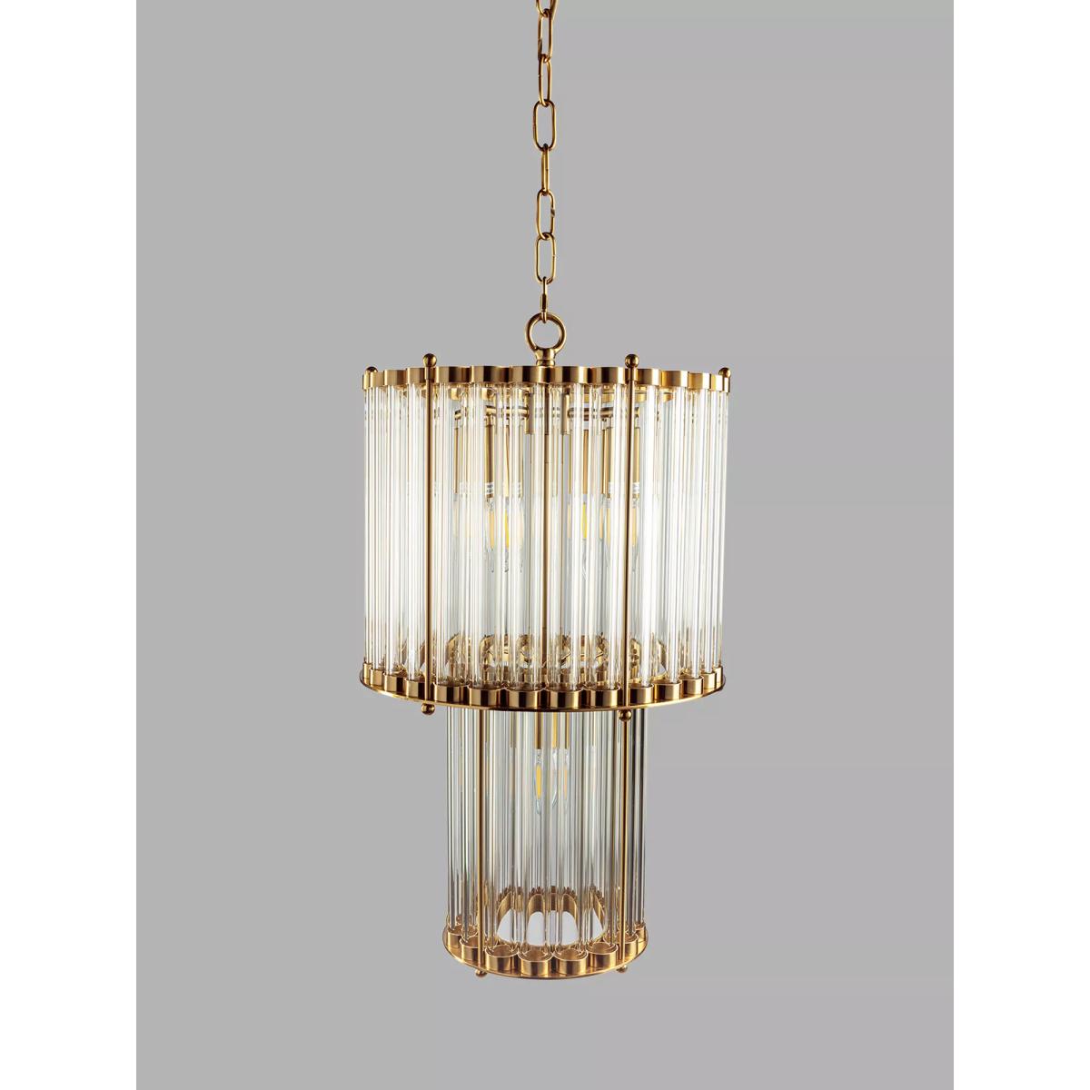 The tiered Monza ceiling light is inspired by mid-century design, perfect for use in stairwells or kitchen islands, the soft lighting is diffused through the glass rods.