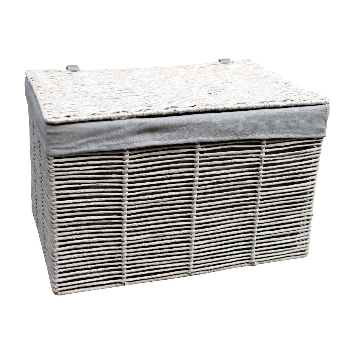 Featuring a grey lining and painted grey finish, this woven paper rope trunk with closable lid is available in a choice of sizes.