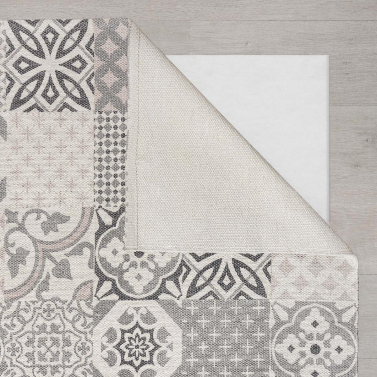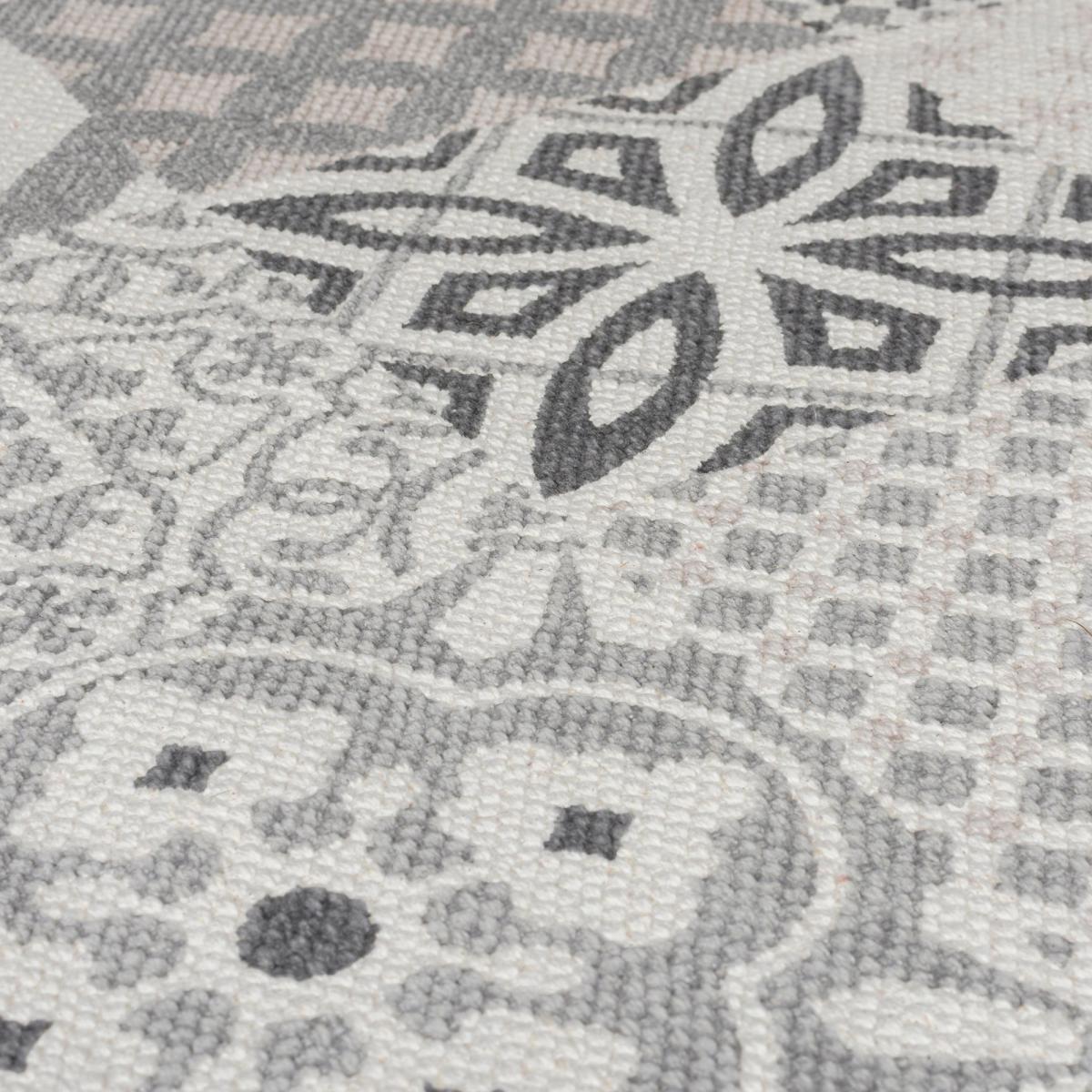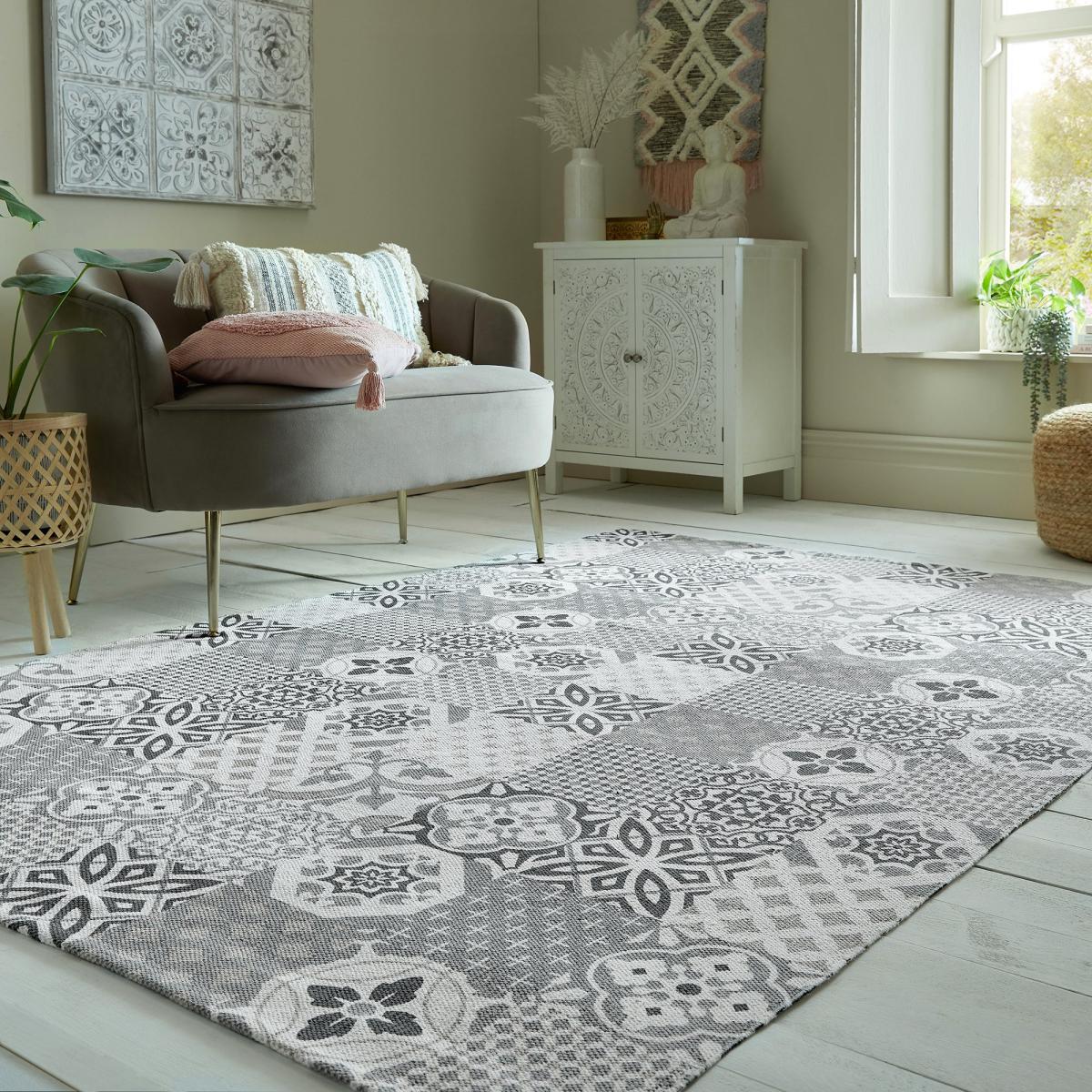 Our Purity Tile Cotton Rug pairs a classic tile look with floral motifs for a timeless look. The Purity Tile Cotton Rug has a modern and flexible flatweave pile that is blanket like in texture. The thin 0cm pile makes the Purity Tile Cotton Rug convenient to move and fold away. Hand-woven by skilled rug artisans and hand-finished with fringe detailing, the Purity Tile Cotton Rug is made from 100% cotton. We love using this style to add a layer of comfort to bedrooms and dressing rooms. Safe for use on a heated floor. Use a suction type vacuum - rotating brushes may damage this rug. Re-roll your rug pile out for 24 hours to reduce curling. Regularly turn to ensure even wear. An anti-slip mat will help prevent slipping. Blot spills immediately with a clean, dry white cloth. Do not rub. Do not place this rug near an open fire. Please do not leave children or infants unattended.