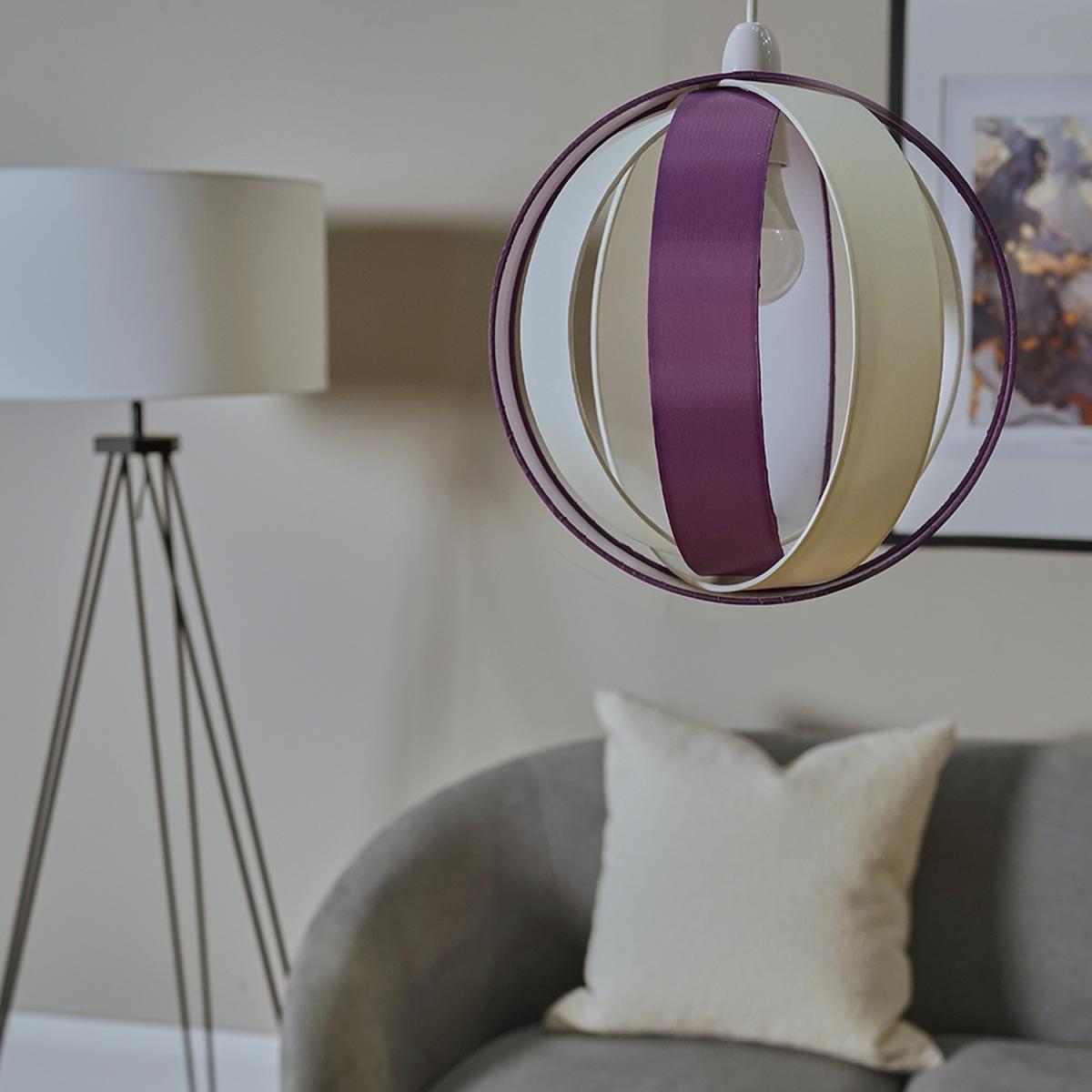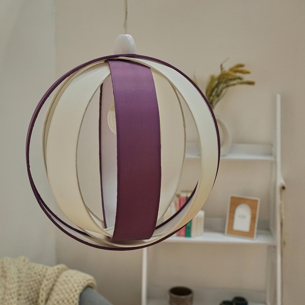 Modern ceiling pendant light shade in a purple and cream fabric design. Features a series of four circular layers which form an unusual cocoon effect. Easily fits to your standard ceiling light socket - no wiring required. Please Note Some self-assembly is required. Four circular sections of the shade need to be spread out in to a globe shape once fitted on to the lampholder. A non electric ceiling pendant shade is a quick and economical way to update your room in seconds! 1 x 60w BC B22 GLS Bulb Required - Not Supplied