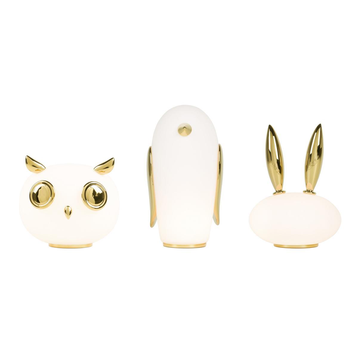 A jovial, fun and elegant mood is in the air with Moooi. Created by Marcel Wanders, this pretty series of table lamps is available in three different forms: a penguin (Noot Noot), an owl (Uhuh) and a rabbit (Purr). Although each of these lamps has its own character, they all have delicate and rounded lines, perfect for providing a little softness to your interior. Made from frosted glass, these wonderful table lamps are decorated with gold-plated ceramic details. These little golden touches grant them an incredible elegance, combining perfectly with their warm and endearing design. PLEASE NOTE. The temperature may be high after prolonged use: must not be handled by young children.