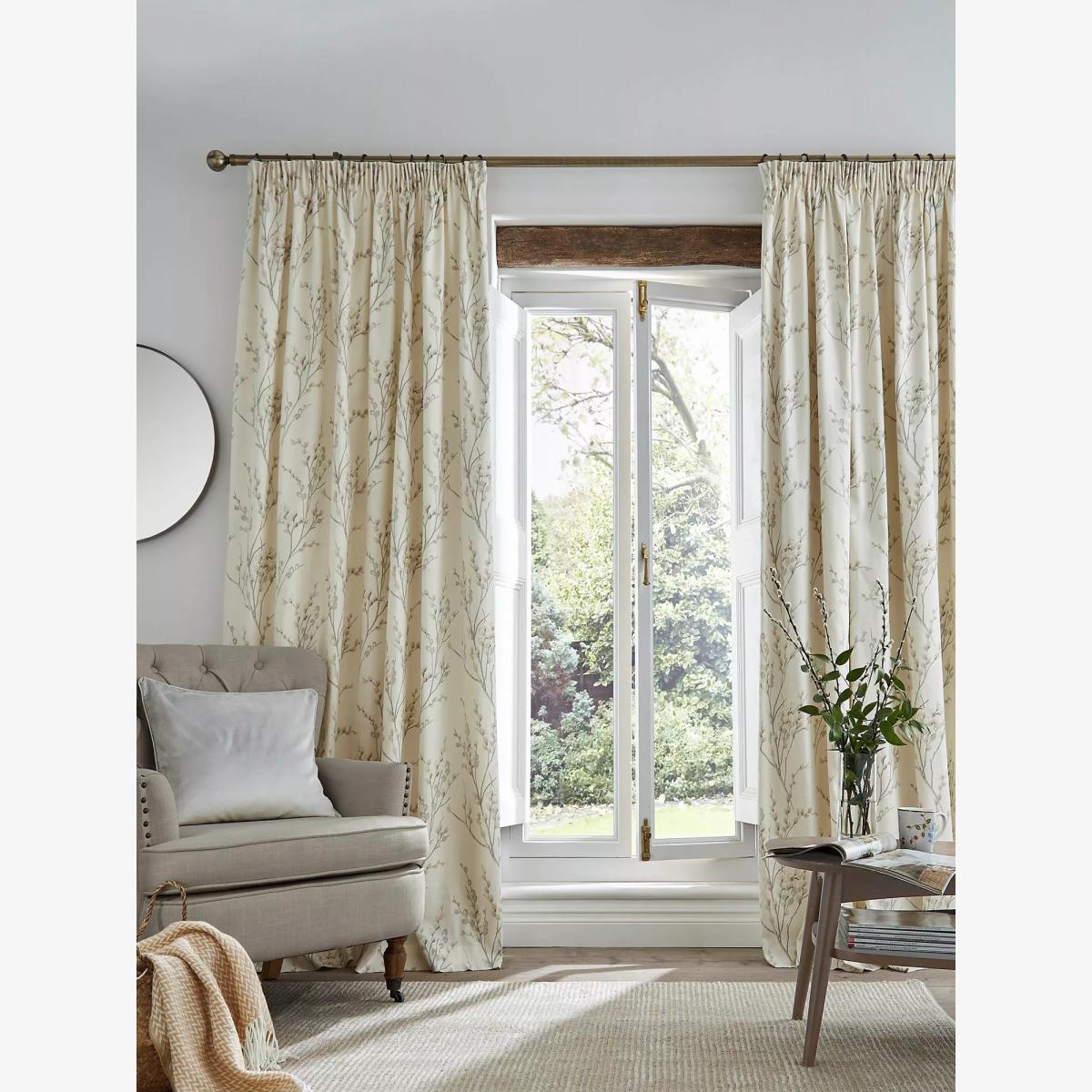 The elegant Laura Ashley Pussy Willow print is inviting in dove grey. Delicate branches of budding pussy willow sprawl across these 100% cotton curtains. Fully lined and with a pencil pleat header to instantly enhance your interiors.