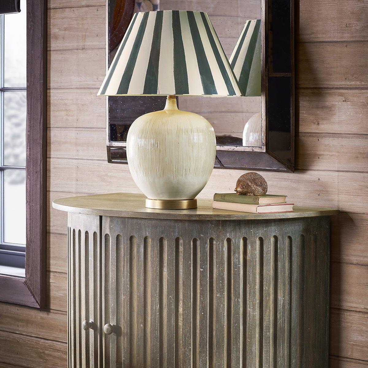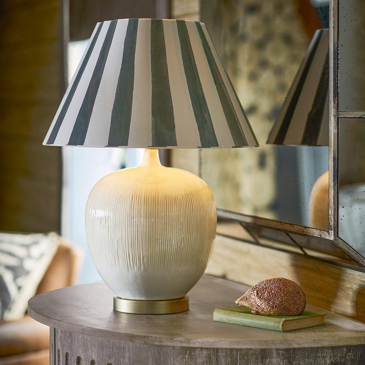 An impressive handmade ceramic lamp with a beautiful cream glaze, we called this piece the Pyaaz (which means onion in Hindi) due to the linear detailing scored into the bulb-shaped clay silhouette. We recommend a 35-45cm shade for use with this lamp. Pyaaz Lamp - Cream