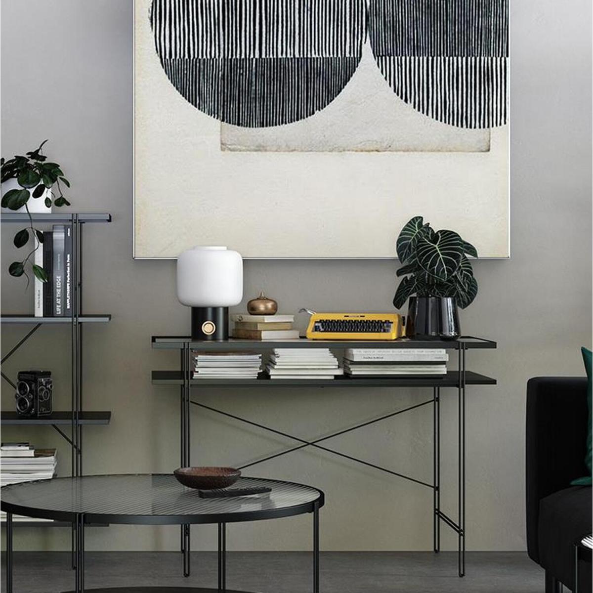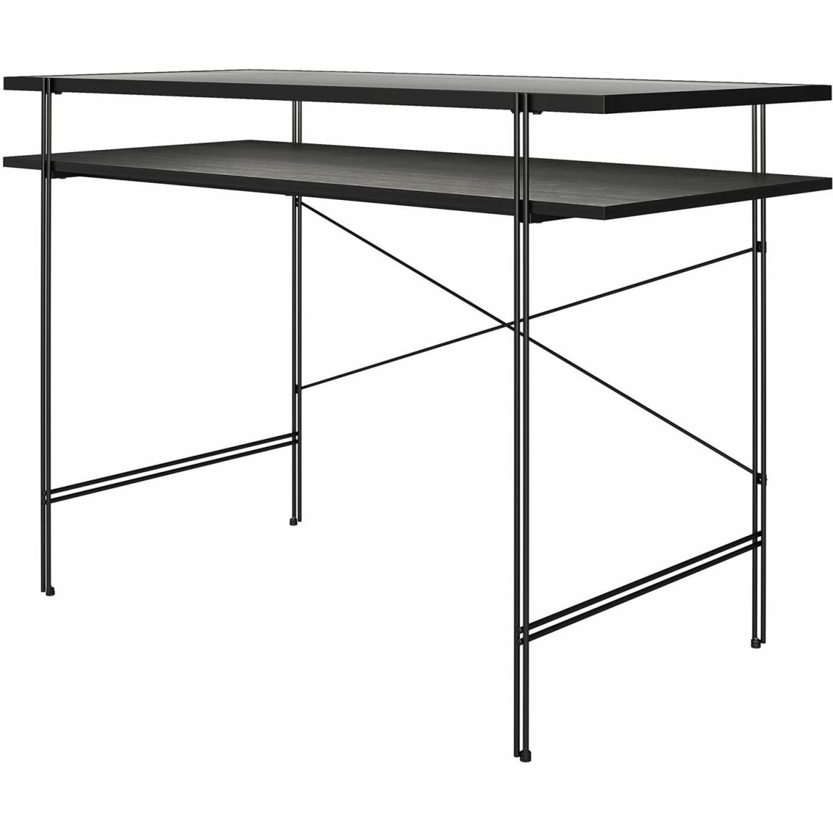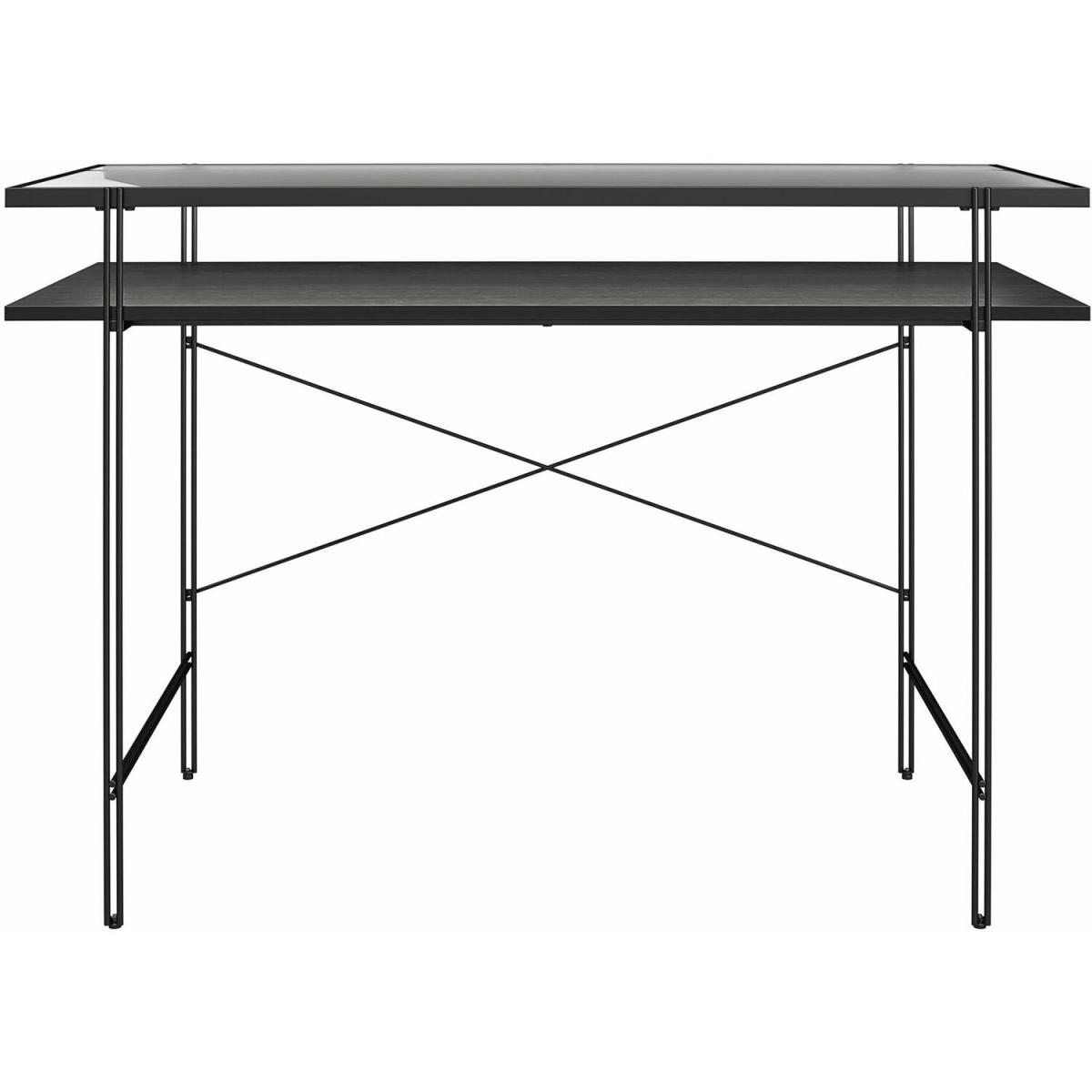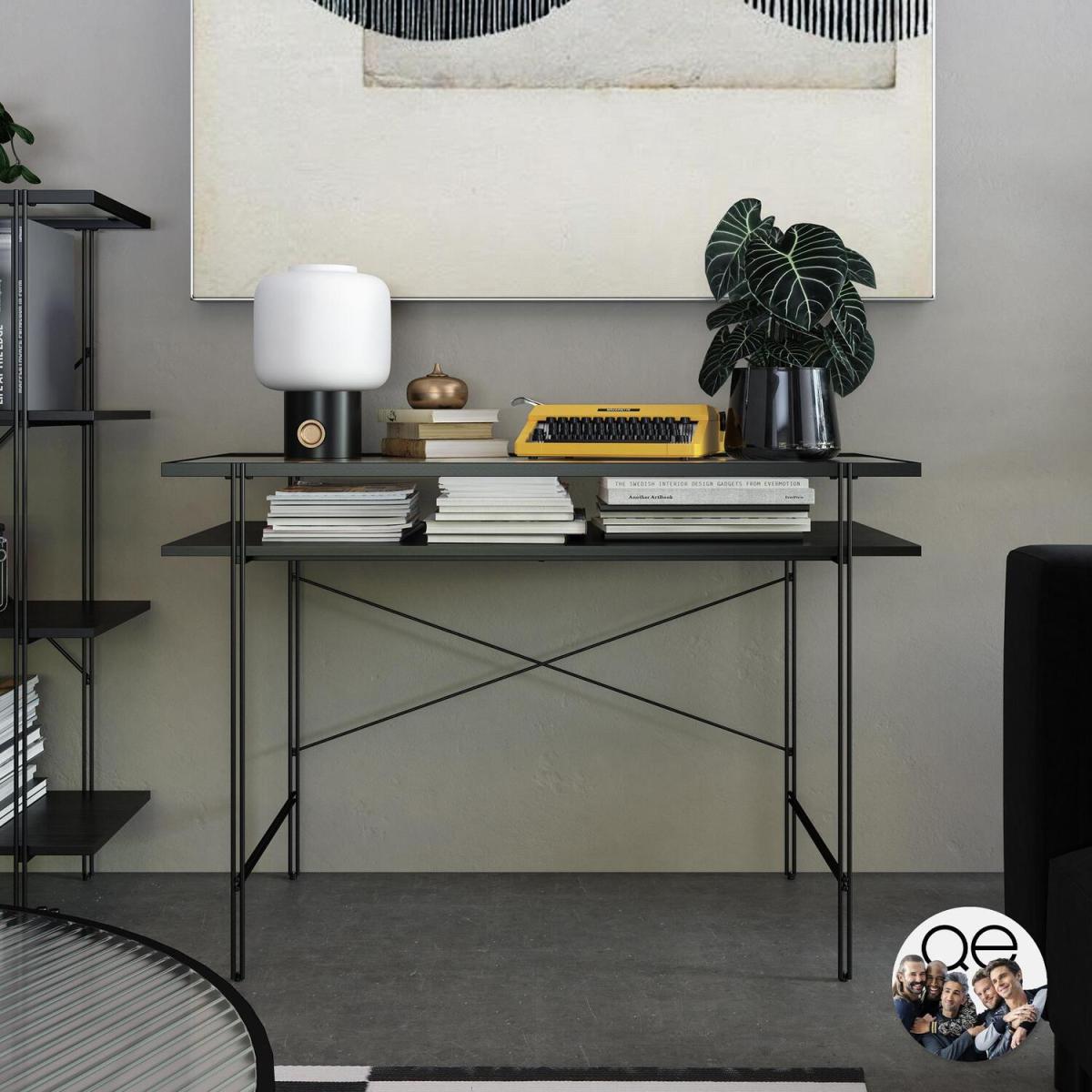 I’m a fan of this Wainwright desk for its slim profile and dark oak top, which suits modern, Scandi-inspired or industrial interiors. The raised shelf is practical for positioning a monitor at eye level, while the lower tier keeps your keyboard or notebooks neatly tucked away. To style, keep accessories minimal: a slim desk lamp in matt black, a small potted plant and a single framed print resting against the wall. Use a simple wire tray or box on the lower tier to organise papers and maintain a clear work surface.
