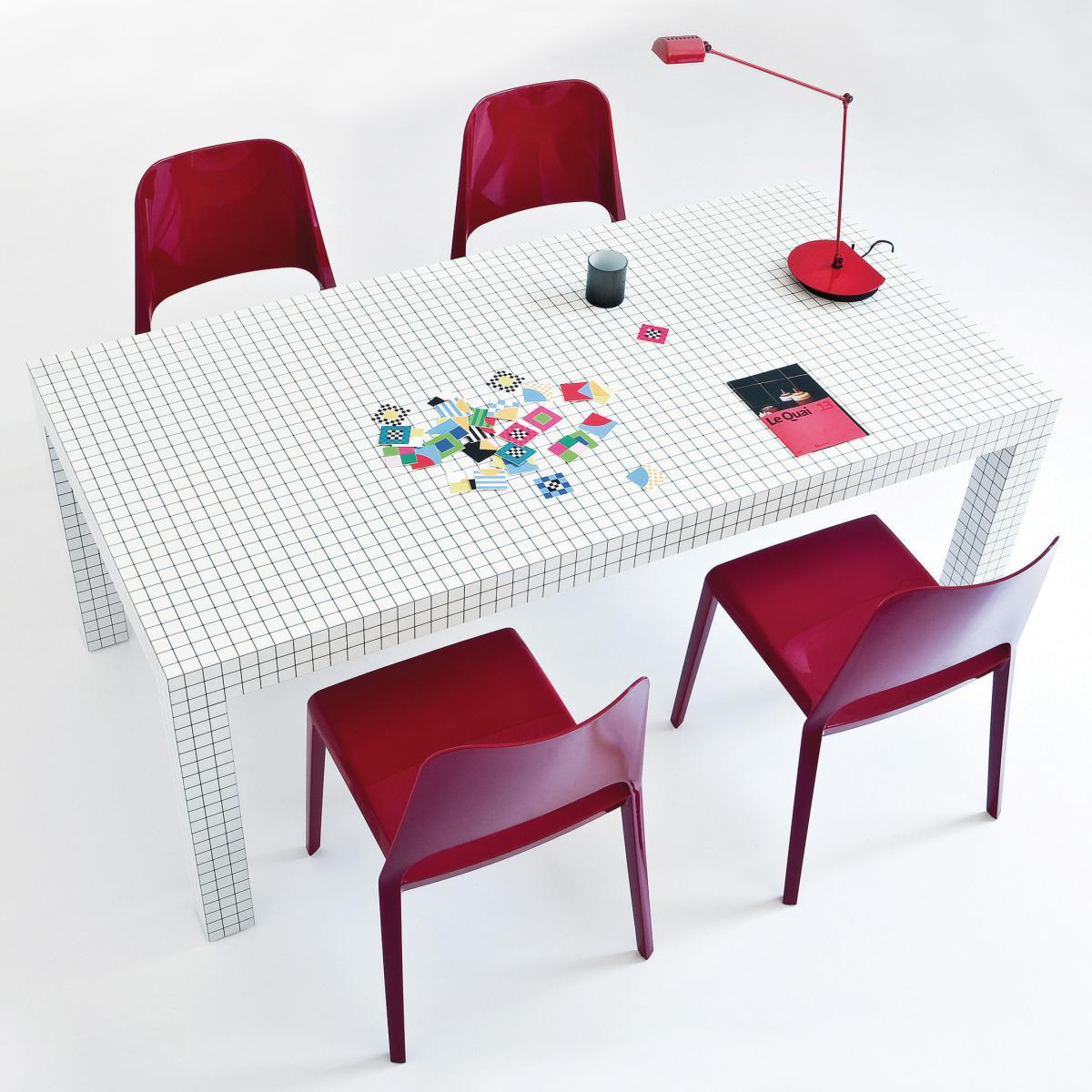 The Quaderna table’s bold, grid-like design makes it a standout piece that works particularly well in modern or minimalist interiors, adding graphic interest without overwhelming the space. Its clean lines and geometric form give it a versatile appeal, suitable for contemporary homes, creative offices, or even eclectic dining areas. When styling, consider pairing it with simple, solid-colour chairs to balance the visual impact, or mix with patterned accessories for a playful edge. Practical tips include keeping surface clutter to a minimum to appreciate its distinctive pattern and using statement lighting, like the red desk lamp, to enhance the overall aesthetics. This table’s striking design encourages functional yet stylish use, making it both a practical and eye-catching addition year-round.