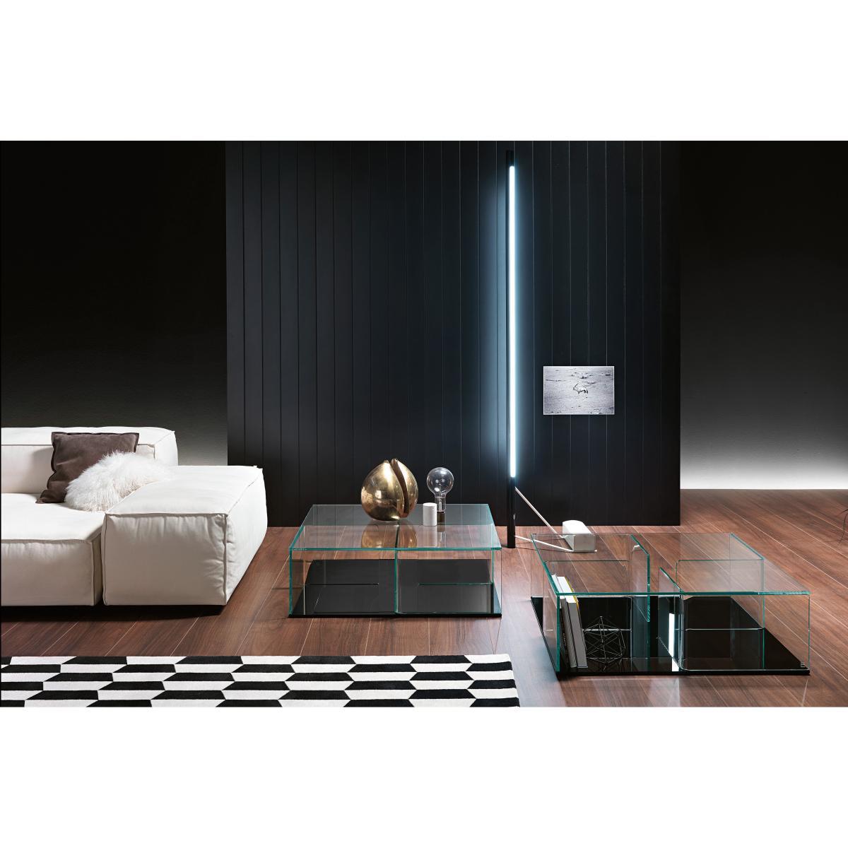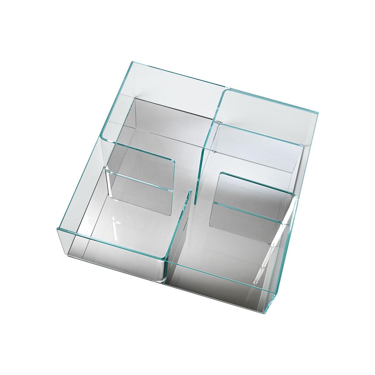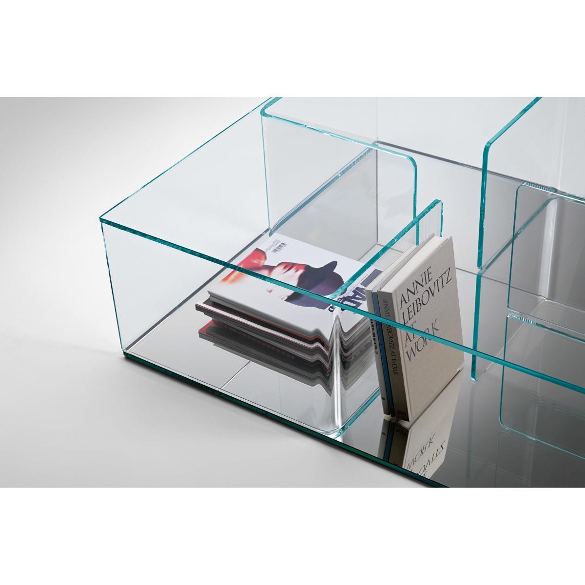 Coffee table/storage unit composed of 4 elements in curved glass (10 mm) mounted between two glass racks (10 mm). Top and partitions in extralight glass, bases available in extralight mirrored glass or black glass.