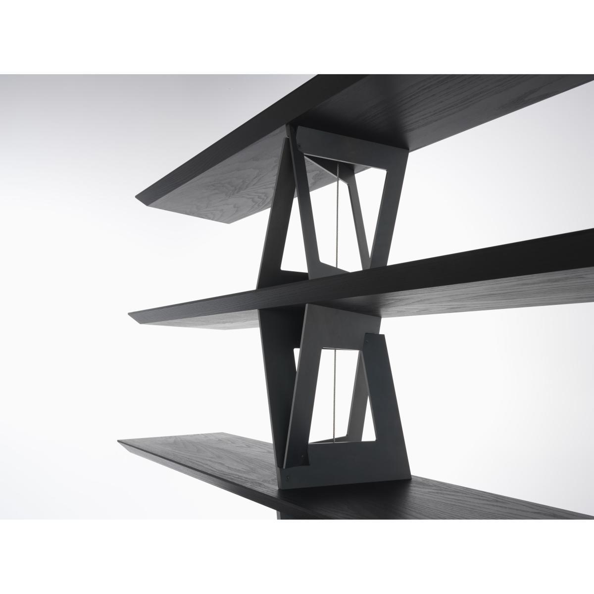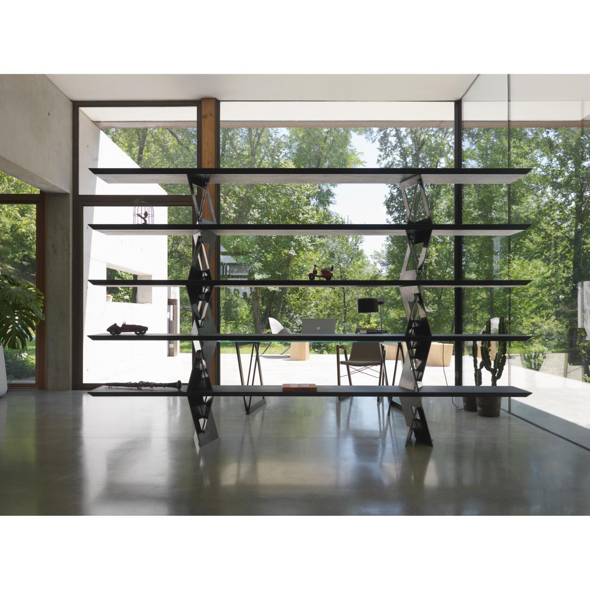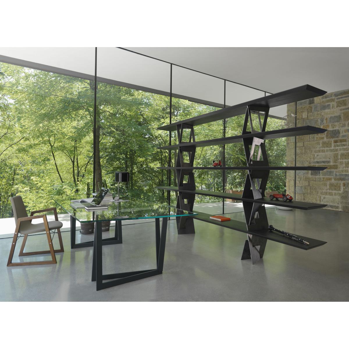 When design becomes a work of art. This bookcase with an intense and unique form embodies all the distinctive elements of the collection of the same name. The upward progression of the ashwood shelves is dynamically accompanied by ever lighter metal elements that “metaphorically” lead the eye towards the sky and give the structure a “solidly light” aspect.