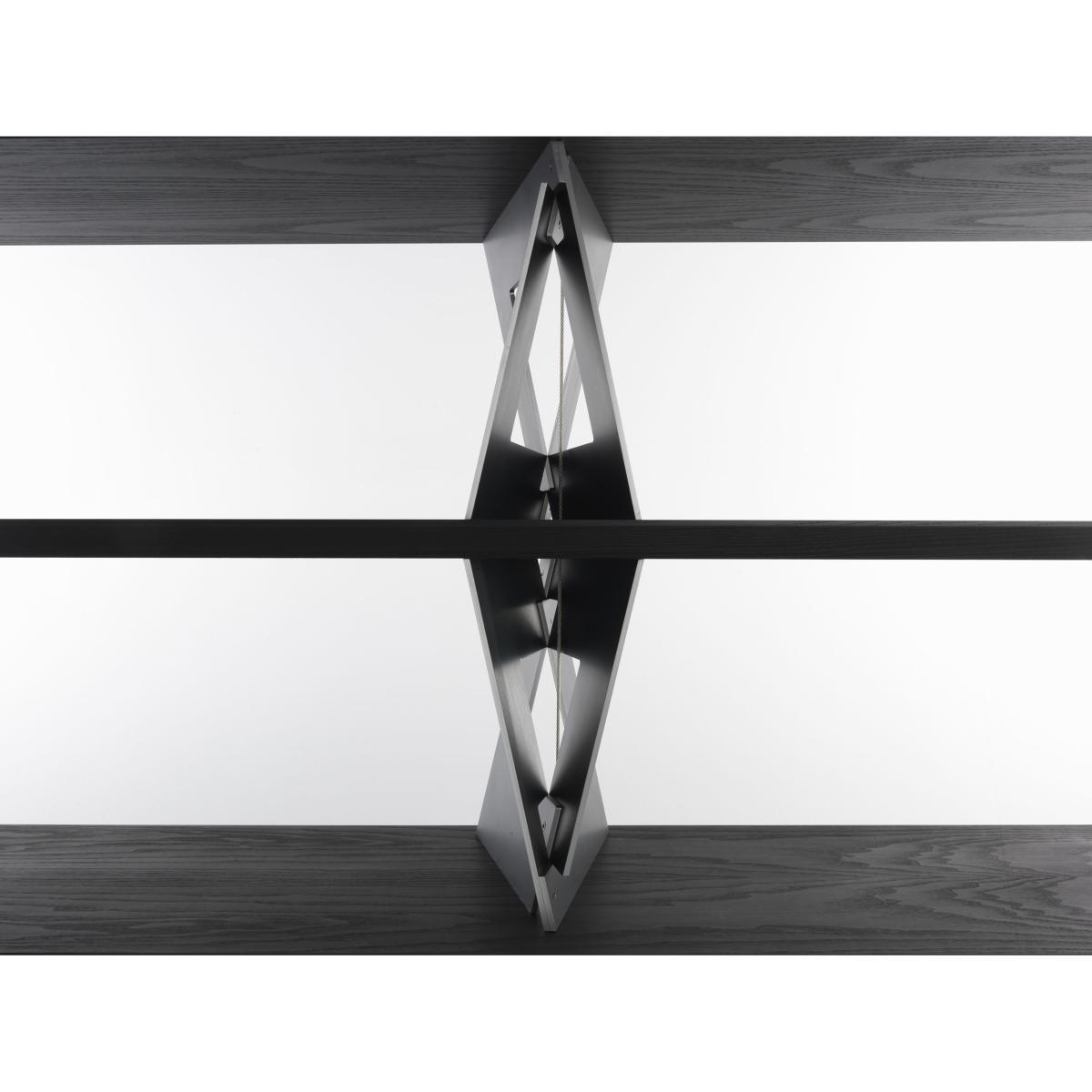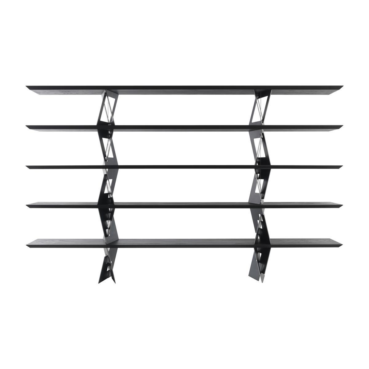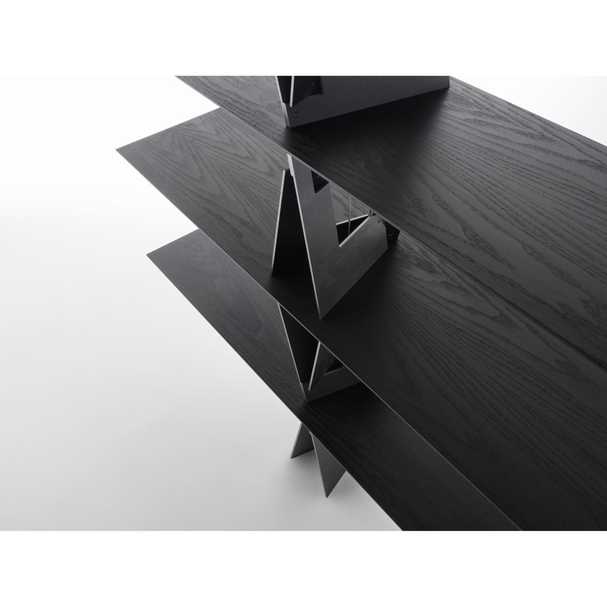 When design becomes a work of art. This bookcase with an intense and unique form embodies all the distinctive elements of the collection of the same name. The upward progression of the ashwood shelves is dynamically accompanied by ever lighter metal elements that “metaphorically” lead the eye towards the sky and give the structure a “solidly light” aspect.