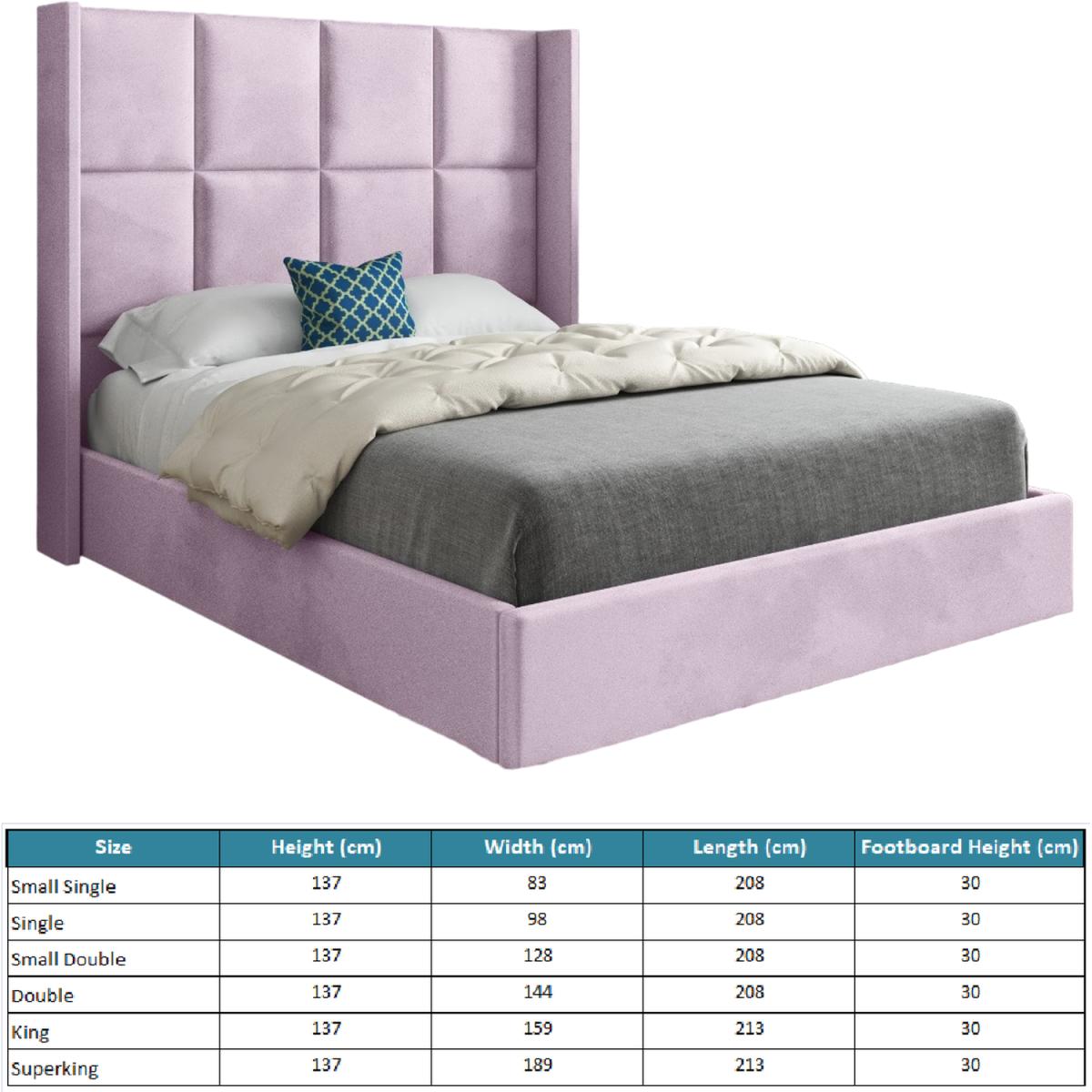 This bed features a modern panelled cube look. Its sleek style is a fabulous choice. The 7 inch protruding wings on this tall headboard with a low foot deliver a commanding presence. The bed speaks volumes in design and versatile choice for most interiors. The grid like design provides optical satisfaction as well as being effortlessly comfortable. The Quanta has a solid slatted base for robust quality and longevity.