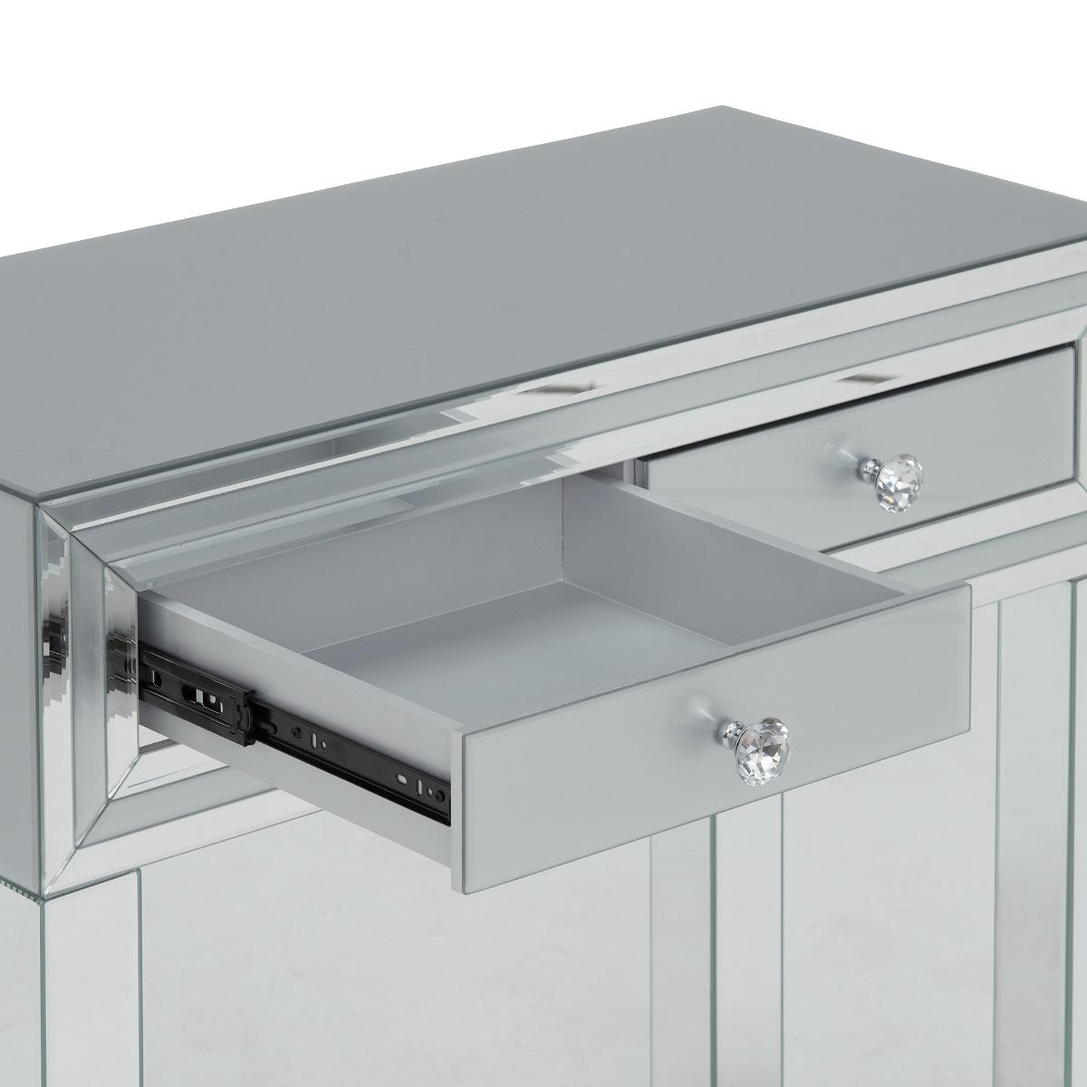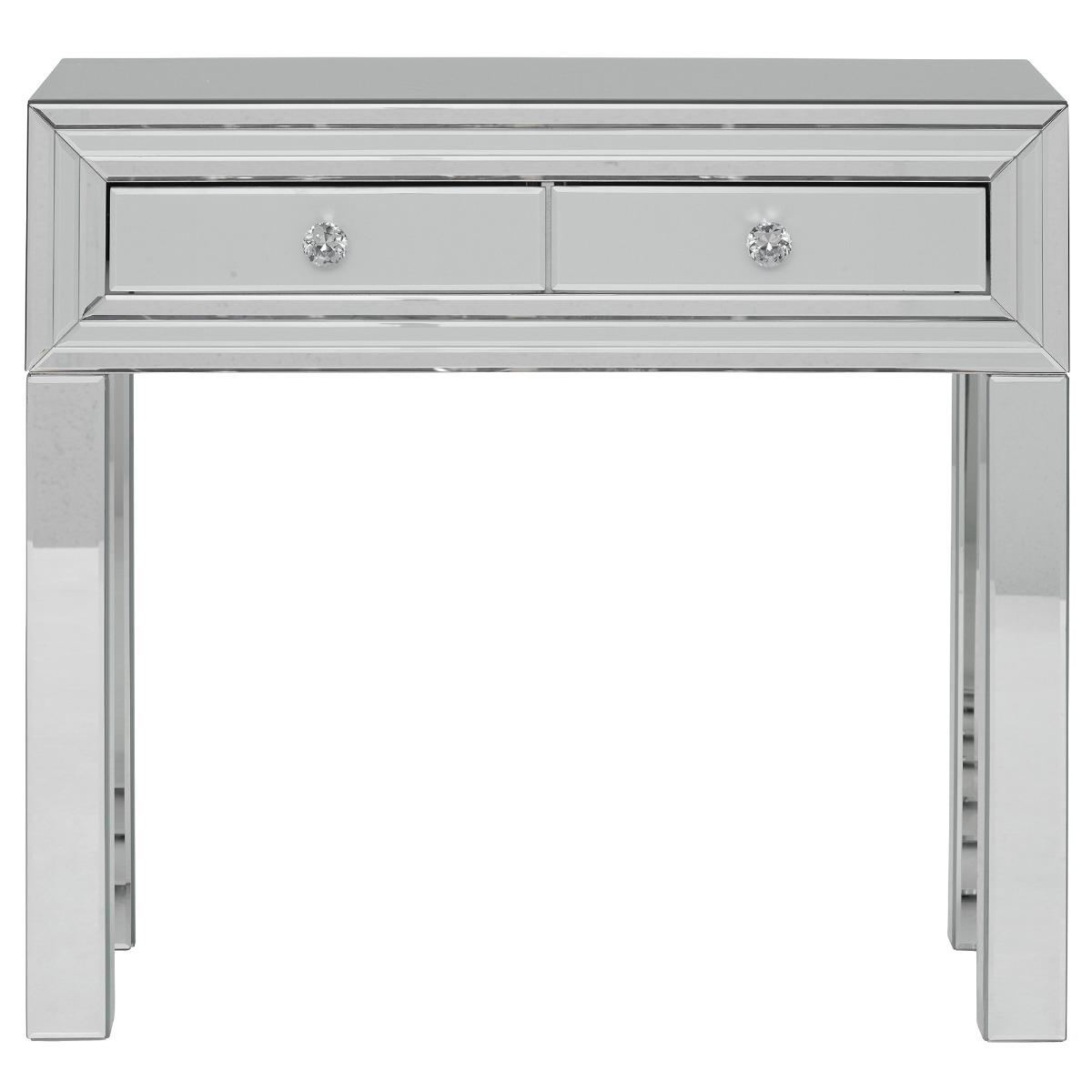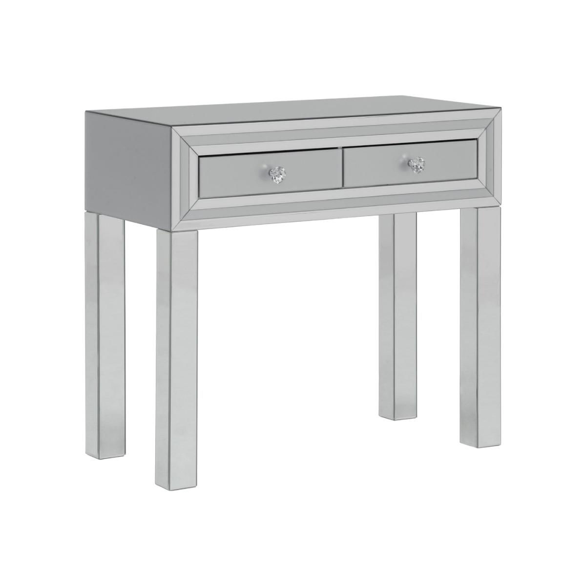 Design. Practical and providing optimum comfort, the Quartz 2 Drawer Dressing Table features sliding drawers for ease and a cut-out seating space. Grey glass and mirrored inlays give a stylish and elegant look that will make any modern bedroom feels sophisticated. Squared mirror legs are a stunning feature which are complimented by crystal style handles that complete this elegant piece. Pair with the Quartz Dressing Table Stool for a paired together look.
