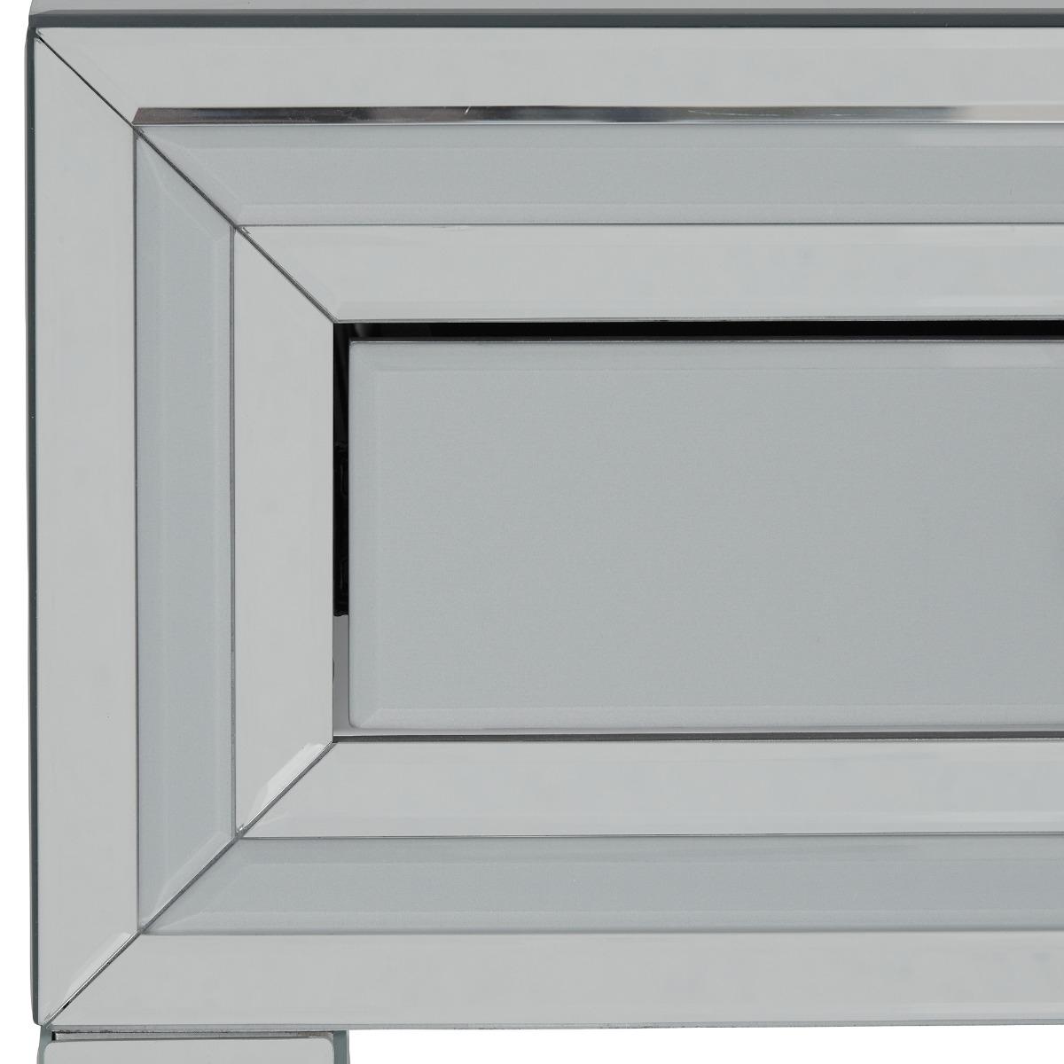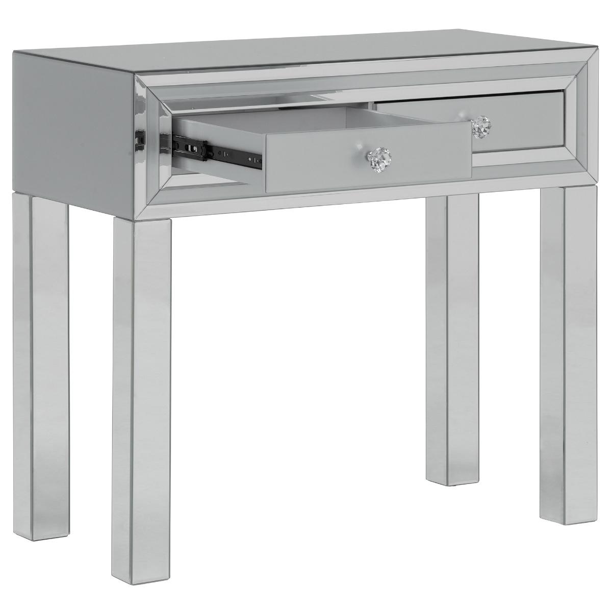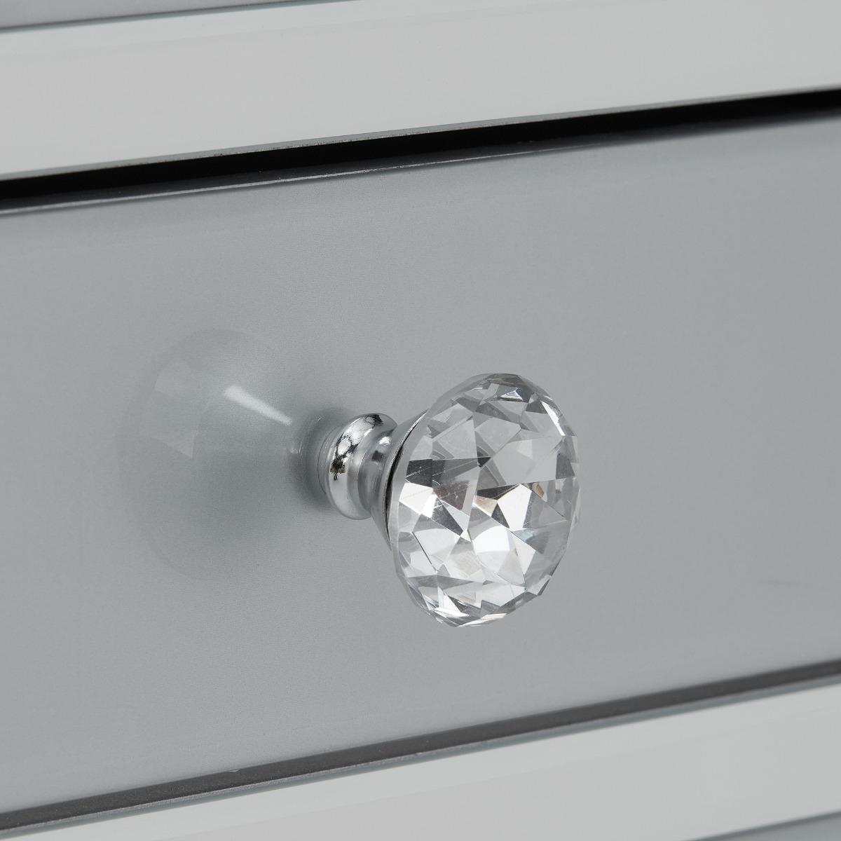Design. Practical and providing optimum comfort, the Quartz 2 Drawer Dressing Table features sliding drawers for ease and a cut-out seating space. Grey glass and mirrored inlays give a stylish and elegant look that will make any modern bedroom feels sophisticated. Squared mirror legs are a stunning feature which are complimented by crystal style handles that complete this elegant piece. Pair with the Quartz Dressing Table Stool for a paired together look.