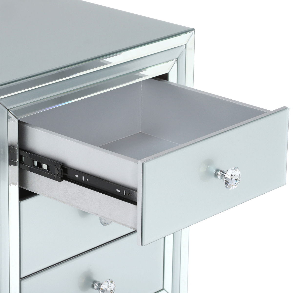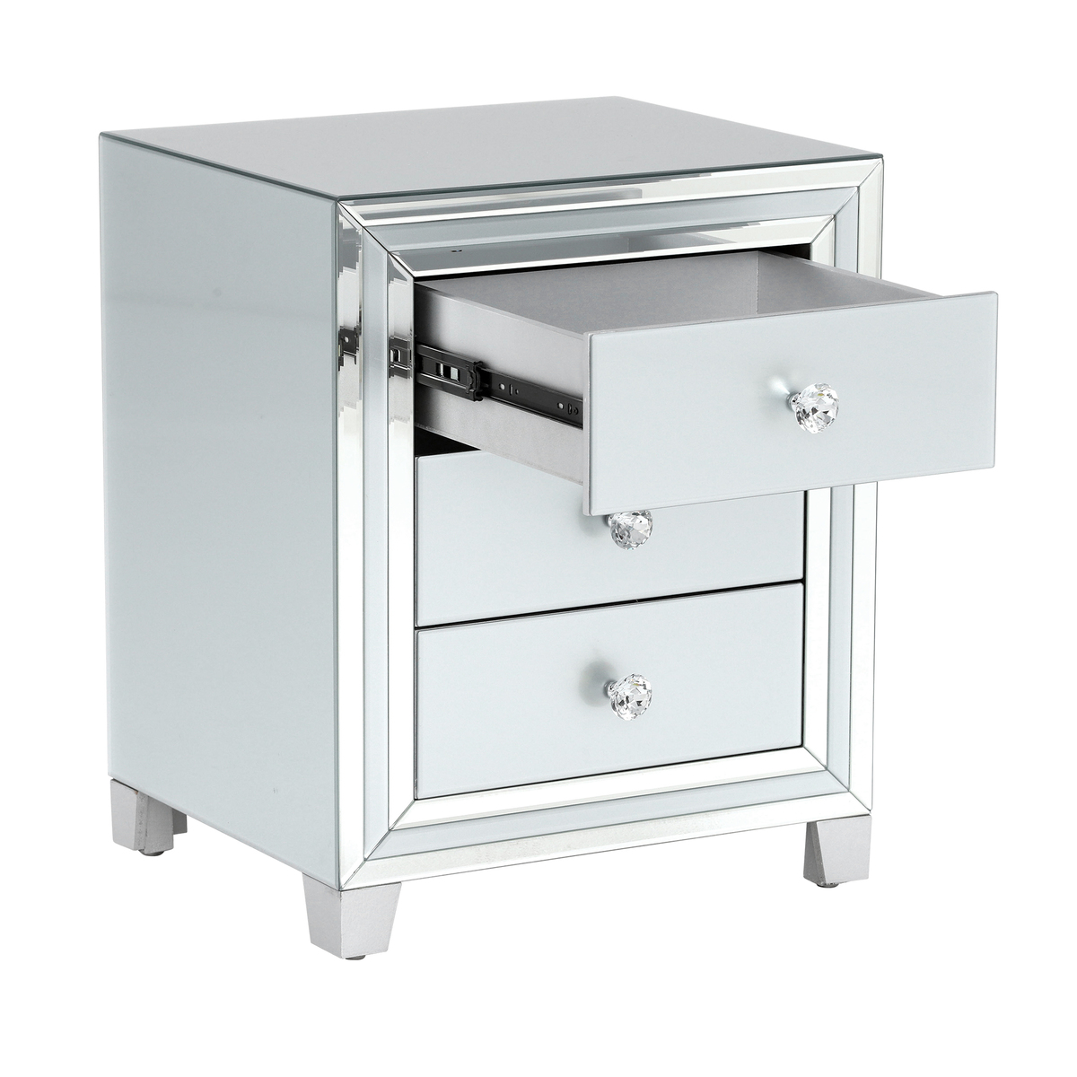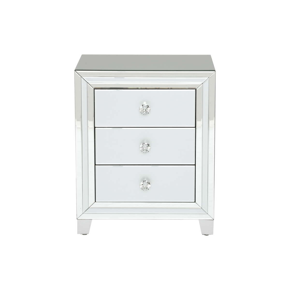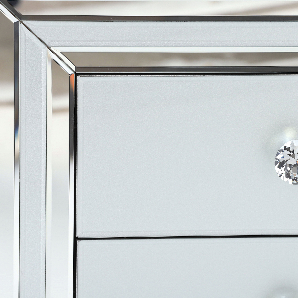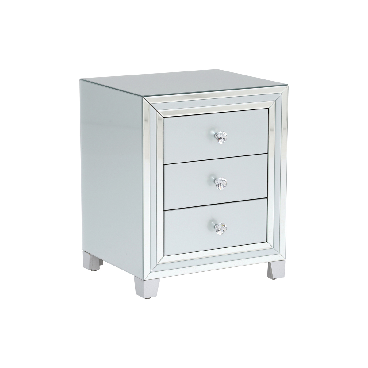 Style meets storage, the Quartz 3 drawer bedside table features a modern grey glass finish that complements a wide range of colour schemes. Glamorous crystal handles add a decadent touch, while the mirrored border lends a beautifully reflective look to the front. With clean, contemporary lines reminiscent of a diamond, this grey bedside table is a stunning example of functional art. Its three drawers will assist in decluttering your bedroom for a restful night’s sleep, with all of your essentials close at hand. Place a lamp on top to really show off its glossy finish.