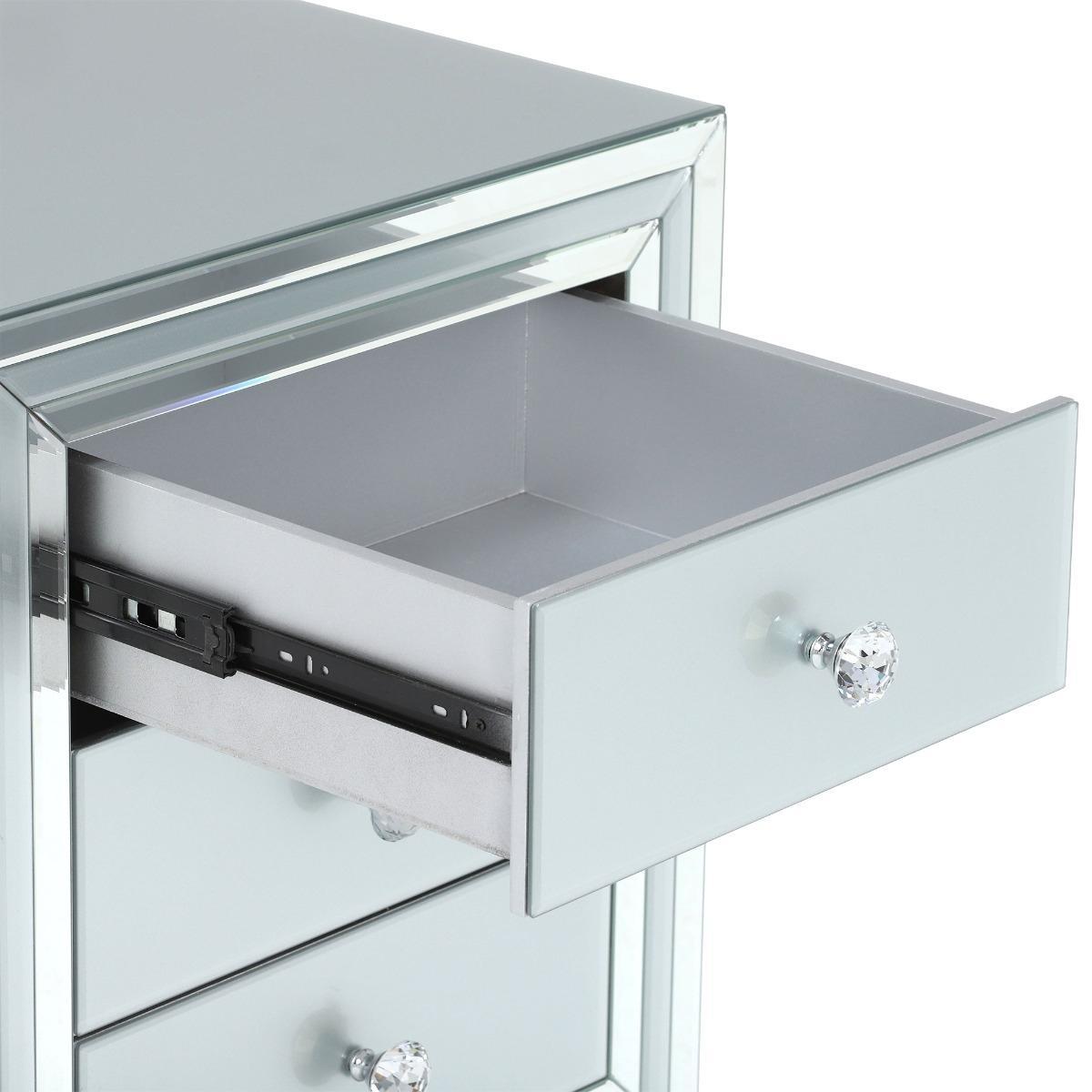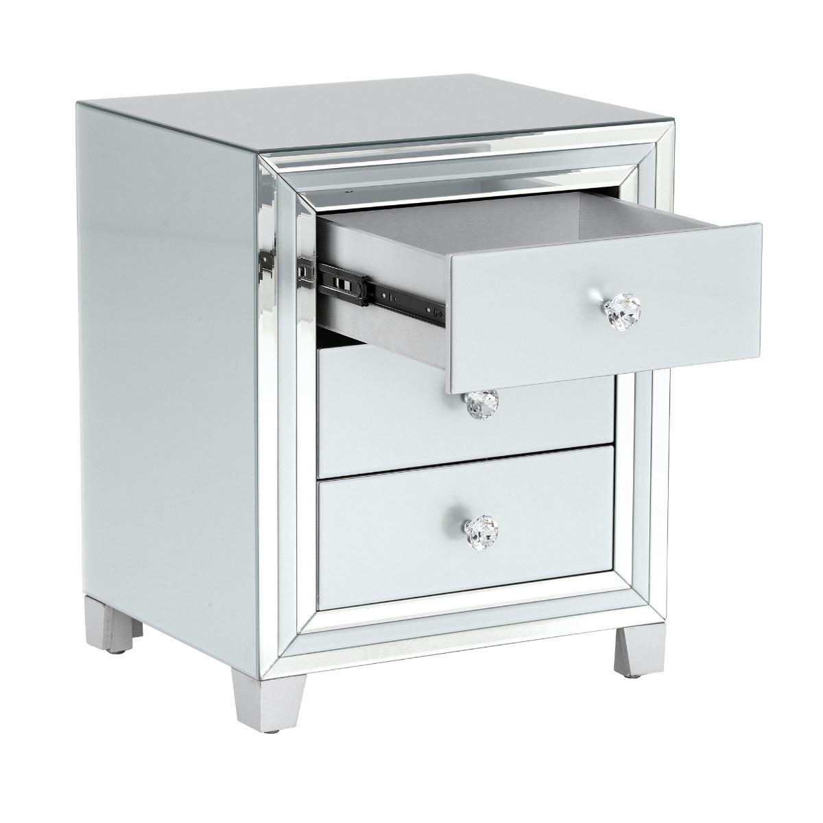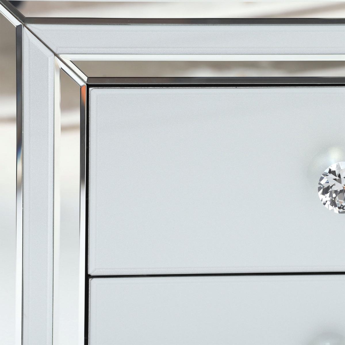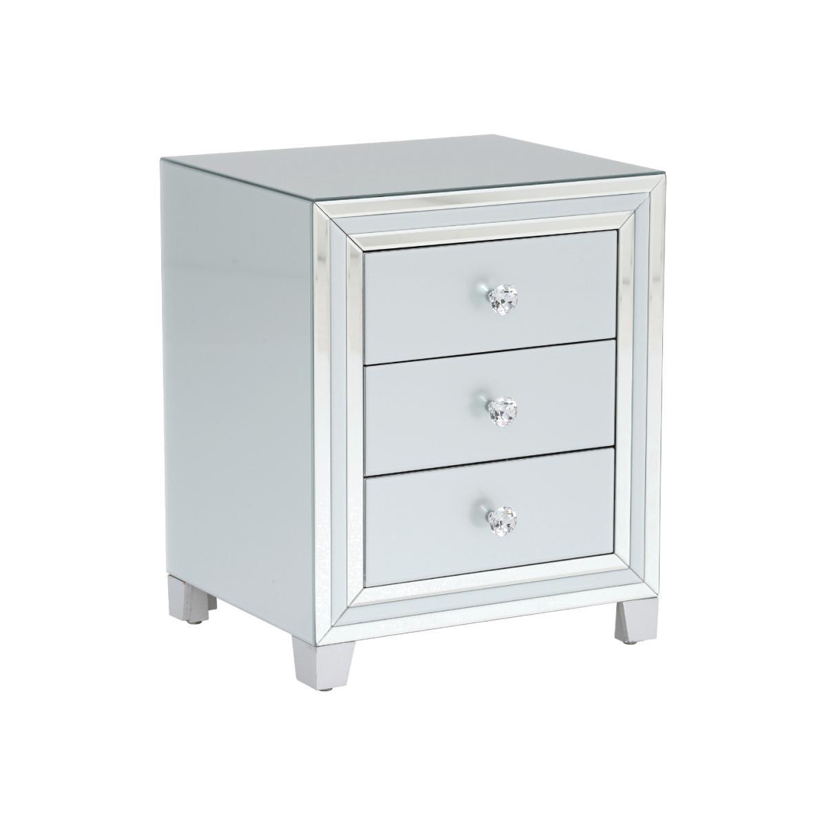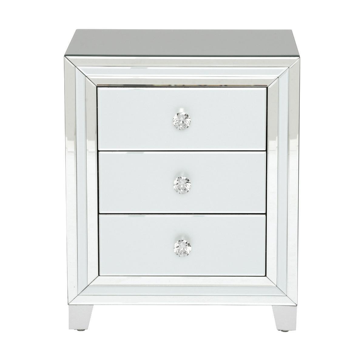 Design. Style meets storage, the Quartz 3 drawer bedside table features a modern grey glass finish that complements a wide range of colour schemes. Glamorous crystal handles add a decadent touch, while the mirrored border lends a beautifully reflective look to the front. With clean, contemporary lines reminiscent of a diamond, this grey bedside table is a stunning example of functional art. Its three drawers will assist in decluttering your bedroom for a restful night’s sleep, with all of your essentials close at hand. Place a lamp on top to really show off its glossy finish.