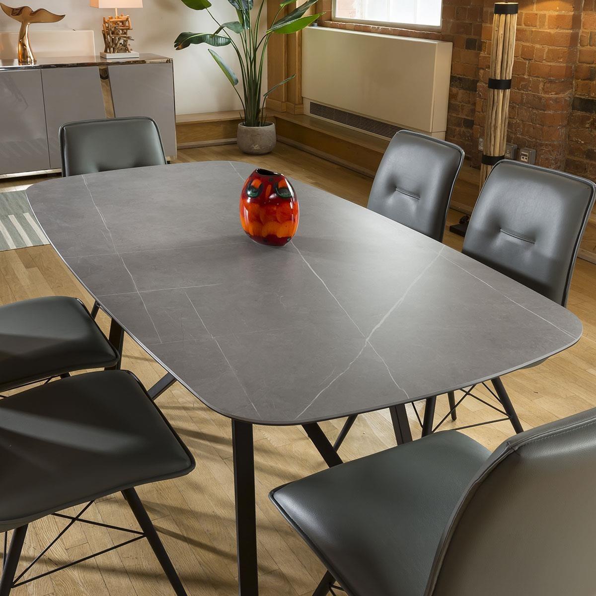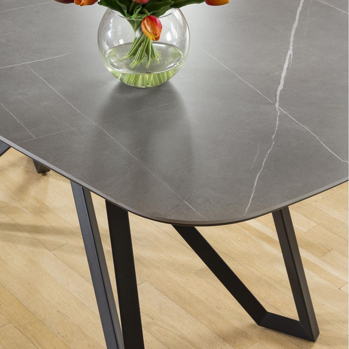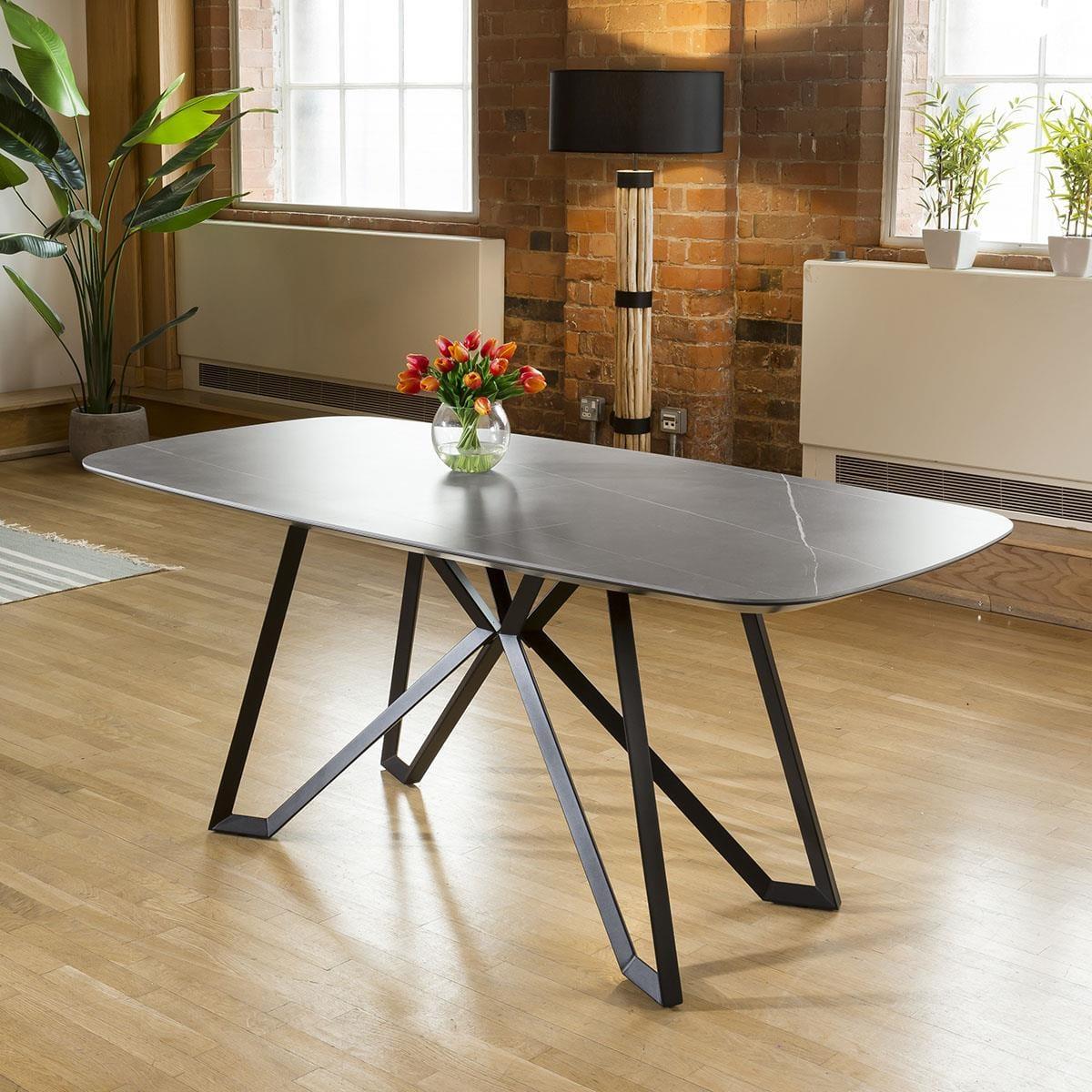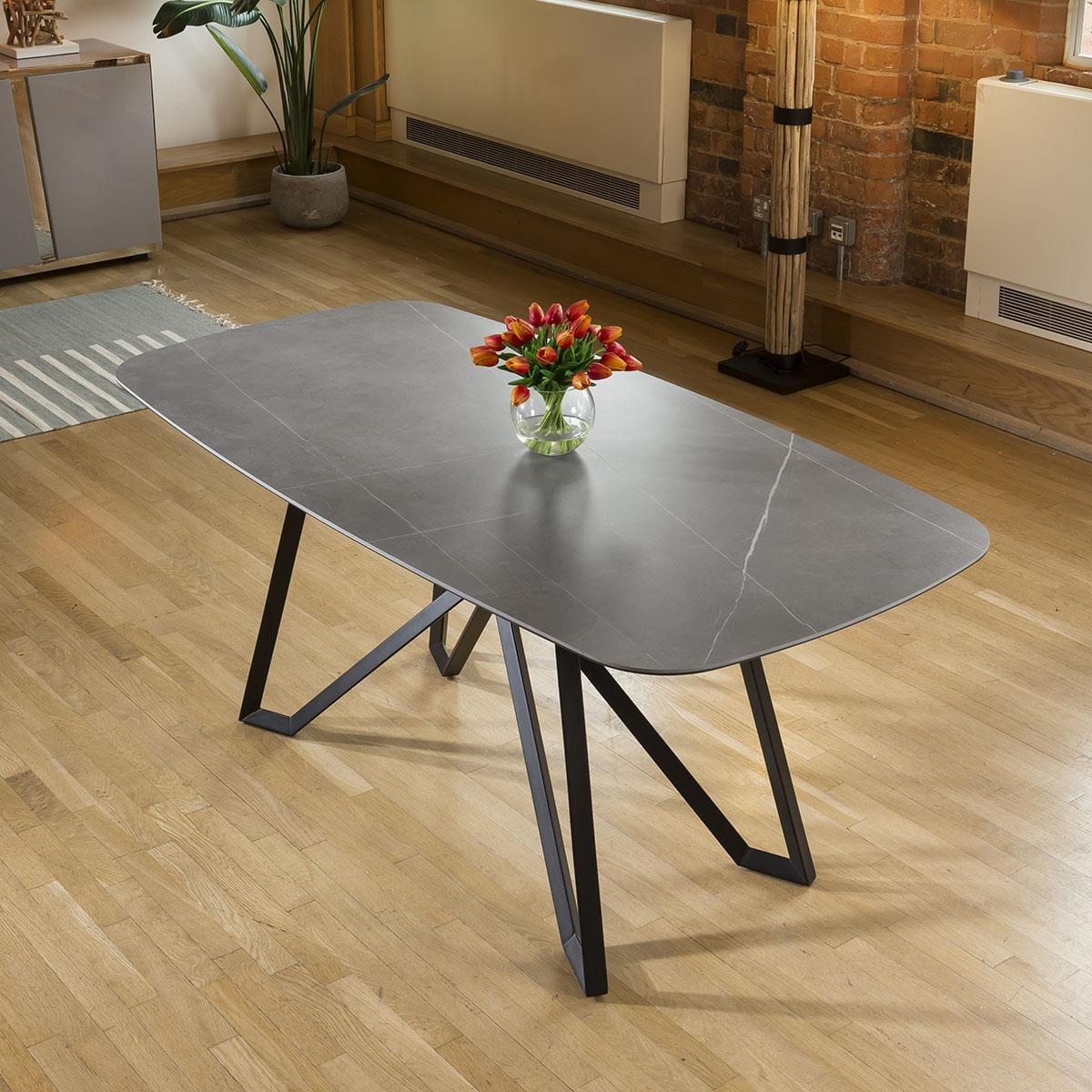 A stunning rectangular dining table in slate coloured ceramic with rounded corners. The top is a one piece ceramic plate of 12mm thick ceramic, very beautiful and very durable too. The legs are a made from steel for strength and black powder coated giving this table an all round appeal. Quatropi Premium Dining tables are among the highest quality designer tables in the world, with a wide choice of in-stock and made to order options. Our tables come in many forms including; round, oval, glass, marble effect, ceramic, concrete, solid oak, as well as wooden veneers in a chosen finish. Choose your size; from small, large, to extra large when extended with our extendable options that include extension leaves and folding mechanisms. Get the family together with our large 12 seater, 8 seater, and 6 seater dining sets with a large choice of dining chairs available, or for smaller dining rooms our 4 seater dining table and chair sets are the perfect choice! If you need more information about this product, use the Live Chat service to speak to the team or send us a message. Spread the cost our with interest-free finance options. Minimum spend applies. W178cm D89cm H75cm Modern Design Premium Quality Furniture