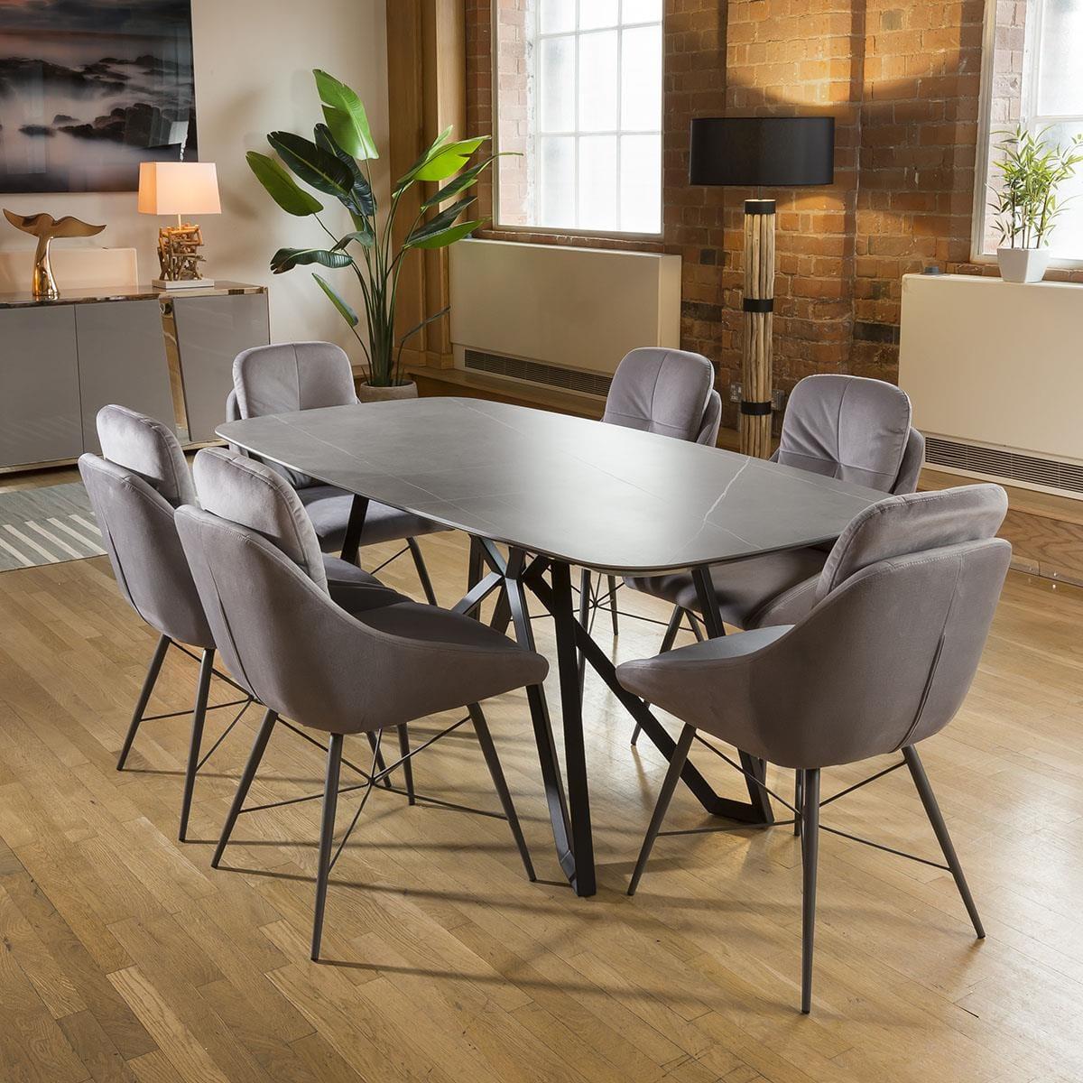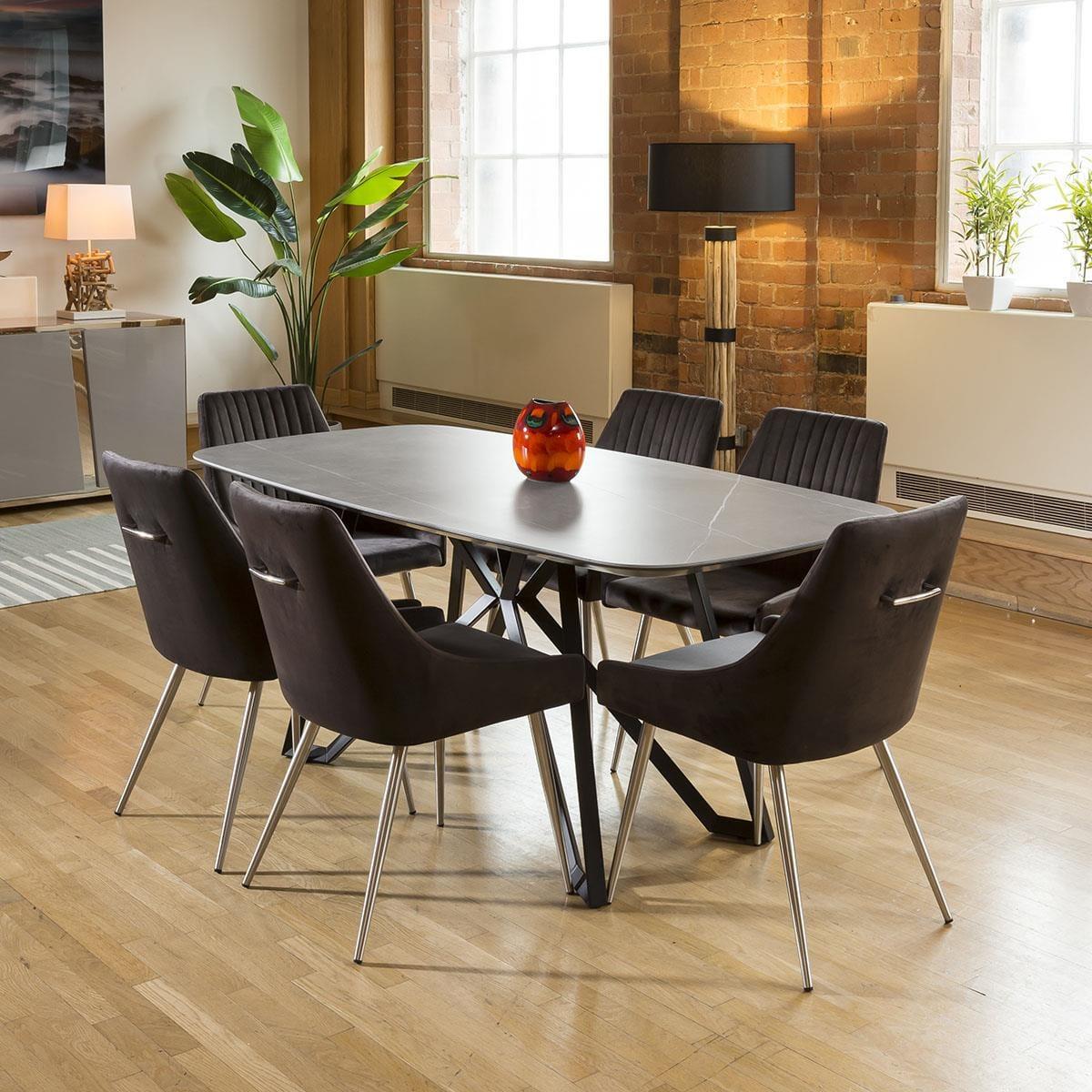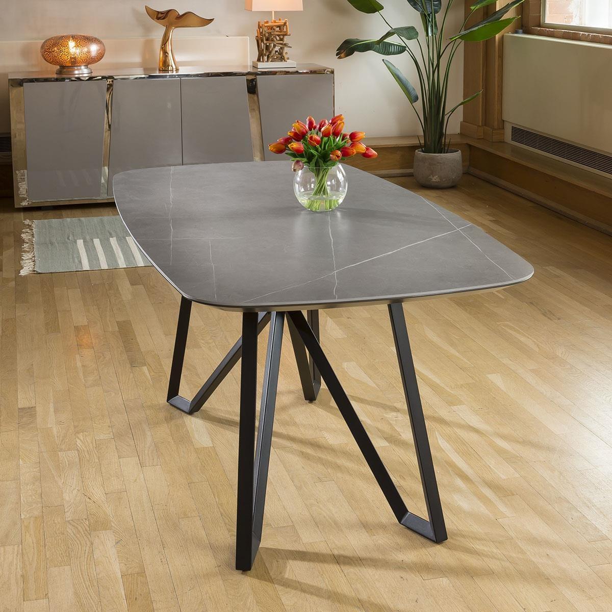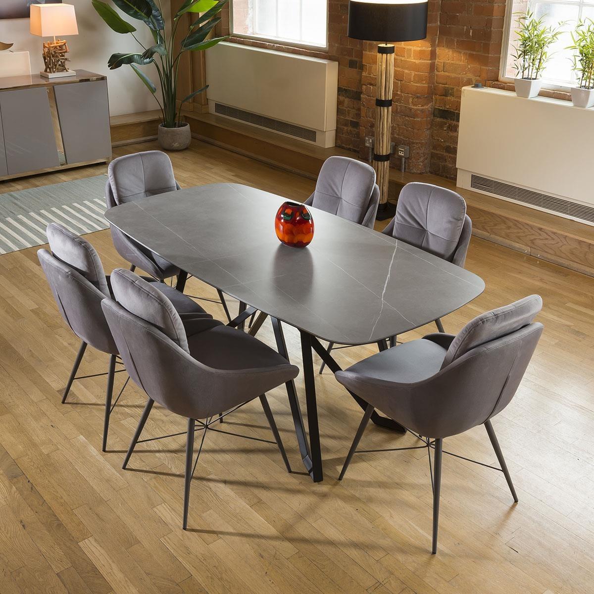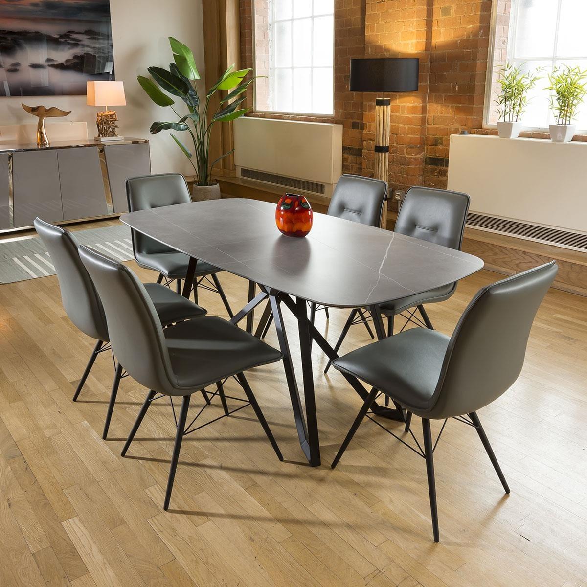 A stunning rectangular dining table in slate coloured ceramic with rounded corners. The top is a one piece ceramic plate of 12mm thick ceramic, very beautiful and very durable too. The legs are a made from steel for strength and black powder coated giving this table an all round appeal. Quatropi Premium Dining tables are among the highest quality designer tables in the world, with a wide choice of in-stock and made to order options. Our tables come in many forms including; round, oval, glass, marble effect, ceramic, concrete, solid oak, as well as wooden veneers in a chosen finish. Choose your size; from small, large, to extra large when extended with our extendable options that include extension leaves and folding mechanisms. Get the family together with our large 12 seater, 8 seater, and 6 seater dining sets with a large choice of dining chairs available, or for smaller dining rooms our 4 seater dining table and chair sets are the perfect choice! If you need more information about this product, use the Live Chat service to speak to the team or send us a message. Spread the cost our with interest-free finance options. Minimum spend applies. W178cm D89cm H75cm Modern Design Premium Quality Furniture