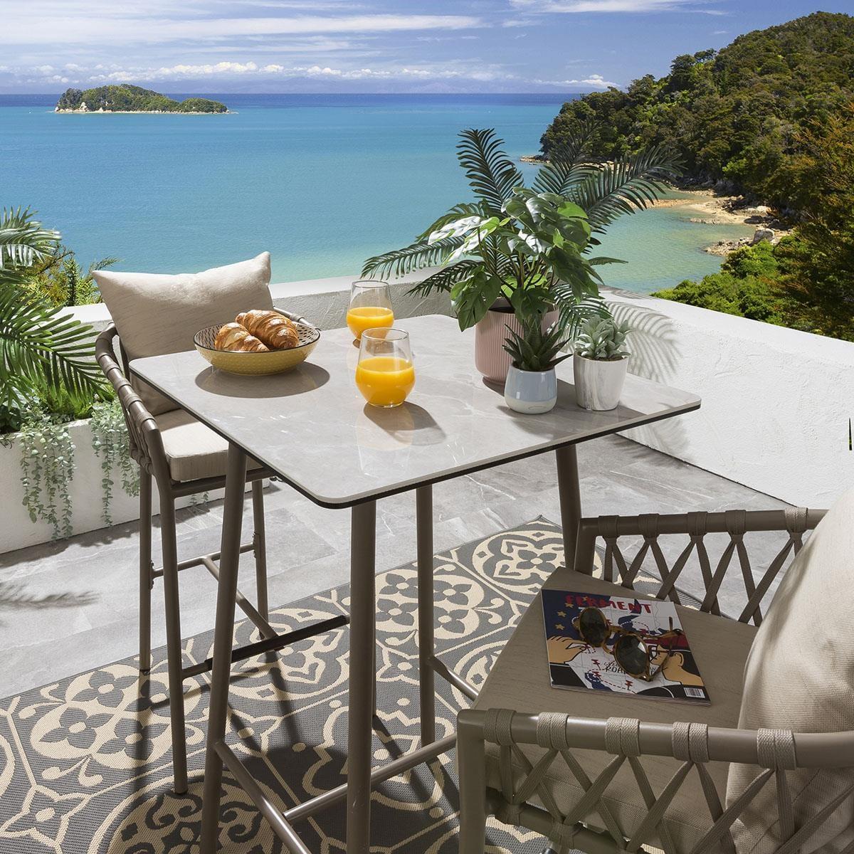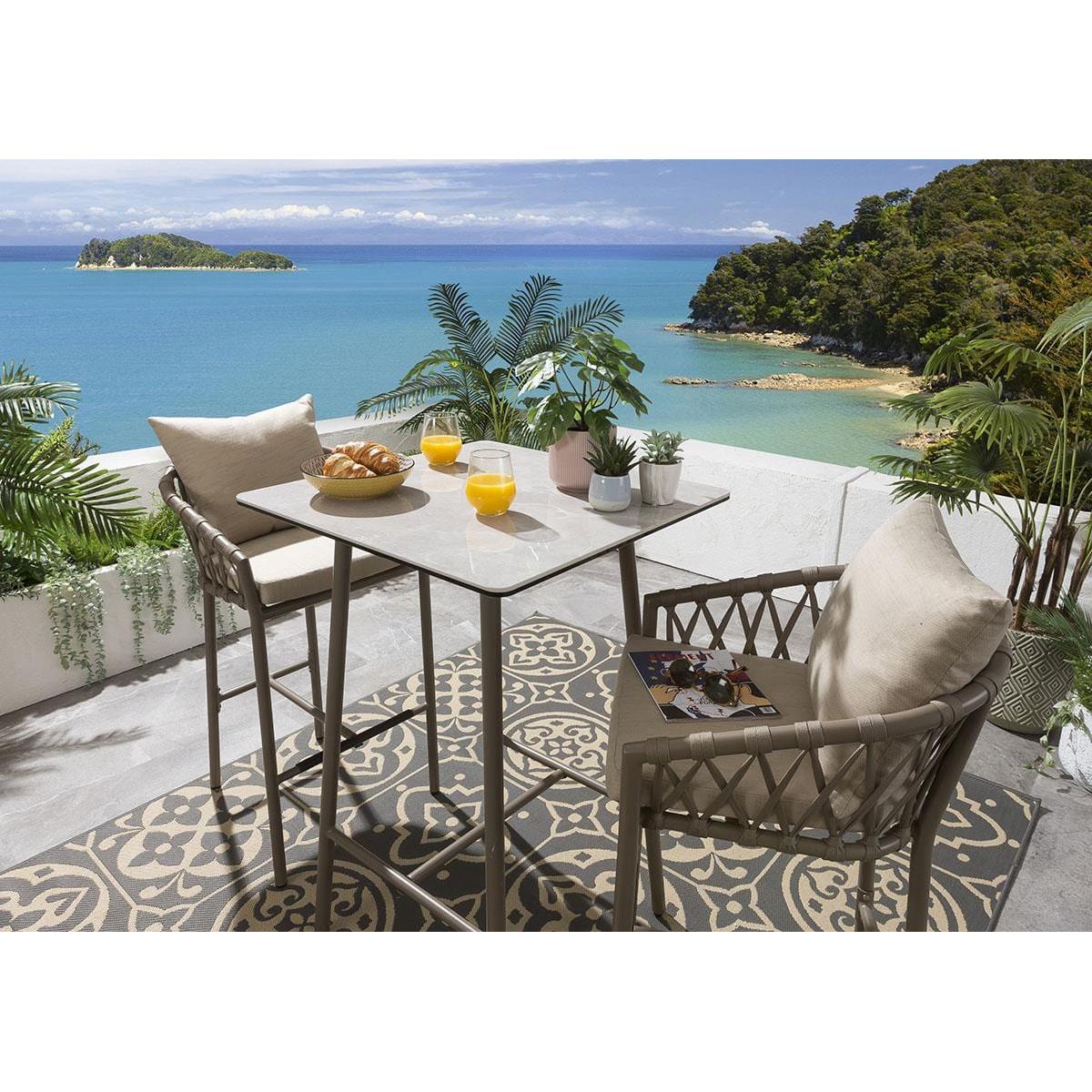 Our hard-wearing and spacious ceramic 70cm square garden high bar table makes a perfect addition to any contemporary, modern or minimalist outdoors, providing enough space for up to four people to enjoy the sunshine in comfort. The 120cm tall bar table is made from robust and ultra-durable ceramic in a natural smooth light grey marble-effect finish, atop a hard-wearing beige aluminium metal frame - which are set to last for years to come. comfortable support that's shower-resistant, but we advise that cushions are stored when not in use. Included in the set; reinvent your outdoor space with these fabulous all-weather beige rope-back garden bar stools. The generously padded outdoor chairs are enhanced by a supportive back cushion for an extra layer of luxurious comfort. Our gorgeous rope back outdoor bar stools will make a stunning addition to your outdoor seating area or patio. The bar stools come complete with our signature luxuriously thick cushioning that offers unbeatable comfort, topped off with rich Beige high-end marine fabric which has amazing resilience to colour fading and damage caused by extreme weather conditions and comes with a free protective winter cover. Aluminium garden furniture requires very little maintenance, making it the perfect choice for fuss-free alfresco dining. You won't need to scrub it or treat it, just an occasional wipe down with warm soapy water and a clean cloth to keep it looking its best. Expertly crafted aluminium frames are highly durable, complemented by clean lines that lend contemporary style. It is robust and weather-resistant for outdoor use & the super cushioned seating offers W70cm D70cm H120cm Durable ceramic marble table top Free beige protective cover included