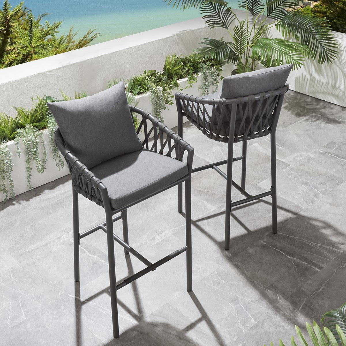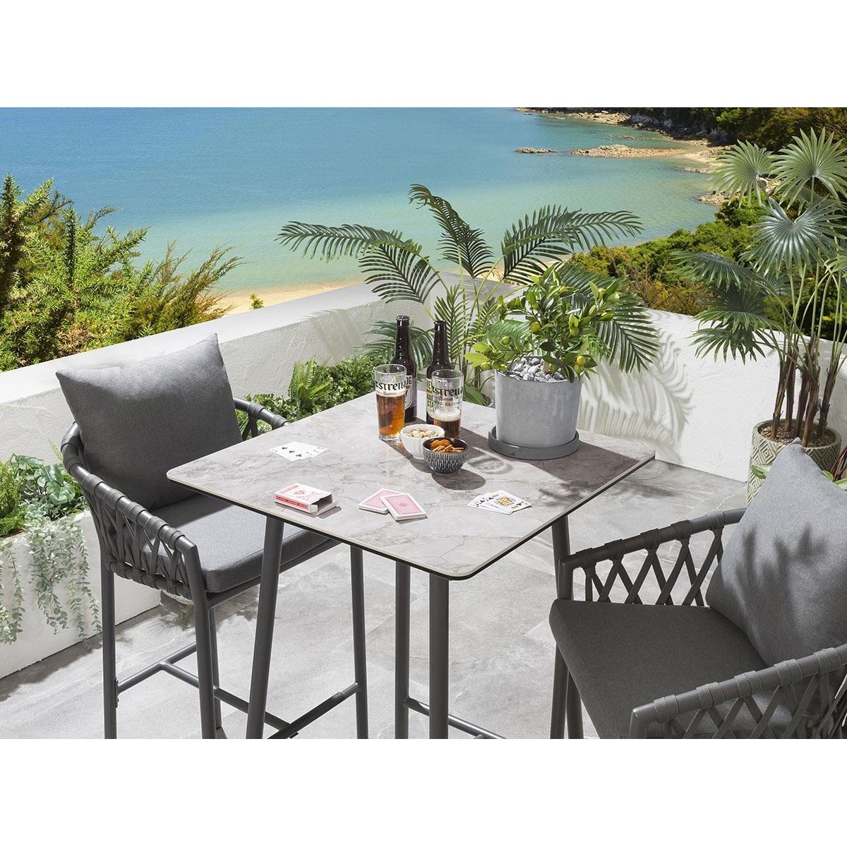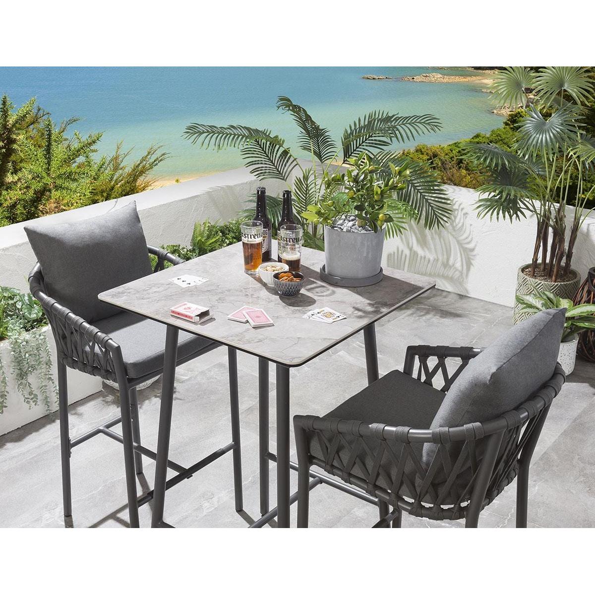 Our hard-wearing and spacious ceramic 70cm square garden high bar table makes a perfect addition to any contemporary, modern or minimalist outdoors, providing enough space for up to four people to enjoy the sunshine in comfort. The 120cm tall bar table is made from robust and ultra-durable ceramic in a natural smooth grey marble-effect finish, atop a hard-wearing grey aluminium metal frame - which are set to last for years to come and comes with a free protective winter cover. Included in the set; reinvent your outdoor space with these fabulous all-weather beige rope-back garden bar stools. The generously padded outdoor chairs are enhanced by a supportive back cushion for an extra layer of luxurious comfort. Our gorgeous rope back outdoor bar stools will make a stunning addition to your outdoor seating area or patio. The bar stools come complete with our signature luxuriously thick cushioning that offers unbeatable comfort, topped off with rich Beige high-end marine fabric which has amazing resilience to colour fading and damage caused by extreme weather conditions and comes with a free protective winter cover. Aluminium garden furniture requires very little maintenance, making it the perfect choice for fuss-free alfresco dining. You won't need to scrub it or treat it, just an occasional wipe down with warm soapy water and a clean cloth to keep it looking its best. Expertly crafted aluminium frames are highly durable, complemented by clean lines that lend contemporary style. It is robust and weather-resistant for outdoor use & the super cushioned seating offers W70cm D70cm H120cm Durable ceramic marble table top Free beige protective cover included