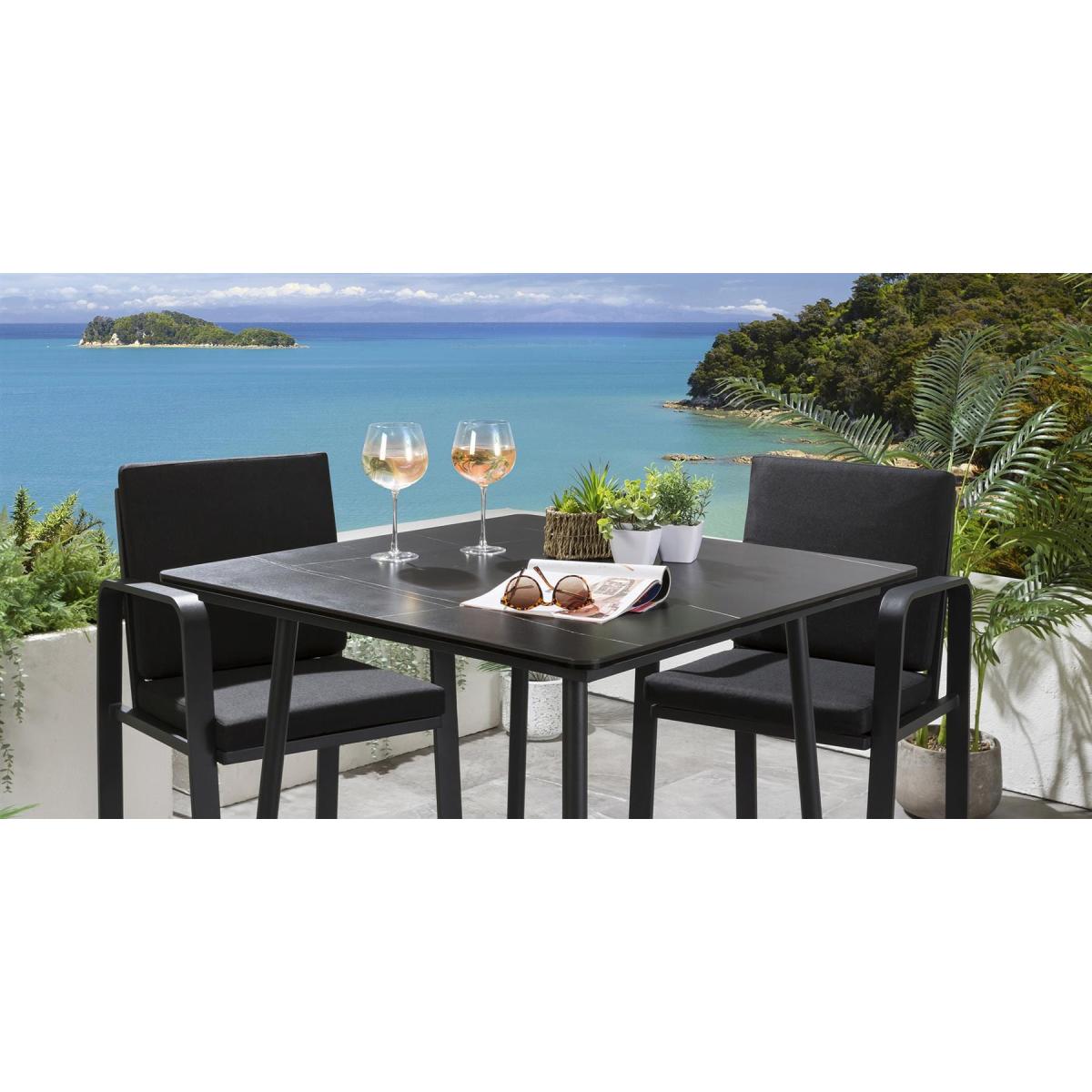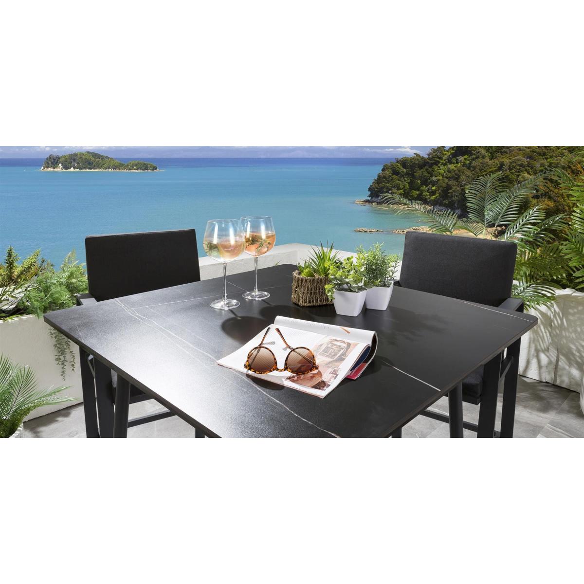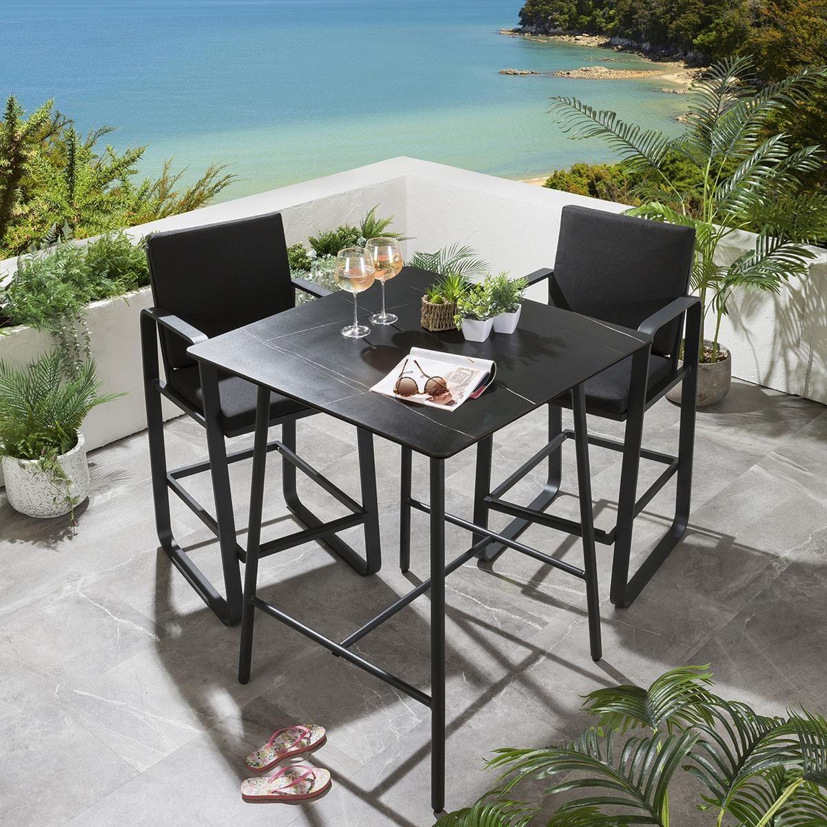 Our hard-wearing and spacious ceramic 90cm square garden high bar table makes a perfect addition to any contemporary, modern or minimalist outdoors, providing enough space for up to four people to enjoy the sunshine in comfort. The bar table is made from robust and ultra-durable ceramic in a natural smooth black marble-effect finish, atop a hard-wearing grey aluminium metal frame - which are set to last for years to come and comes with a free protective winter cover. Included in this set; fabulous all-weather charcoal rope-back garden bar stools. The generously padded outdoor chairs are enhanced by a supportive back cushion for an extra layer of luxurious comfort. Not only does the Quatropi Freddy ultra modern Garden Range look great, but it is also designed to withstand the elements, making it ideal for outdoor use. The deep, soft cushions provide maximum comfort, while the oversized aluminum frame ensures durability and stability. The dark grey aluminium frames and cushions offer a dramatic and contemporary look to any outdoor space, Spread the cost our with interest-free finance options. Minimum spend applies.