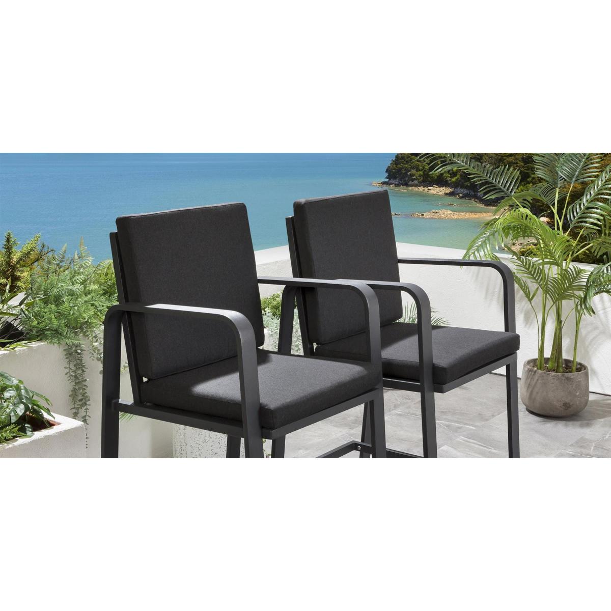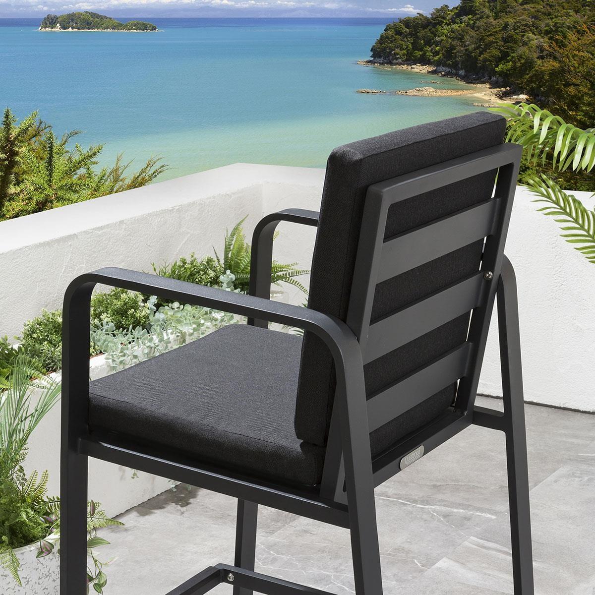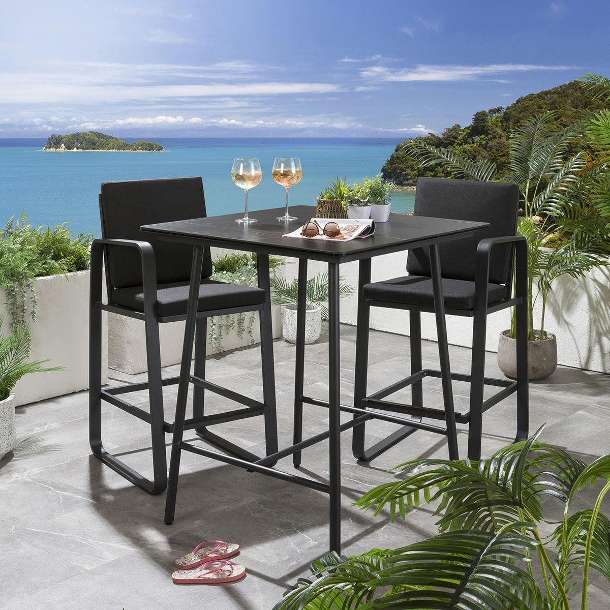 Our hard-wearing and spacious ceramic 90cm square garden high bar table makes a perfect addition to any contemporary, modern or minimalist outdoors, providing enough space for up to four people to enjoy the sunshine in comfort. The bar table is made from robust and ultra-durable ceramic in a natural smooth black marble-effect finish, atop a hard-wearing grey aluminium metal frame - which are set to last for years to come and comes with a free protective winter cover. Included in this set; fabulous all-weather charcoal rope-back garden bar stools. The generously padded outdoor chairs are enhanced by a supportive back cushion for an extra layer of luxurious comfort. Not only does the Quatropi Freddy ultra modern Garden Range look great, but it is also designed to withstand the elements, making it ideal for outdoor use. The deep, soft cushions provide maximum comfort, while the oversized aluminum frame ensures durability and stability. The dark grey aluminium frames and cushions offer a dramatic and contemporary look to any outdoor space, Spread the cost our with interest-free finance options. Minimum spend applies.