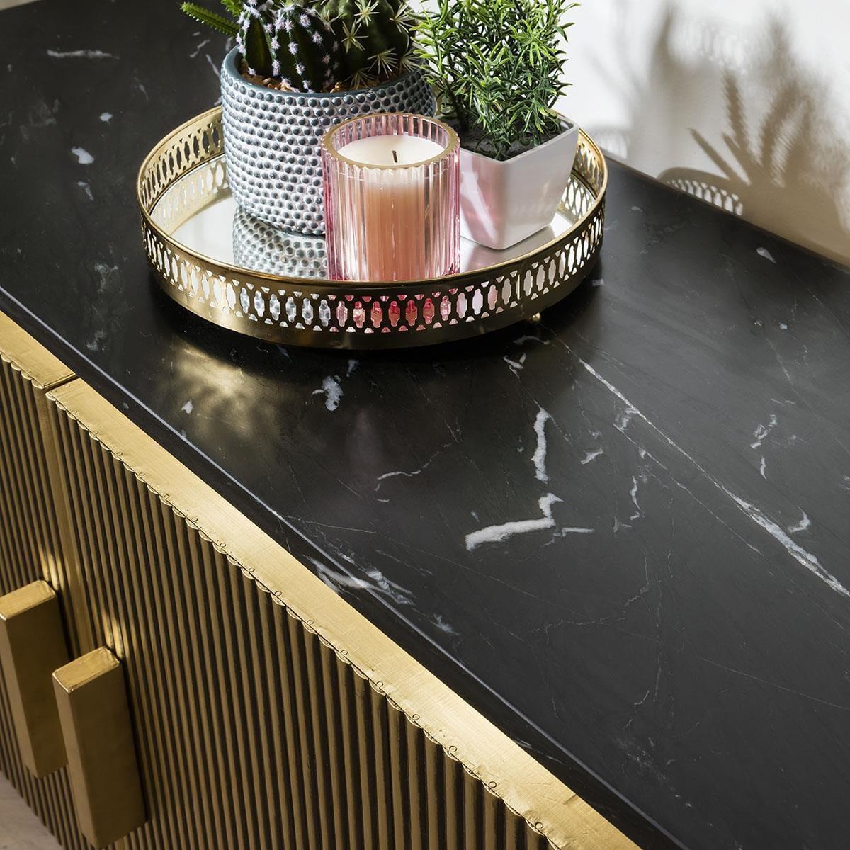 The Ironville 4 Door Sideboard offers a modern take on mid-century forms. The design features a ribbed brass metal sheet finished in a golden tone that exudes opulence and luxury, while nodding to styles of the 1960s. A black marble top completes the look. Mounted on an iron base, this gold sideboard cabinet offers a rigid and streamline structure reminiscent of mid-century furniture styles. The golden, ribbed design injects a room with instant definition. Inside, discover shelving suitable for storing tableware and a range of home items. W:160cm, D:40cm, H:86cm Modern 4 Door Sideboad Find matching products in the Ironville Range W:160cm, D:40cm, H:86cm Modern 4 Door Sideboad Find matching products in the Ironville Range