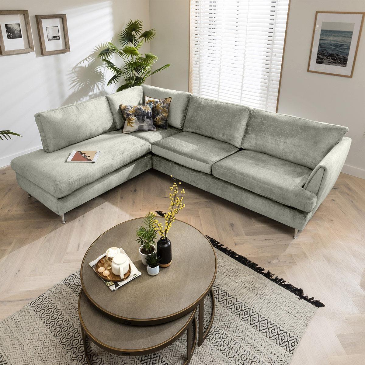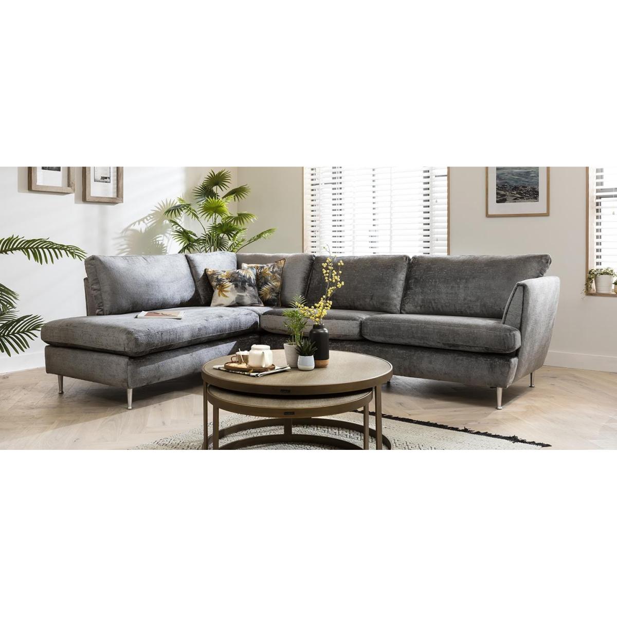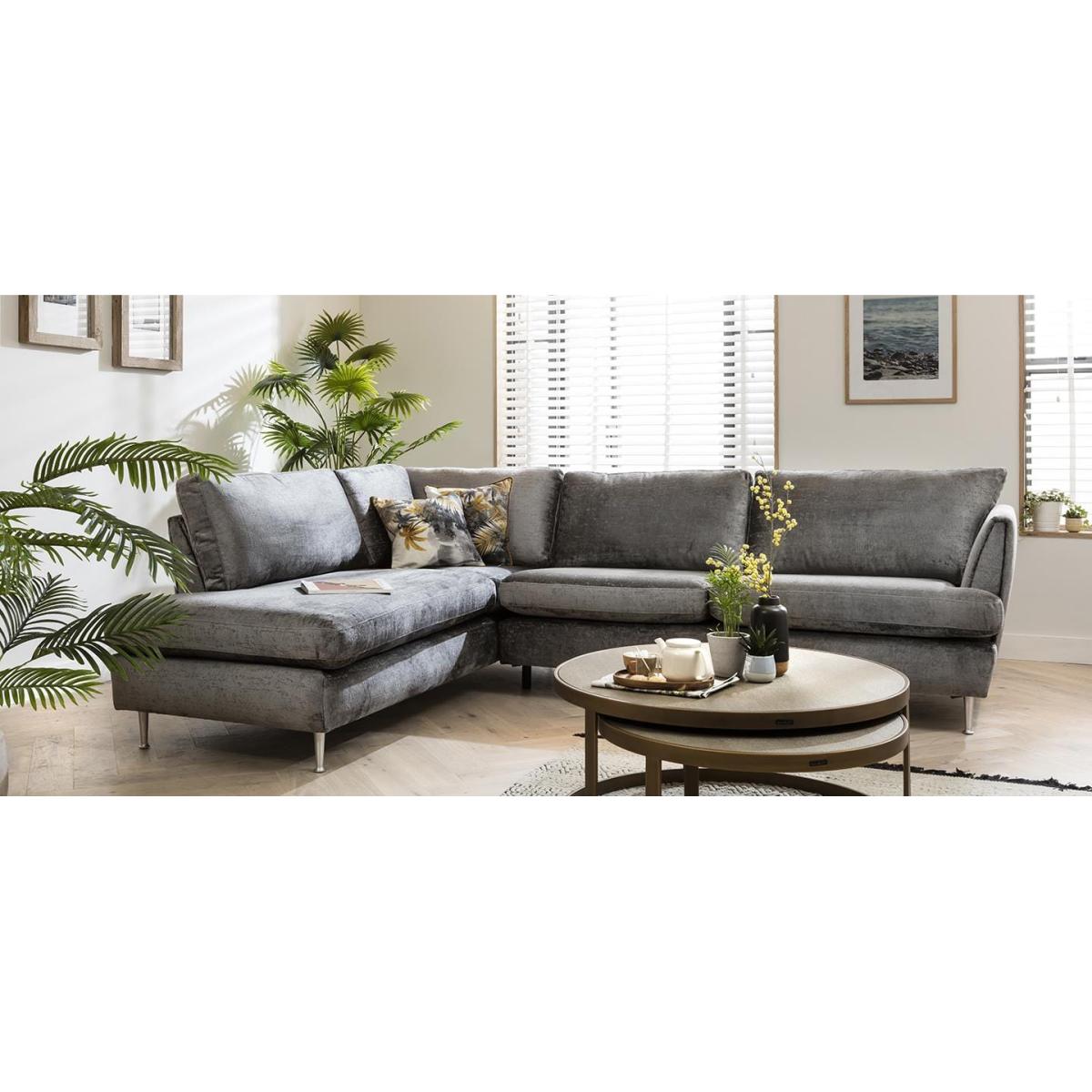 Tessa is a modular 4 seater corner sofa with an open-end, perfect for modern family homes, offering comfort and style. Make your living room stylish and well-arranged with this modern sectional left-hand corner sofa. Create a cosy corner to rest after a long day at work. Relax in luxurious comfort with this sectional sofa for four. It's curvaceous silhouette is upholstered in your choice of on-trend premium fabric, while silver Scandinavian-inspired metallic legs not only provide support to the construction but also give it a light impression. The elegantly curvaceous and sophisticated design of the sofa is enriched by generously deep seats and a spacious open-end that lends a relaxing charm to the overall appeal of the sofa set. This L shape modular corner sofa is an amazingly sophisticated 4-seater sofa, adaptable to your interior dimensions by adding extra modules. The thickly padded sofa is tailored in a choice of 50 exclusive premium fabrics that boast stitching that is expertly sewn by upholstery specialists. Thanks to the well-balanced sink in' feel and its sophisticated look, this sofa is exclusively designed for indulgent comfort. Need assistance? Use Live Chat to send us a message. If you need more information about this product, use the Live Chat service to speak to the team or send us a message. Spread the cost our with interest-free finance options. Minimum spend applies. W294cm D225cm H90cm Fully modular extendable design All dimensions are approximate due to fabric differences. Please allow tolerance of +/- 5cm to any direction