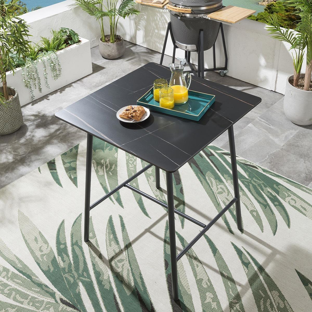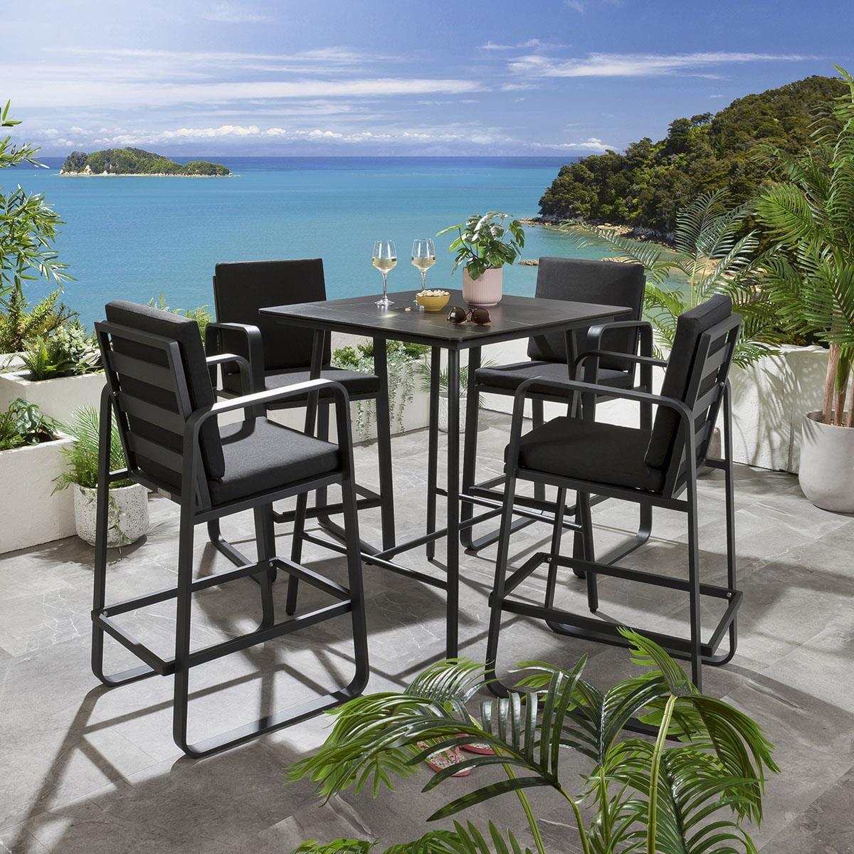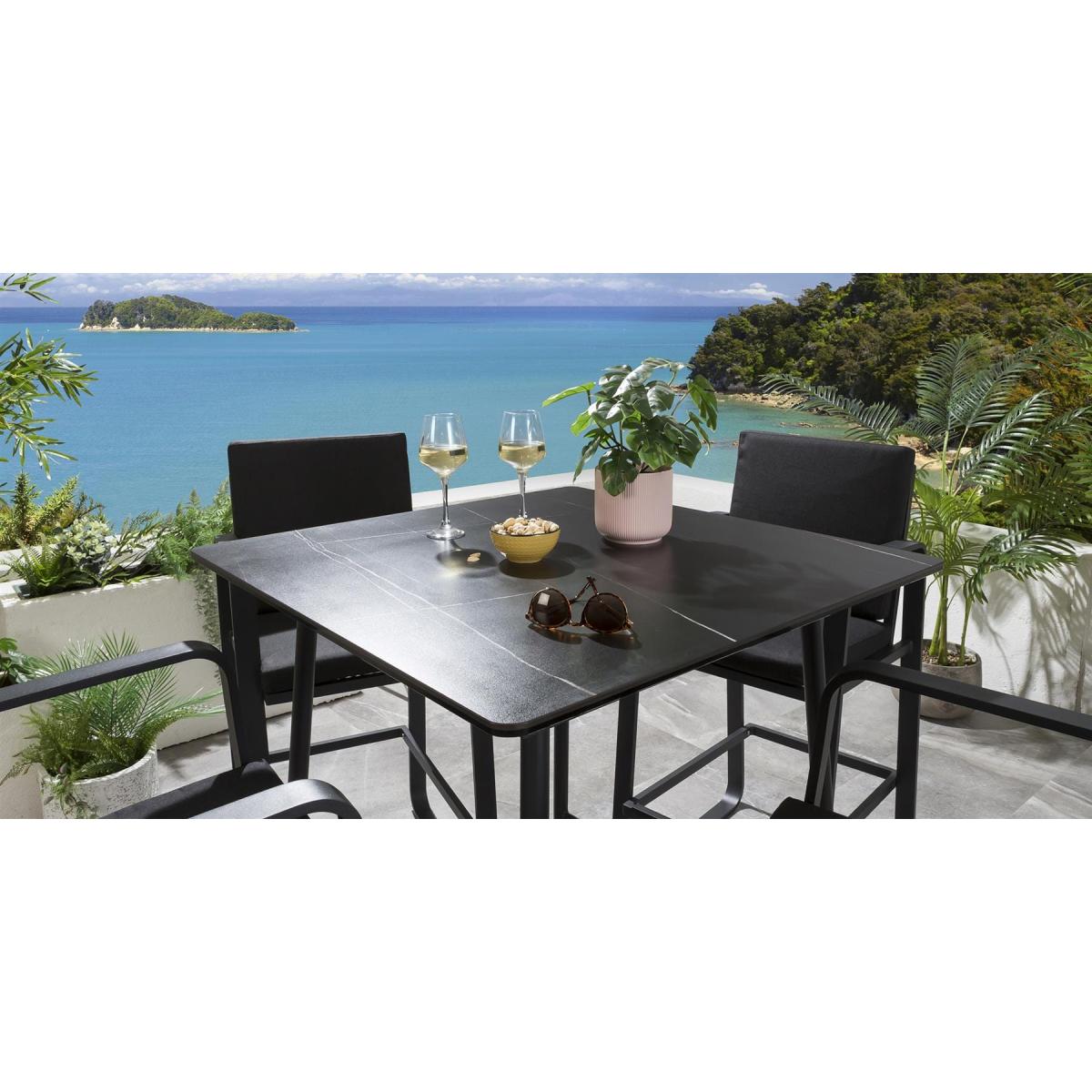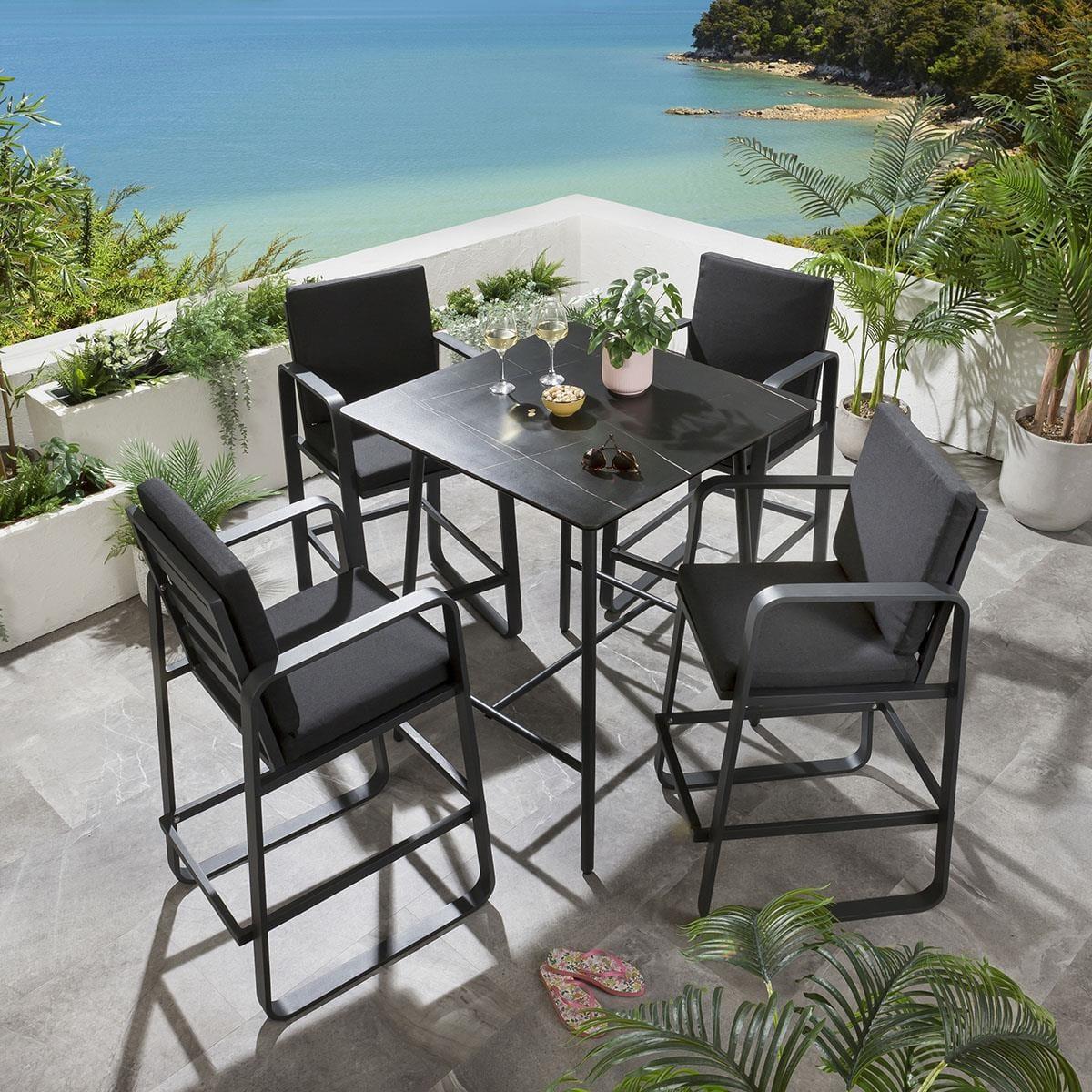 Our hard-wearing and spacious ceramic 90cm square garden high bar table makes a perfect addition to any contemporary, modern or minimalist outdoors, providing enough space for up to four people to enjoy the sunshine in comfort. The 120cm tall bar table is made from robust and ultra-durable ceramic in a natural smooth black marble-effect finish, atop a hard-wearing grey aluminium metal frame - which are set to last for years to come and comes with a free protective winter cover. Included in this set; fabulous all-weather charcoal rope-back garden bar stools. The generously padded outdoor chairs are enhanced by a supportive back cushion for an extra layer of luxurious comfort. Not only does the Quatropi Freddy ultra modern Garden Range look great, but it is also designed to withstand the elements, making it ideal for outdoor use. The deep, soft cushions provide maximum comfort, while the oversized aluminum frame ensures durability and stability. The dark grey aluminium frames and cushions offer a dramatic and contemporary look to any outdoor space, Spread the cost our with interest-free finance options. Minimum spend applies.