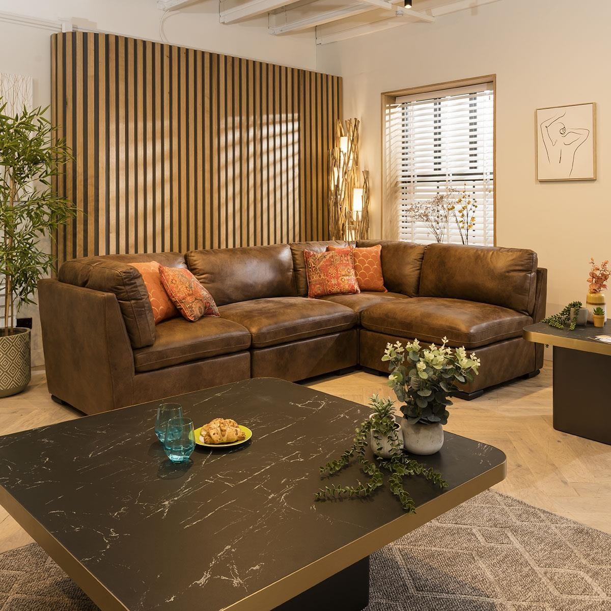 Versatile and stylish, this modular sofa set will transform your living room into a cosy haven. This is a Modern 4 Seater Corner Sofa Set in an elegant antique brown leather-look fabric offers comfort and flexibility. With a modular design and secure clips, you can rearrange the sofa modules to suit your room layout. Expandable and adaptable, this sofa set allows you to add additional modules for even more seating space. Each module measures 95cm, providing you with the freedom to customise the size and shape of your sofa according to your preferences. Whether you have a large living room or a compact space, this sofa is the perfect fit. Sink into luxury with our super soft premium cushions, offering unparalleled comfort and support. The cushions are fixed in place, ensuring a neat and tidy appearance while preventing any shifting or slipping. You can relax and unwind for hours on end, indulging in the plushness of our carefully designed cushions. Not only does this sofa provide supreme comfort, but it also exudes an air of sophistication with its sleek black metal feet. Whether you're hosting a movie night with friends or simply enjoying some quality time with your loved ones, this modular sofa with its timeless design and luxurious features is a must-have for any home. It effortlessly blends functionality, style, and comfort, making it the ideal choice for both large and small spaces. Upgrade your living room and elevate your lounging experience with our exceptional modular sofa set today. W285cm D190cm H87cm 4 Seater Corner Sofa Set Fully modular design: this set includes 2x corner sections, 2x middle sections