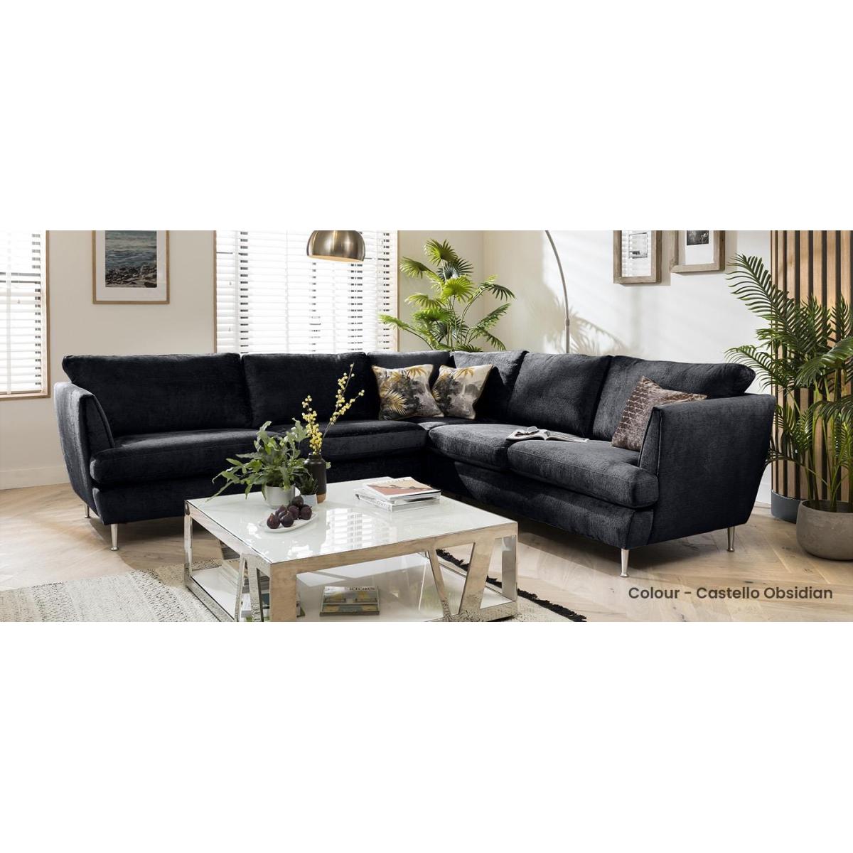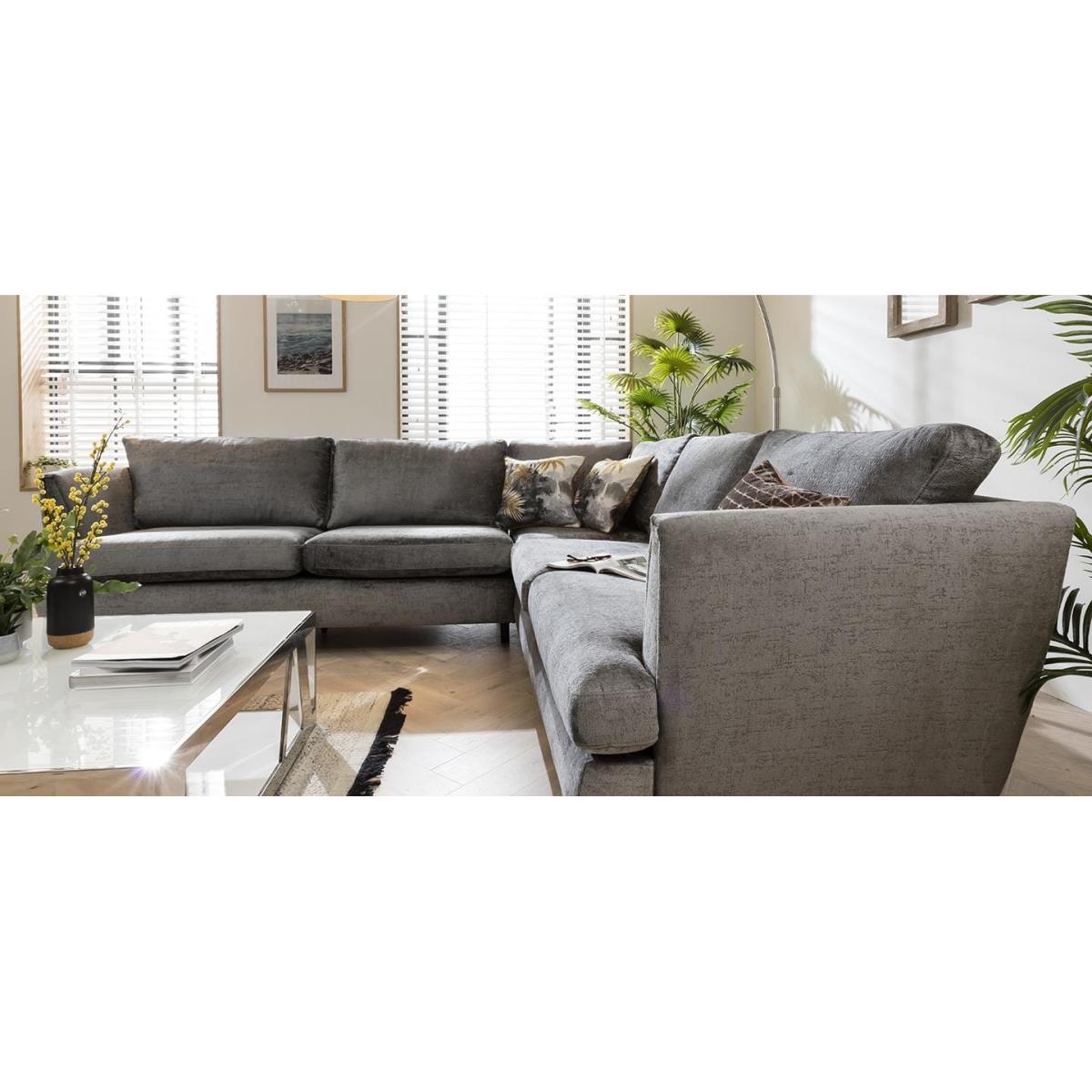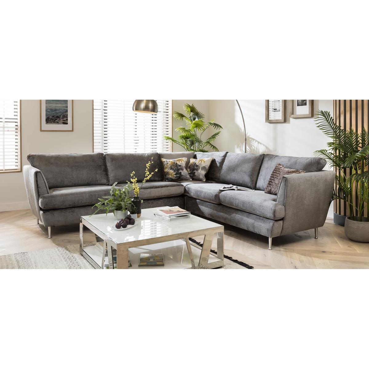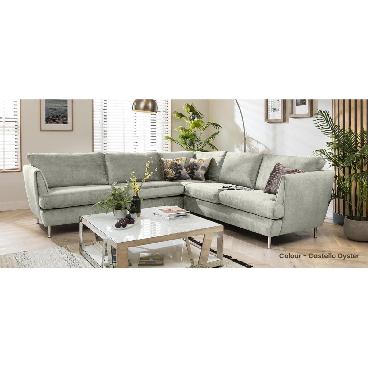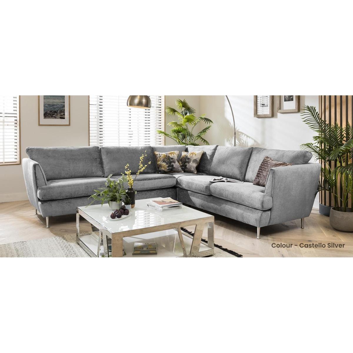 Tessa is a modular 5 seater corner sofa, perfect for modern family homes, offering comfort and style. Make your living room stylish and well-arranged with this modern sectional right-hand corner sofa. Create a cosy corner to rest after a long day at work. Relax in luxurious comfort with this sectional sofa for five. It's curvaceous silhouette is upholstered in your choice of on-trend premium fabric, while silver Scandinavian-inspired metallic legs not only provide support to the construction but also give it a light impression. The elegantly curvaceous and sophisticated design of the sofa is enriched by generously deep seats and luxurious high-end cushioning This L shape modular corner sofa is an amazingly sophisticated 5-seater sofa, adaptable to your interior dimensions by adding extra modules. The thickly padded sofa is tailored in a choice of 50 exclusive premium fabrics that boast stitching that is expertly sewn by upholstery specialists. Thanks to the well-balanced sink in' feel and its sophisticated look, this sofa is exclusively designed for indulgent comfort. Need assistance? Use Live Chat to send us a message. If you need more information about this product, use the Live Chat service to speak to the team or send us a message. Spread the cost our with interest-free finance options. Minimum spend applies. W290cm D260cm H90cm Fully modular extendable design All dimensions are approximate due to fabric differences. Please allow tolerance of +/- 5cm to any direction