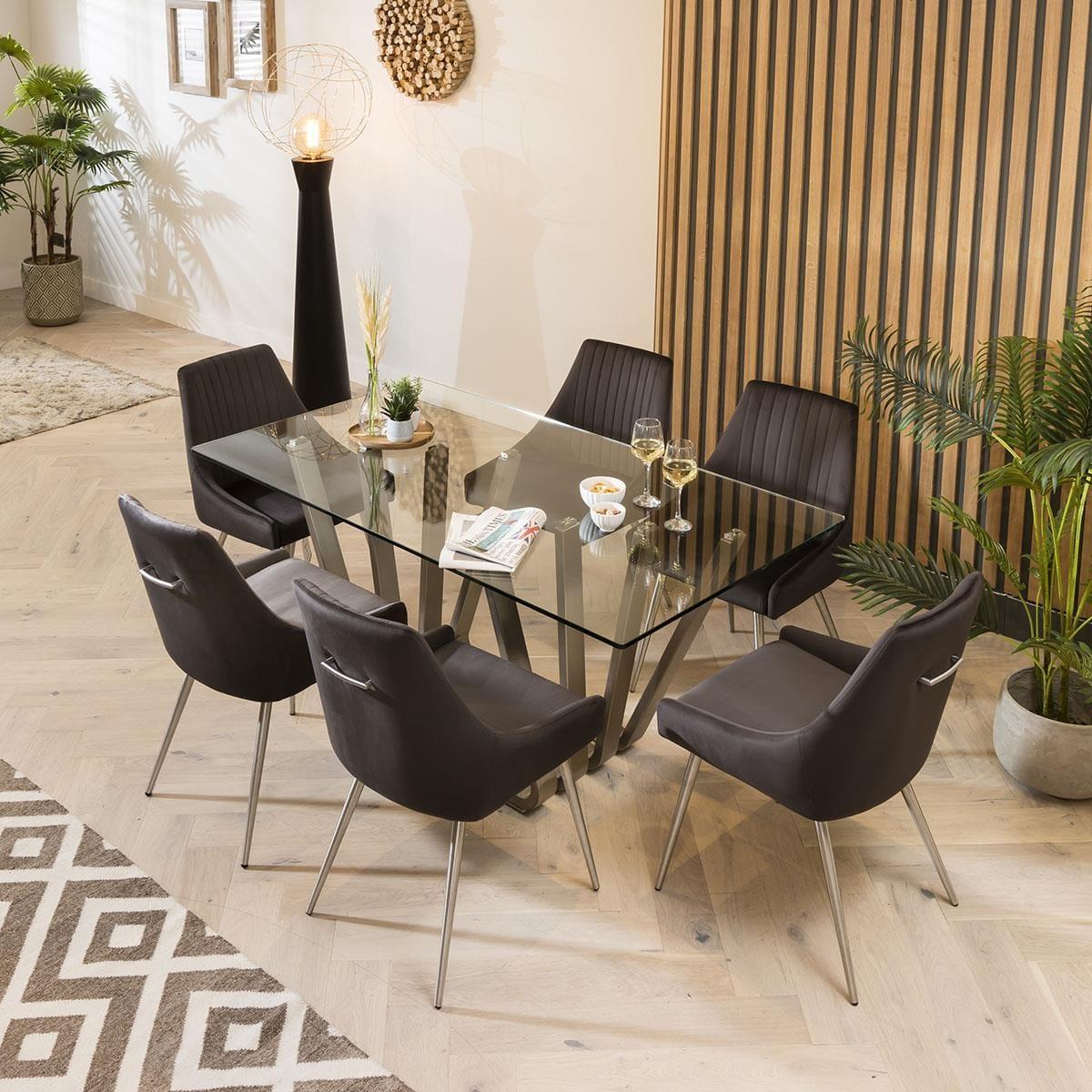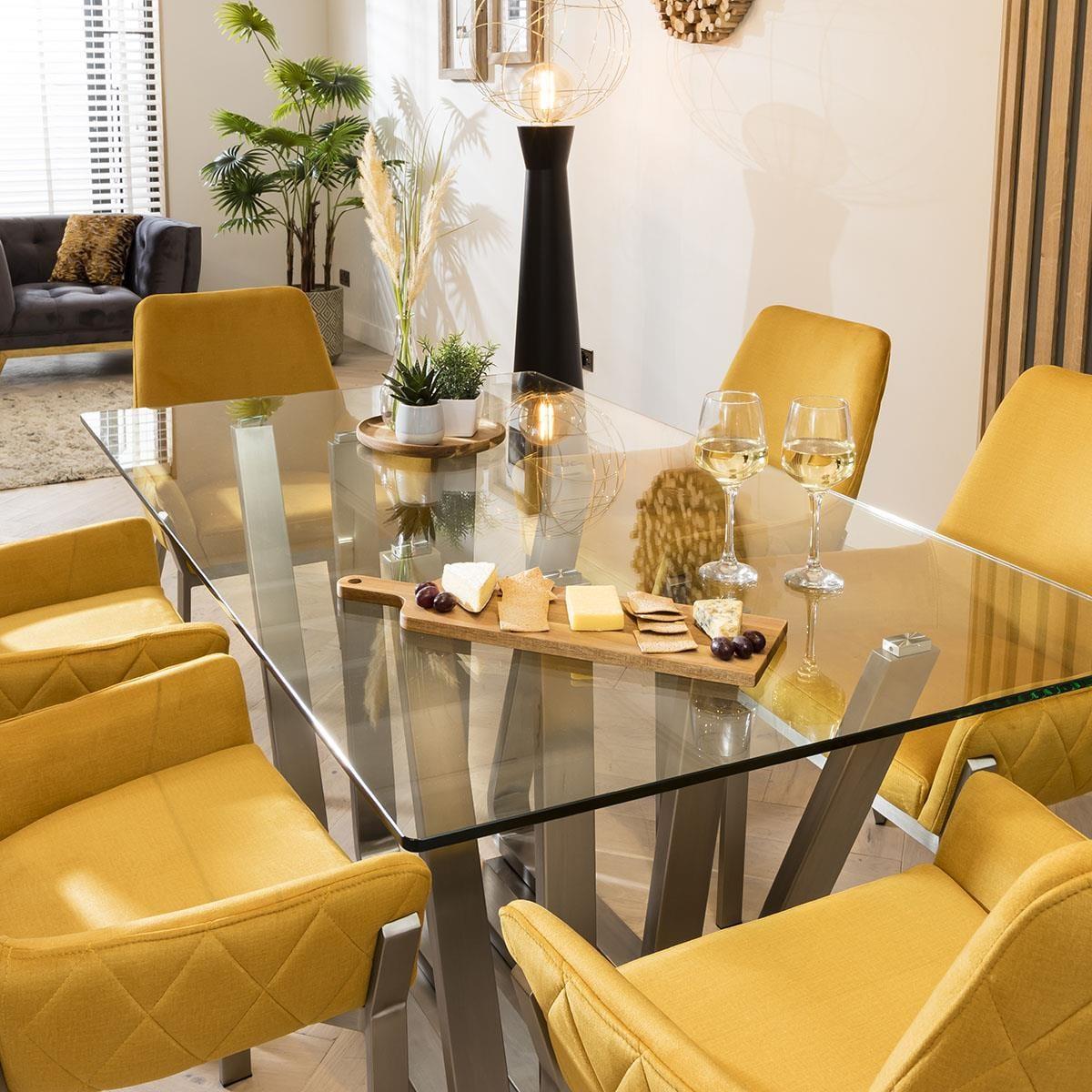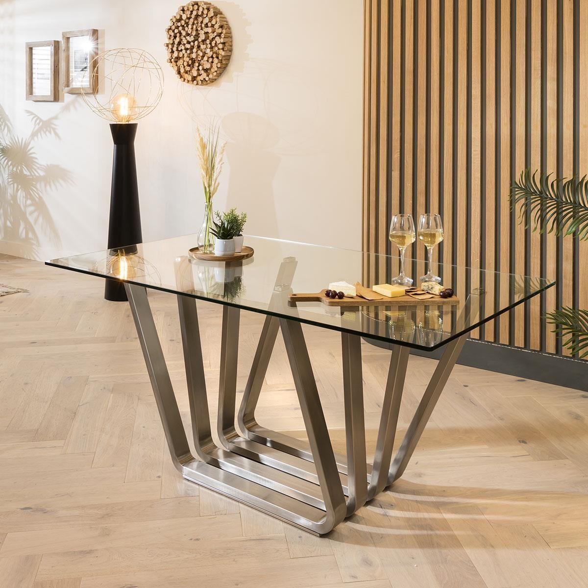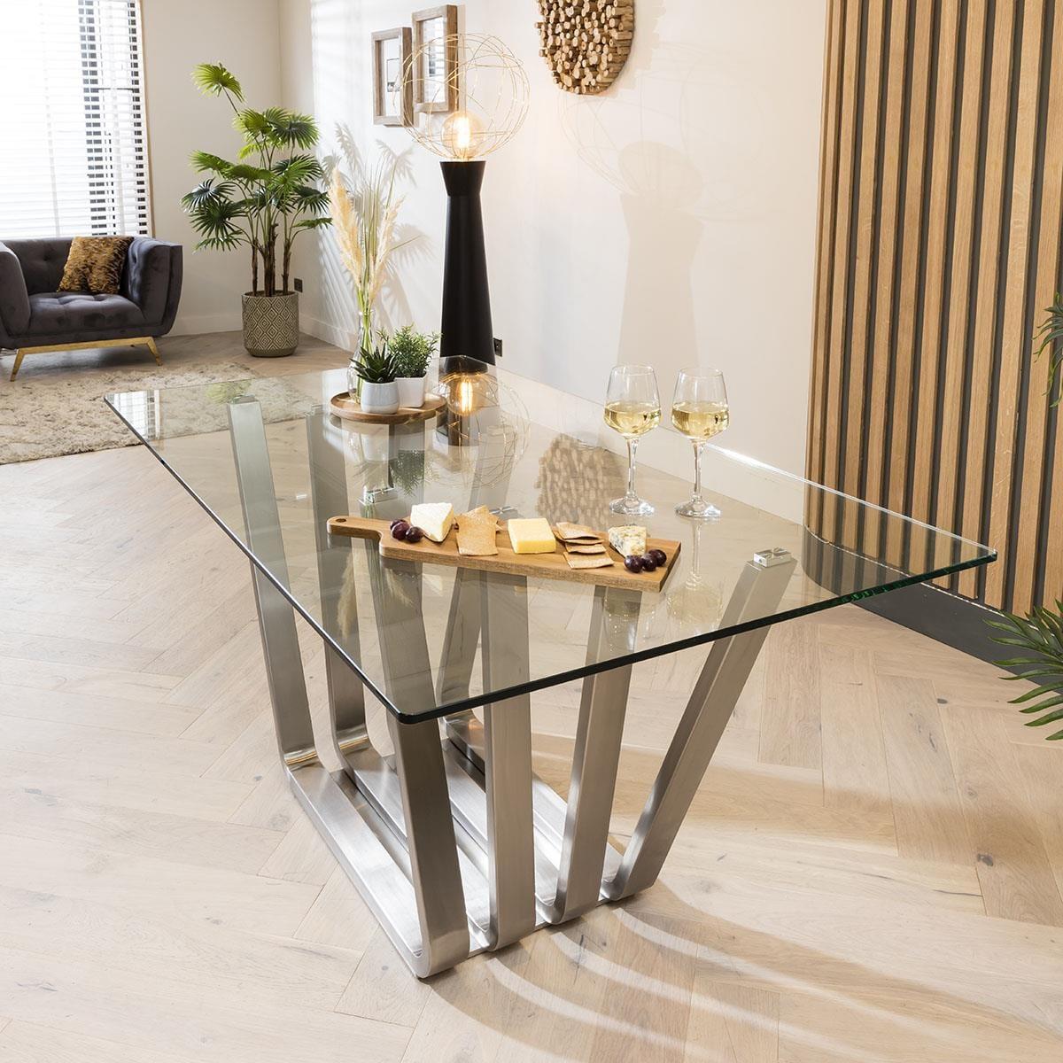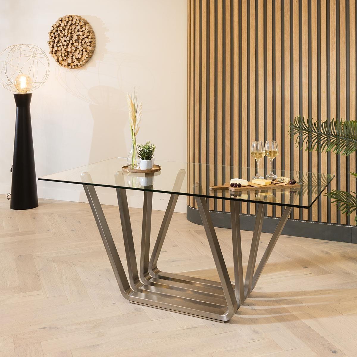 Our premium glass dining table, with clear glass and unique stainless steel base design is an incredibly modern and stylish piece that is perfect for contemporary home decor. This glass and stainless steel dining table by Quatropi is an impressive centrepiece for your entertaining space which will comfortably seat 6 people. The 160cm by 90cm 6 seater table is expertly crafted from 12mm tempered clear glass top and lends a contemporary-chic backdrop for your best silverware. The geometric-inspired stainless steel designer base is a bold angular design of striking elegance with a metallic finish. We are specialists in high-end dining, and from our experience, a truly luxurious dining interior needs a premium dining table. Here at Quatropi you will find something to suit any decor, including small to large, round and square tables, and a whole host of colours and materials, like premium oak tabletops to elegant pure white dining table and chair sets. If you need more information about this product, use the Live Chat service to speak to the team or send us a message. Spread the cost our with interest-free finance options. Minimum spend applies. W90cm D160cm H75cm Modern Design Premium Quality Furniture
