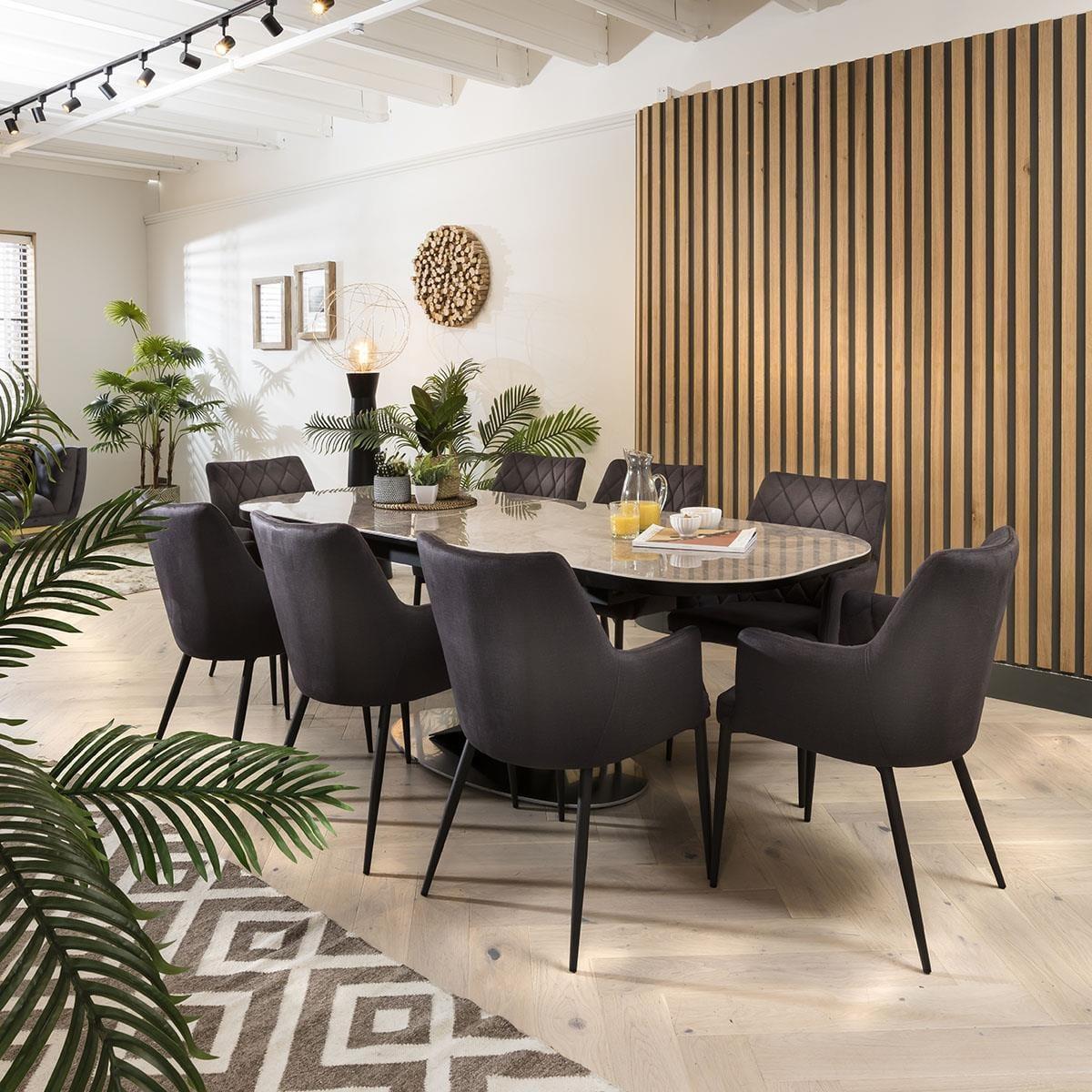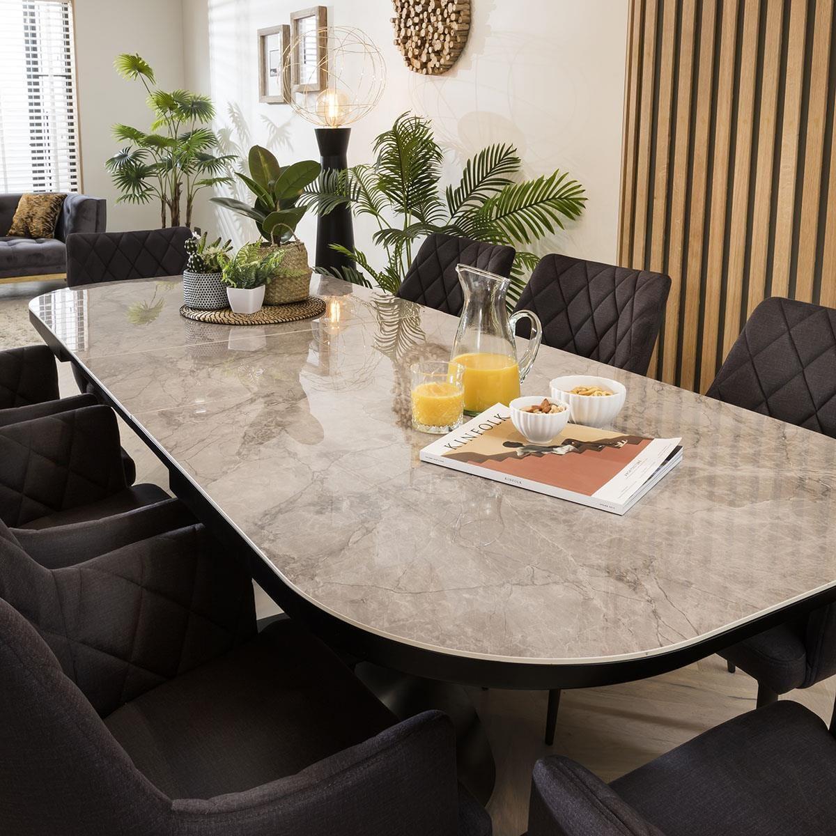 Large modern dining tables where the whole family can come together is what we specialise in. This extendable ceramic dining table pulls inspiration from modern designer-chic that is sleek and sophisticated, with a truly modern design featuring soft, rounded edges and a bold pedestal with a geometric feature. The black powder coated pedestal and brushed stainless steel base provide a sturdy, balanced base for tables and desks of various sizes. The elegant 6 - 8 seater table easily extends from 180cm to a generous 220cm and features tempered glass with a smooth 5mm grey marble effect ceramic finish. Turning the spotlight on classic carver style with a modern industrial twist, the ever-popular Quatropi 1648 carver dining chairs are upholstered in a soft, fine charcoal grey fabric, featuring a stunning diamond quilted design. Complemented by the up-right supportive arms, atop expertly crafted powder coated metal legs. W220cm D90cm H76cm Highly durable marble effect ceramic tabletop Set includes the extendable dining table and 8 carver chairs