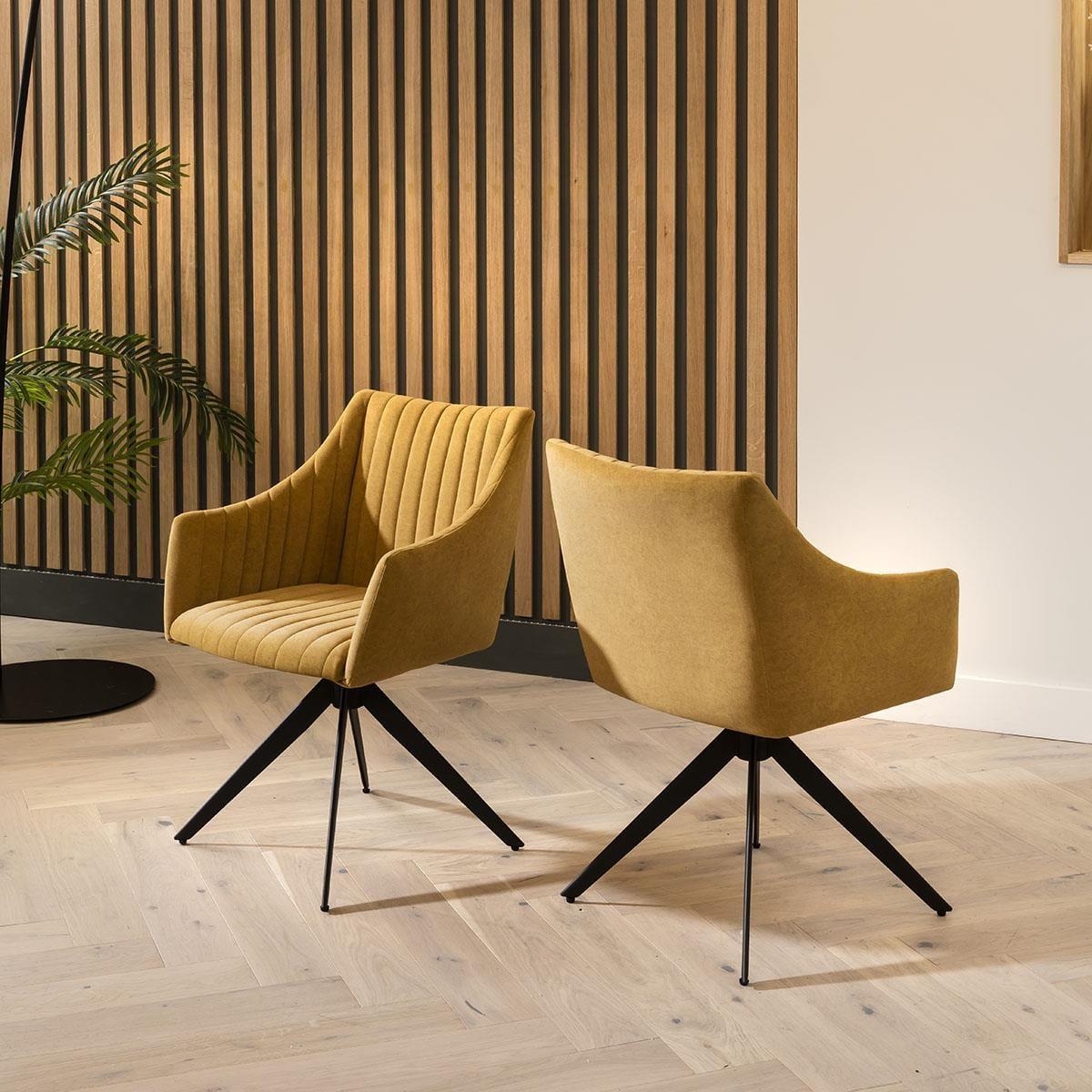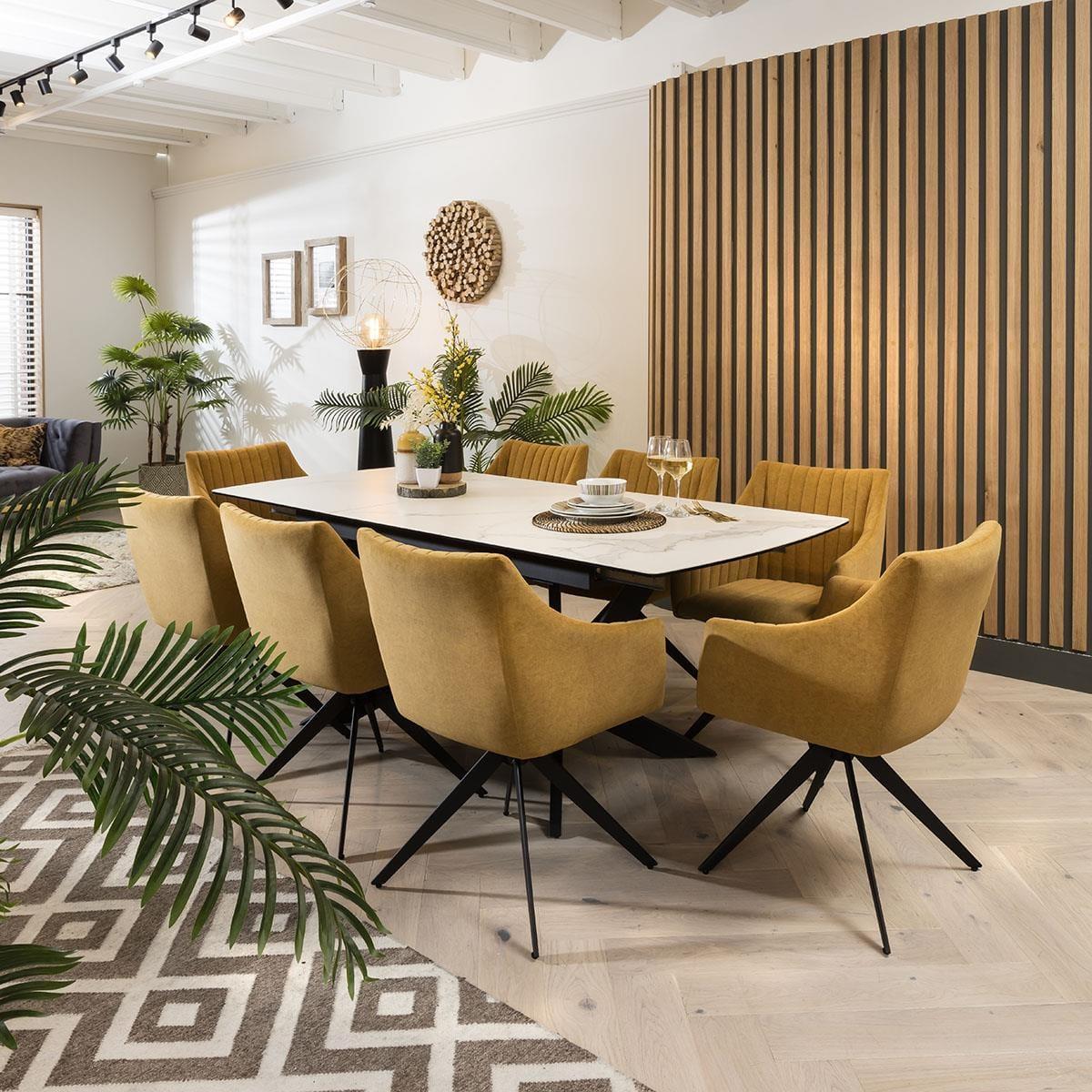 If you're looking to add a statement piece to your dining room with all the durable qualities of ceramic, Quatropi's Emperor 150-200cm extending white ceramic dining table has a generously large table top made of high-quality Italian ceramic in a white marble effect finish, which is applied to a stable plate made of safety glass. Featuring a solid 4-legged metal base design incorporates a premium black powder coated finish, that supports the self-stowing extension mechanism that extends the table from a 150cm to a 200cm 6 - 8 seater dining table. This modern swivel carver chair is a real gem at the dining table with their medium-high backrests and soft armrests, ensuring particularly high comfort. Its unique cocooning shape lets you sit back snugly, while channel tufted mustard yellow fabric upholstery and foam cushioning ensure you'll want to stay. The chair is upholstered with a premium fabric and has a black powder coated base - both fit perfectly in any modern interior. For an added touch of practicality, the swivel seat allows for seamless socialising. Elegant yet edgy, this chair is sure to add a very luxurious and rich appearance to any dining room. W200cm D90cm H76cm Self-stowing extending table Set includes the dining table and 8 premium chairs