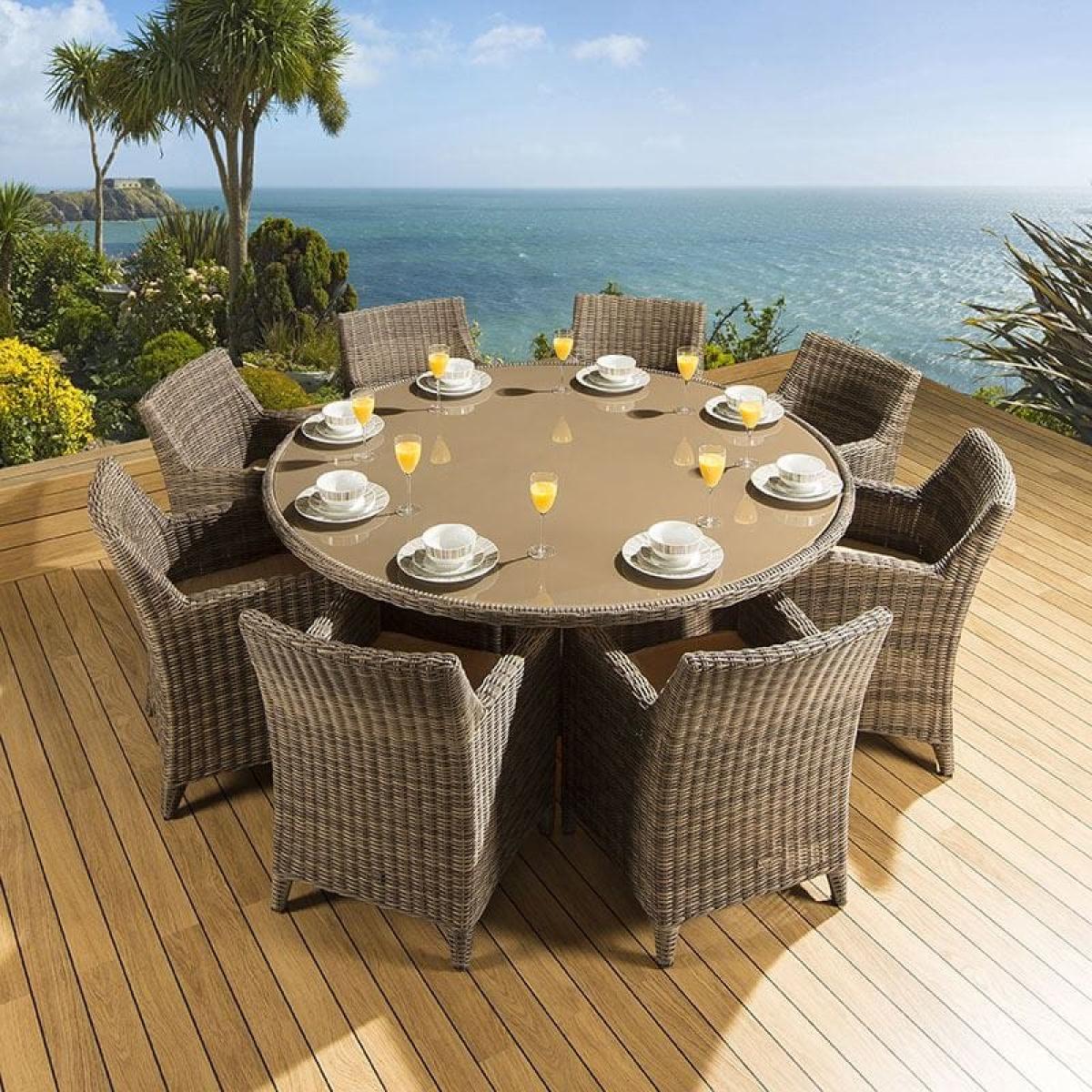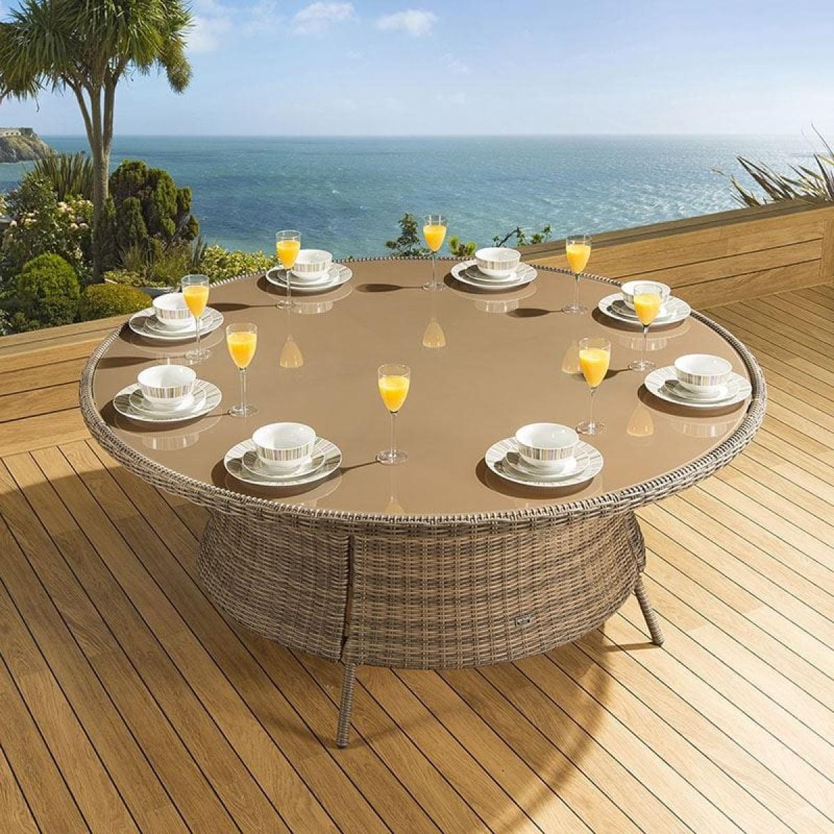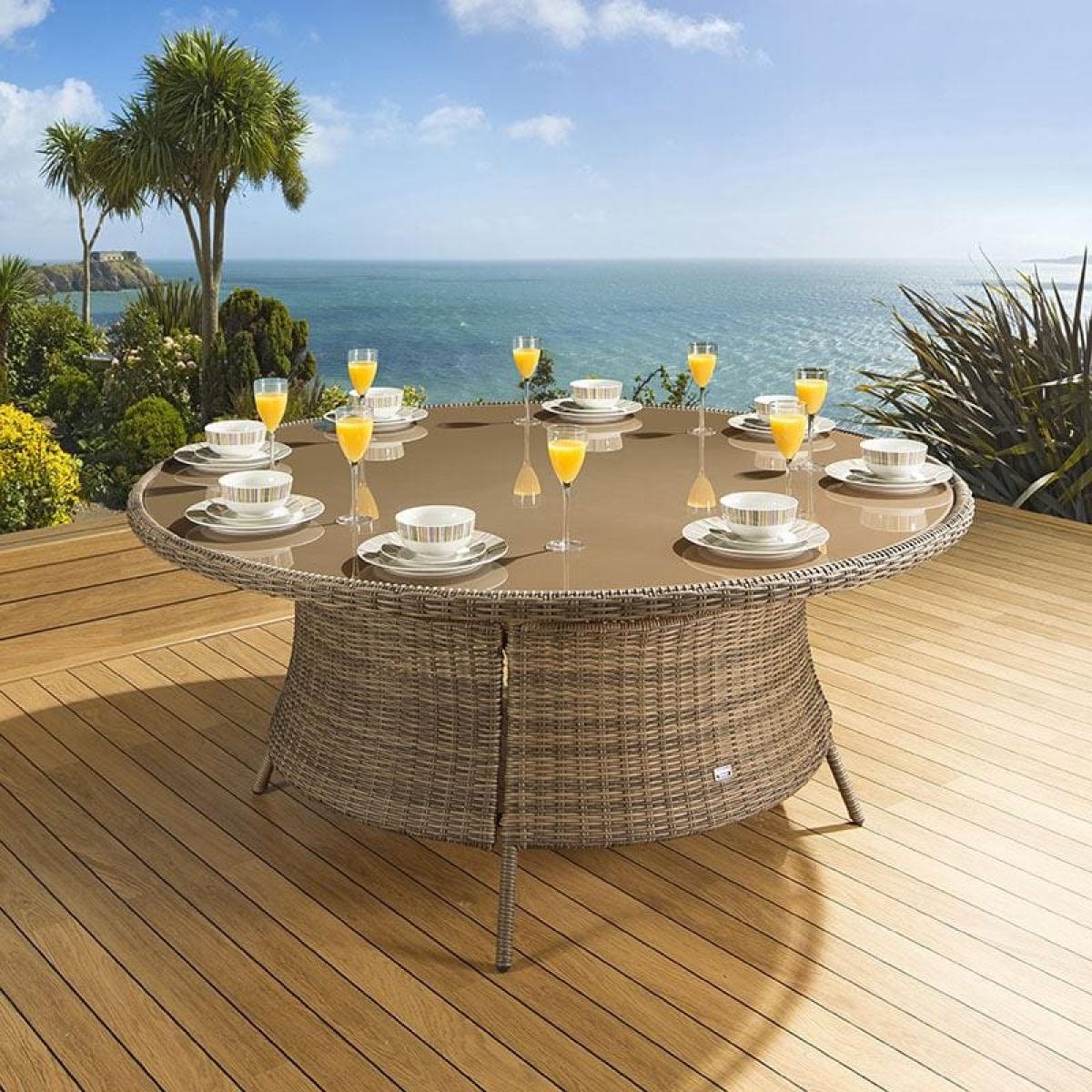 The Classic Rattan Garden Table, super-sized to seat up to 8 people. Expertly crafted from premium brown rattan with coordinating tempered glass insert for added durability. This large rattan garden table is designed for luxury hosting - why not make dining easier for everyone and add a matching Lazy Susan? The table encompasses everything we love about luxury al-fresco bistro dining, especially when paired with Quatropi dining chairs to make a gorgeous table and chairs set. If you need more information about this product, use the Live Chat service to speak to the team or send us a message. Spread the cost our with interest-free finance options. Minimum spend applies. W180cm D180cm H75cm Brown Rattan Round Garden Table Premium Quality Furniture