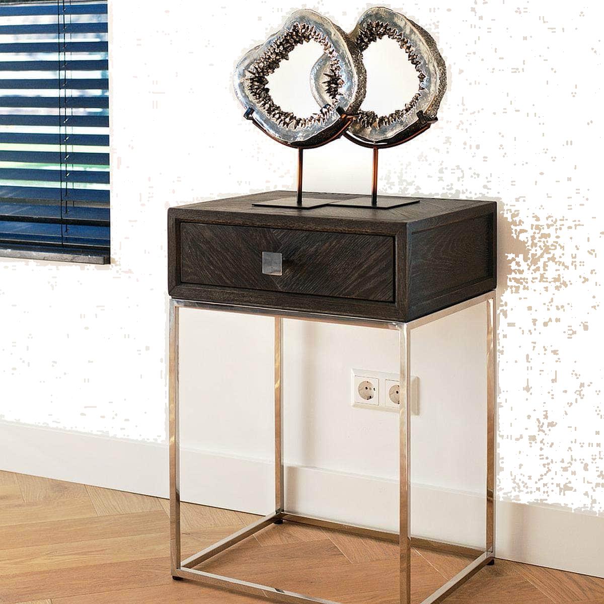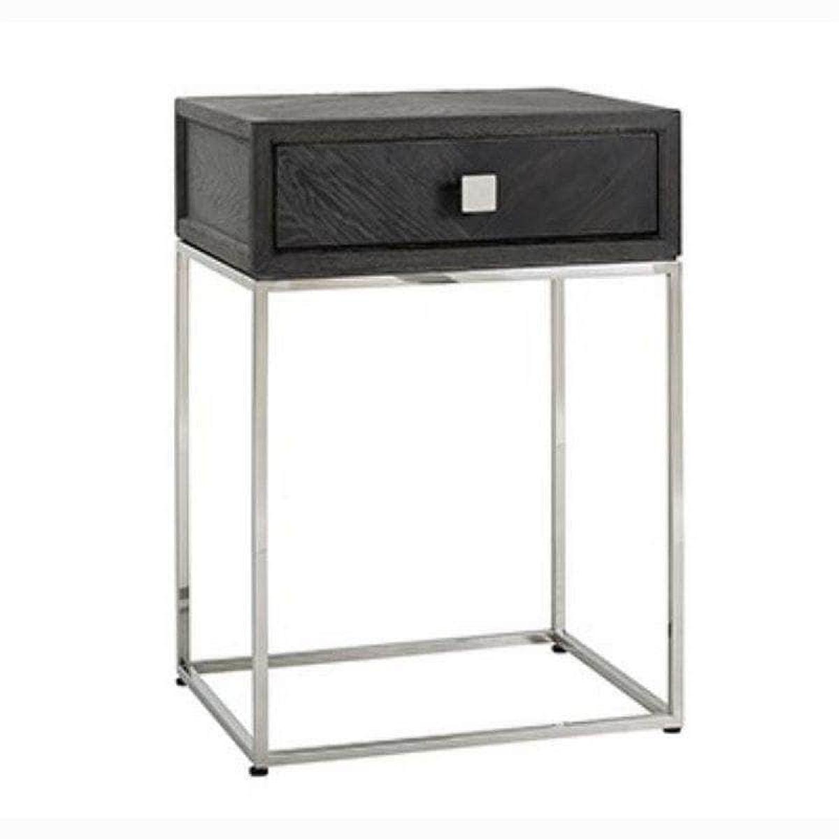 The Mayfair Silver table is a small black side table. The rectangular side table stands at 71cm tall, with a stylish black oak table top and a small convenient drawer. The main compartment is supported by a 50cm by 40cm silver plated stainless steel frame. The Mayfair Silver collection is made from new, black-stained oak of which the parts are placed in a chic herringbone pattern. The tight metal frames are silver plated. The complete collection is also available with gold coloured frames; the Mayfair Gold collection. The Mayfair Silver collection was methodically designed to embody everything we love about luxury furniture. From the opulence of the silver plated frame that supports the end table, to the specially selected, hand-crafted stained oak construction. The Mayfair Silver collection sets the standard for luxury furniture collections. W50cm D40cm H71cm Stainless Steel Detailing Matching Items Available