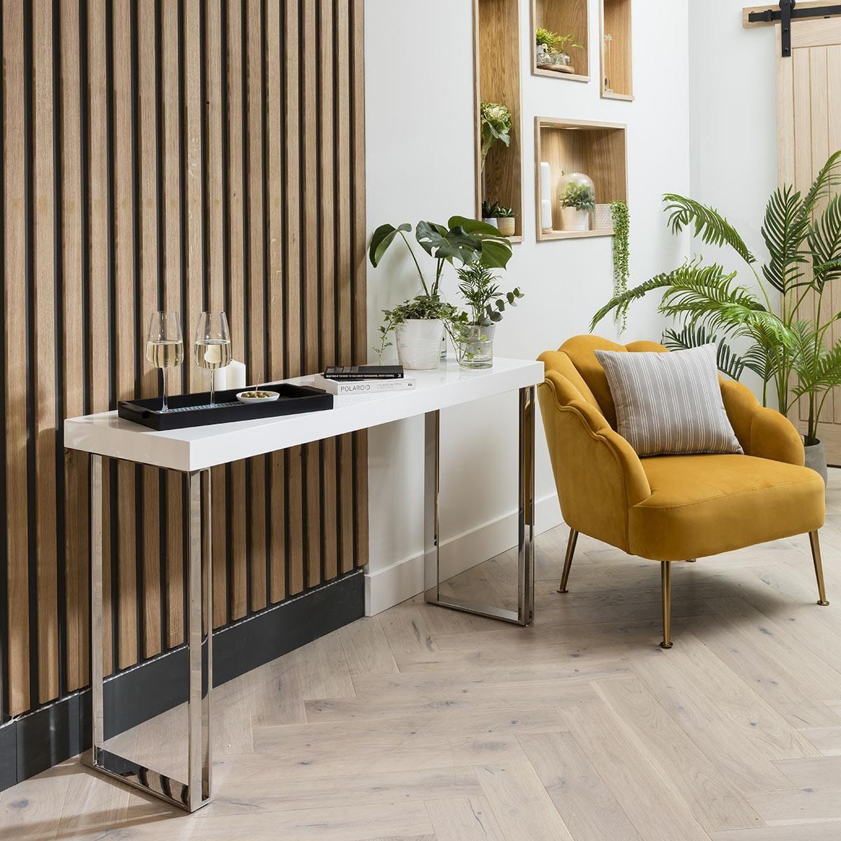 The Sophie gloss white console table will be perfect for those looking for something modern and minimalist. At only 39cm deep, it's perfect for a hallway table, creating a clutter-free entrance. And, of course it serves not only a decorative purpose, at 140cm wide, use it as a sleek sofa table behind a luxury modern sofa, or as a radiator table. Styled with contemporary design in mind, the Sophie collection combines the best materials with superior composition. Crafted from wood and given a white gloss finish, the Sophie range is completed by extremely shiny stainless steel accents and legs. The high gloss finish is easy to wipe clean and will brighten up any dining or living area with ease. A Quatropi Sophie console table is a glamorous and useful addition to your home, and serves a whole host of functions from somewhere to put your keys to providing additional storage. These tables are often called sofa tables because they are placed behind a sofa, or a hall table. If you need more information about this product, use the Live Chat service to speak to the team or send us a message. Spread the cost our with interest-free finance options. Minimum spend applies. W140cm D39cm H75cm Modern Design Premium Quality Furniture