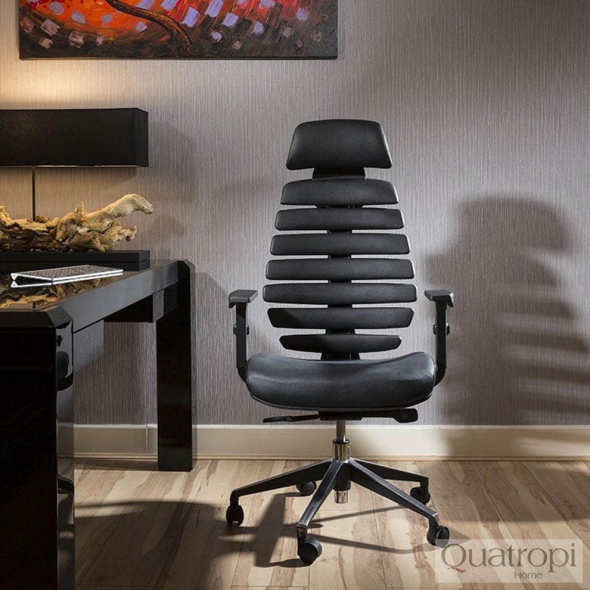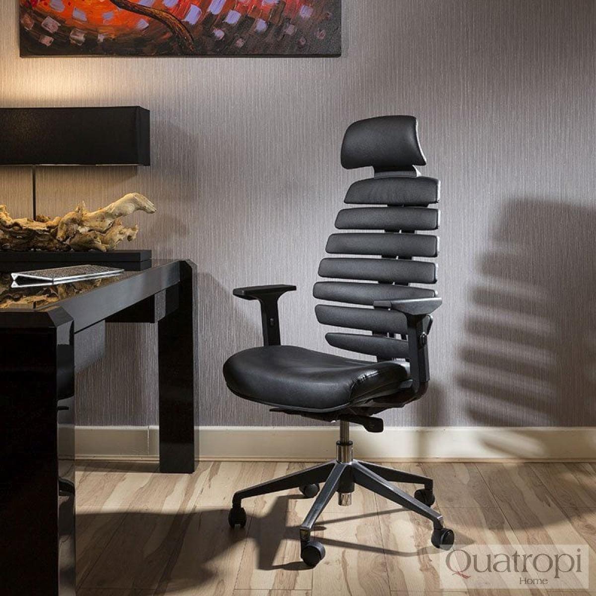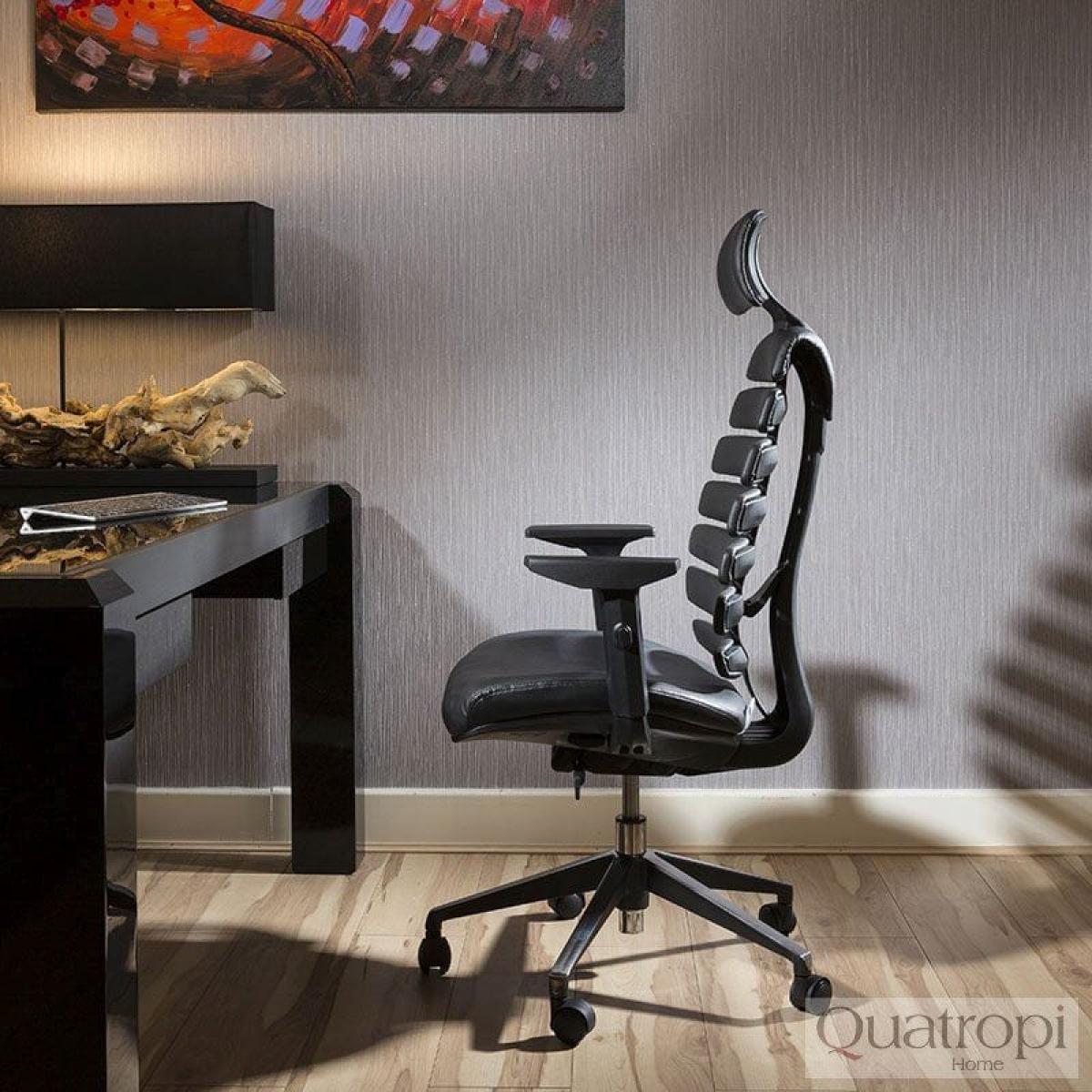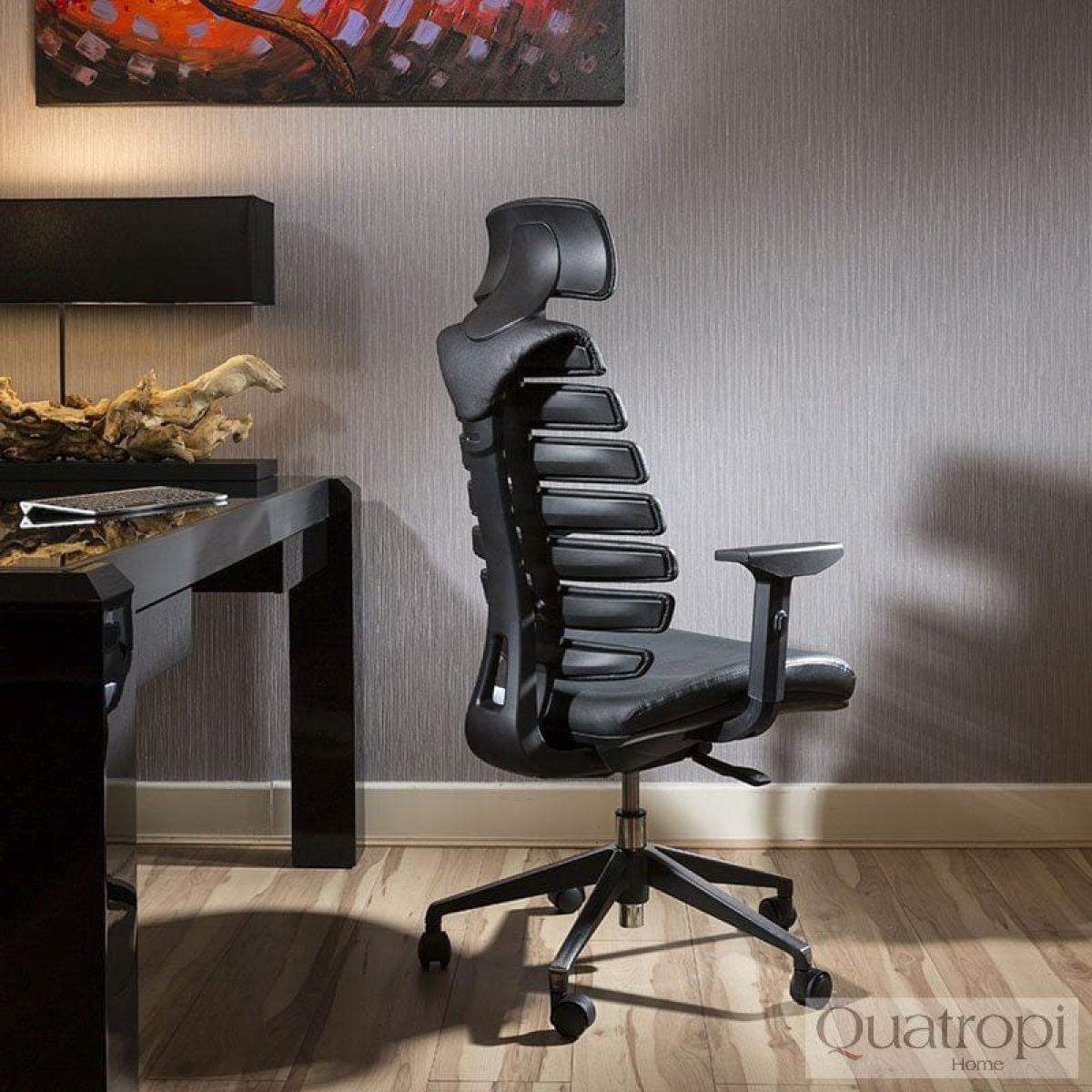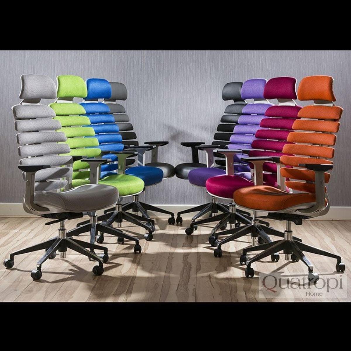 Unique Patented Morphorlogical Fish Bone Style Ultra Ergonomic Luxury Executive Office Chair. Many years of development, testing and refining have resulted in what we believe to be the best office chair ever. The super supple back panel has 3 remarkable features: (1) It will twist and turn exactly like your spine. (2) It has a special tilting function that removes the need to slide the base (3) Each horizontal section of the back is designed to curve around the body for incredible support. Additional Features include adjustable: Seat height, Arm height, Recline angle, Headrest height, Headrest angle, sliding seat and adjustable synchronised mechanism. The Fish Bone back provides flex zones ensuring constant support of back and lumbar area, it was designed specifically for those who are in an office chair for eight hours or more per day, and require "Intensive Use Seating" to keep them comfortable for long periods of time. W52cm D52cm H138cm Excellent Back Support Available in other colours
