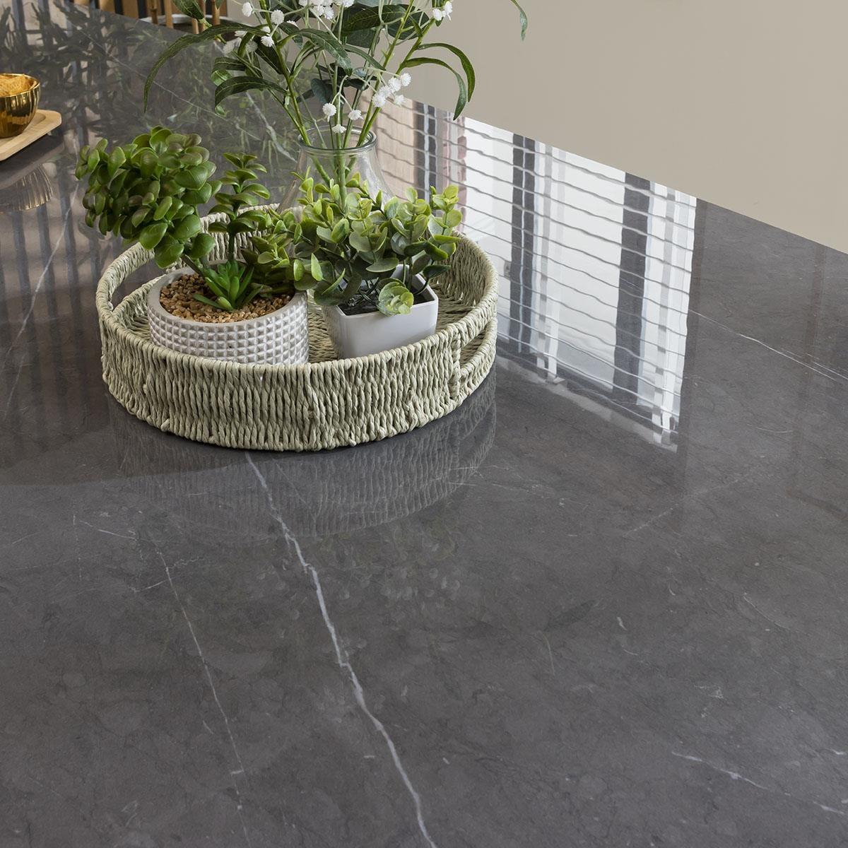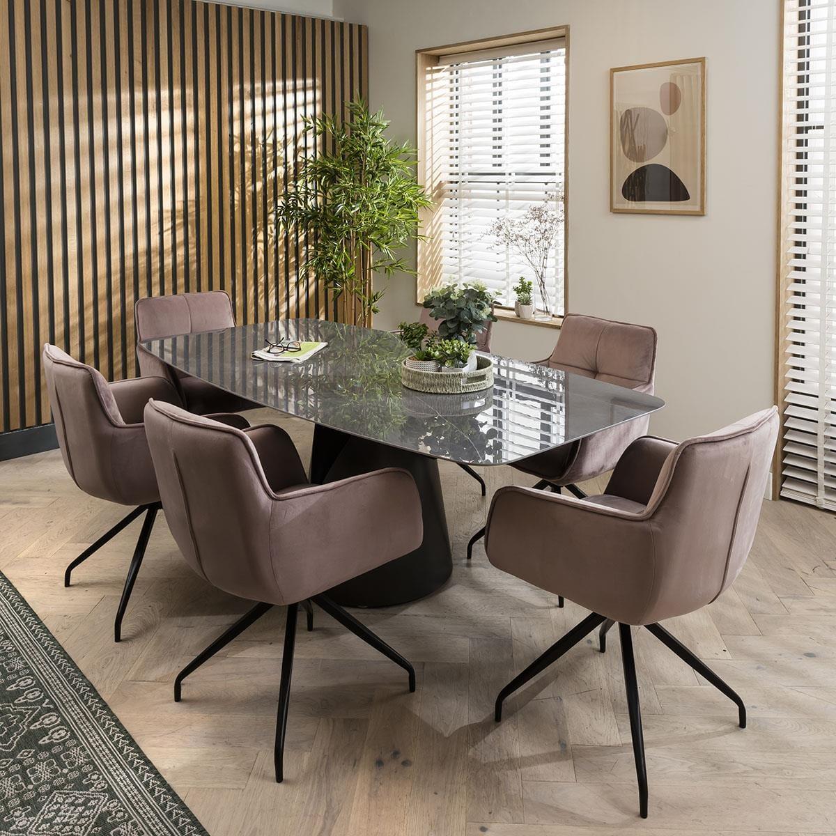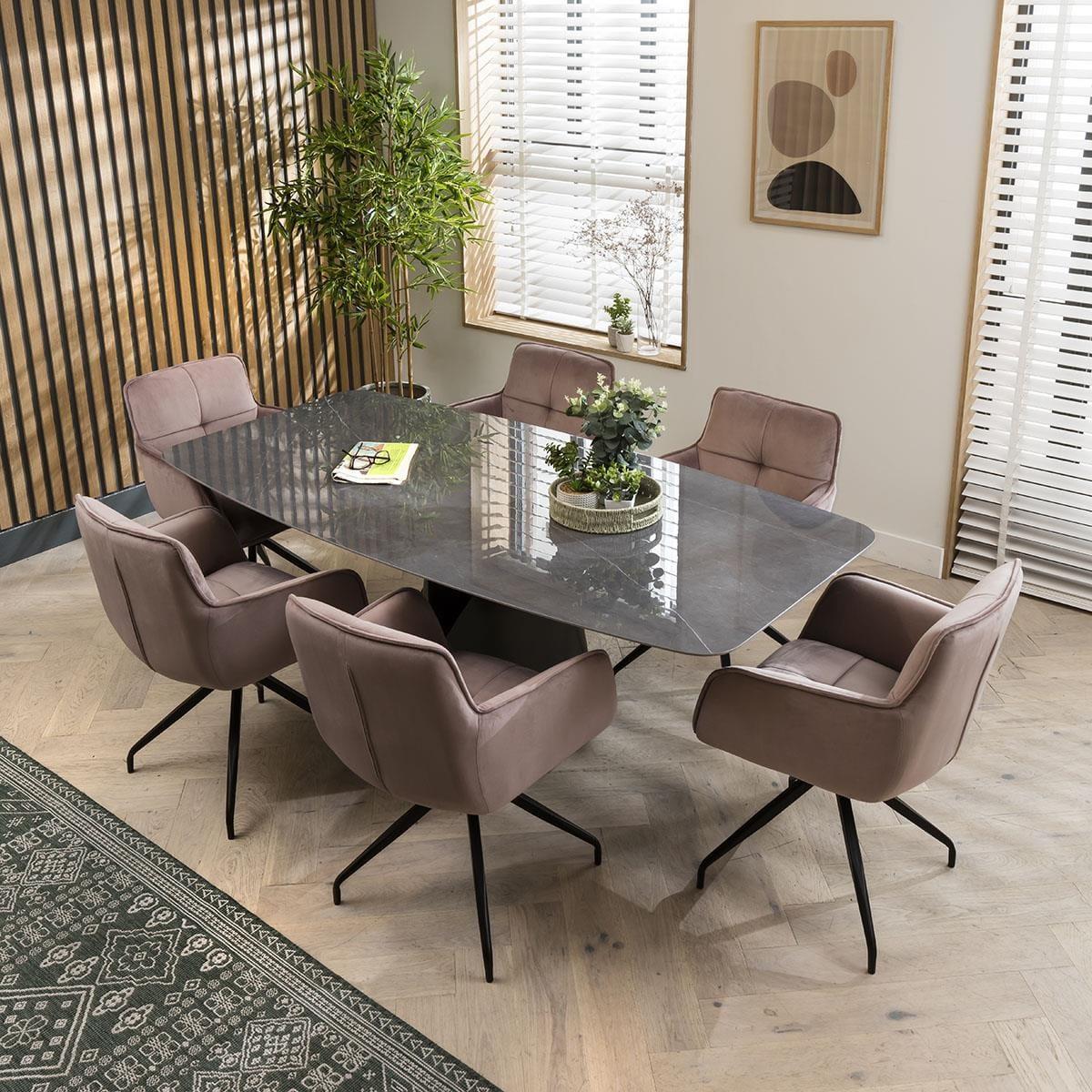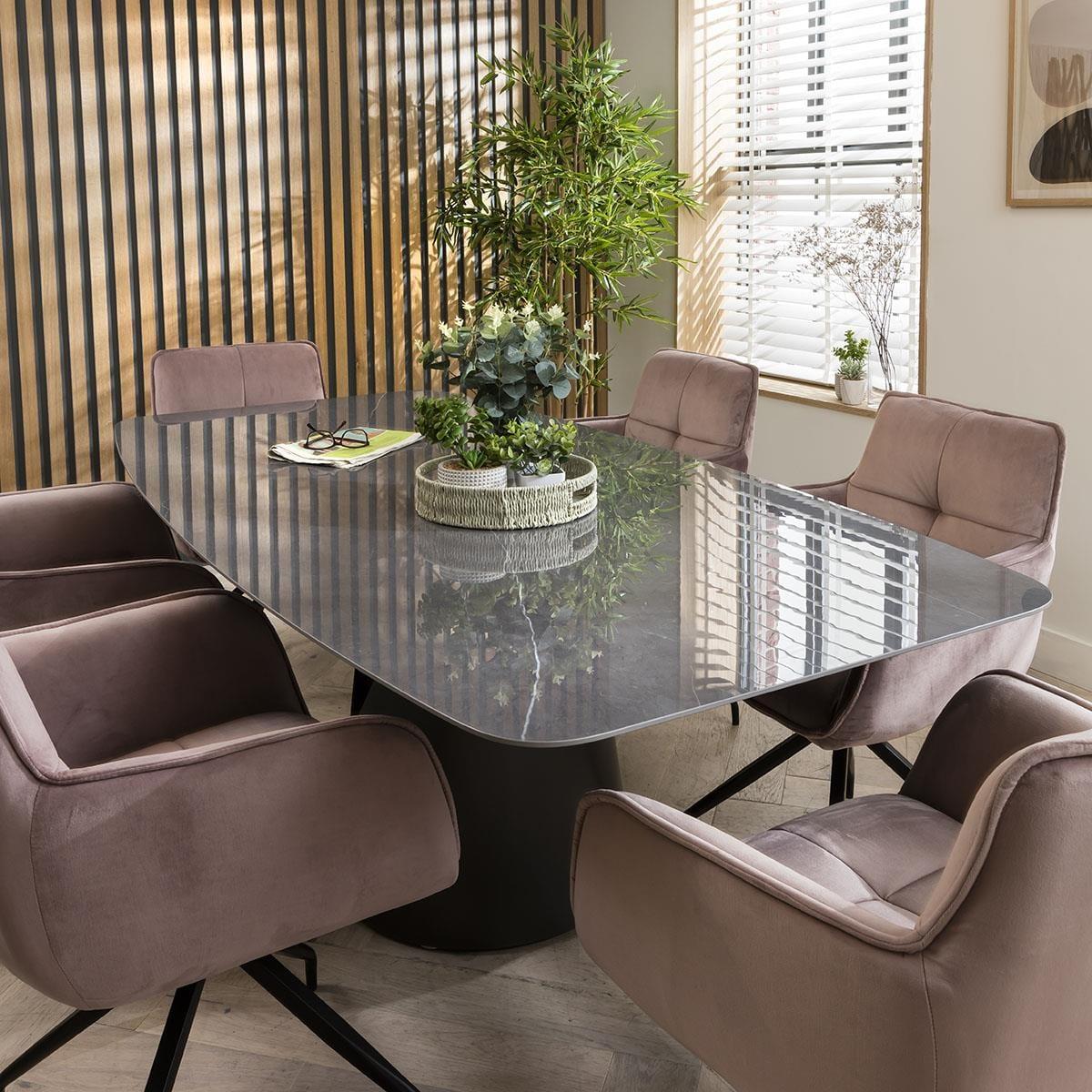 The Cathelen Ceramic Marble Dining Set is definitely a dining room table with a great aesthetic impact, with a single conical central base, formed by two coupled shaped blocks, thus resulting in a shape that leaves room for imagination, without edges and corners. This 200cm 6-Seater Dining Table and Chairs Set has a top made of premium ceramic marble. The steel pedestal base is finished in cool embossed graphite. Our premium ceramic tables are scratch, stain, and heat-resistant, the ceramic material makes it an excellent modern dining table for families with children or frequent entertainers. Indulge in the elegance of our carver chairs with their sleek and modern design. The pink velvet upholstery adds a touch of glamour, while the swivel base allows for easy movement during mealtime. With a soft cushioned seat, you'll sink into luxurious comfort. Experience the finest in dining furniture with our expertly crafted carver chairs, included in our exclusive 6 seater dining set. Immerse yourself in luxury with our premium quality carver chairs. Wrapped in soft pink velvet, our chairs feature a swivel base and a comfortable cushioned seat. Designed to complement the 6-seater dining set, these chairs are the epitome of sophistication and style. W100cm D200cm H73cm 6 Seater Designer Ceramic Marble Dining Table & Chairs Set High Quality Metal Pedestal Base