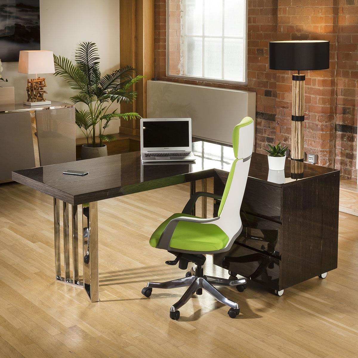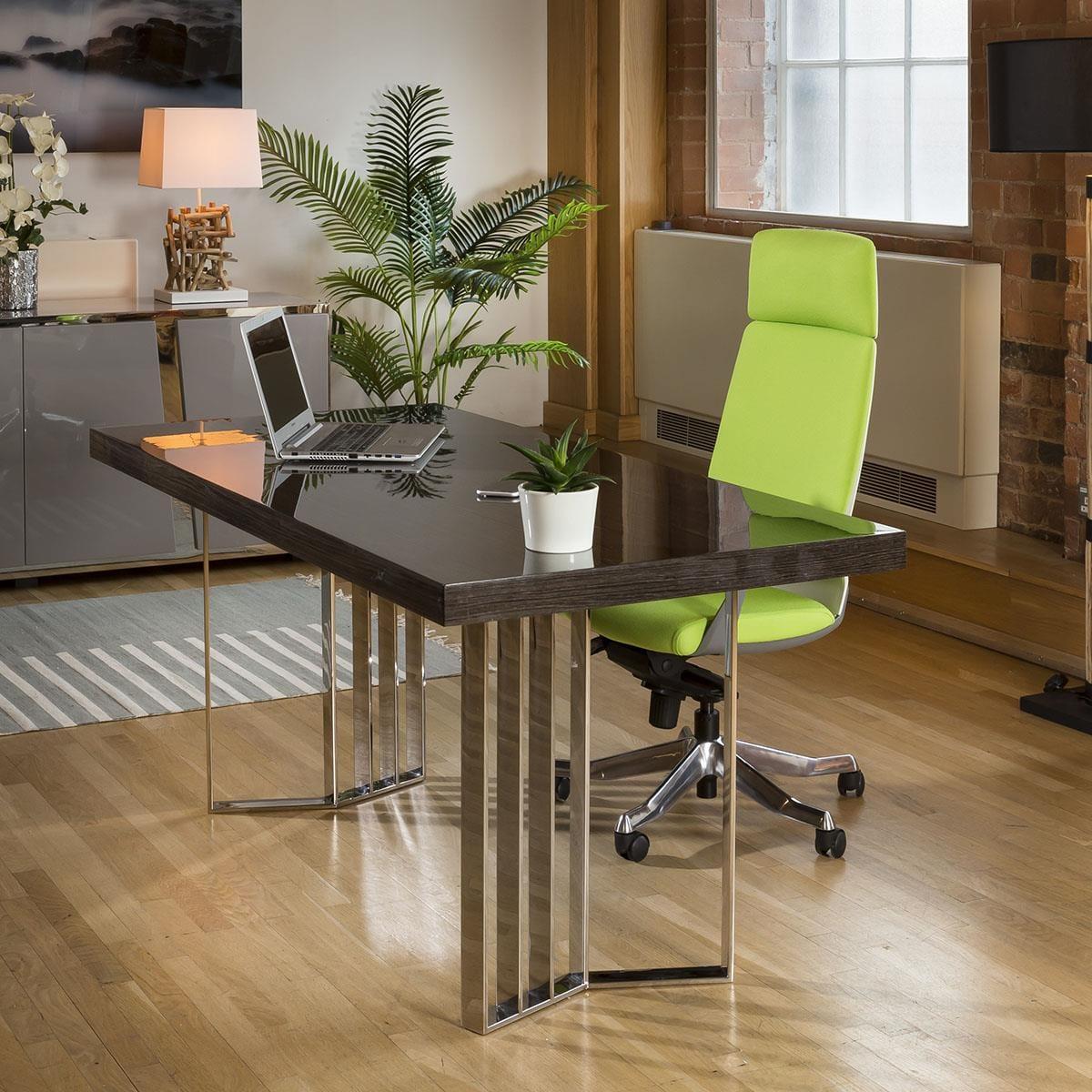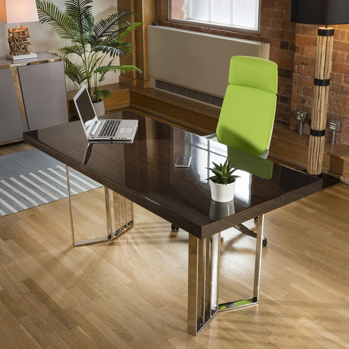 Here we have the Linea 1.7m Desk with a matching chest of three drawers. The contemporary angled polished steel legs add some flare to the Linea dining table, but it also means that seating on the end of table is made somewhat easier - maximising usability without sacrificing style is the goal here! This version of the Linea desk comes finished with a luxury high gloss smoked oak table top. Our high gloss finishes are hard-wearing and very easy to keep clean. If you need more information about this product, use the Live Chat service to speak to the team or send us a message. Spread the cost our with interest-free finance options. Minimum spend applies. W170cm D140cm H75cm Stainless Steel Detailing Matching Items Available