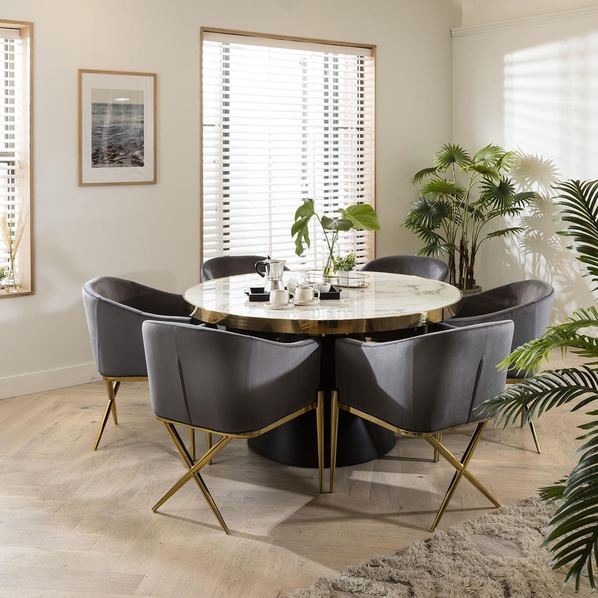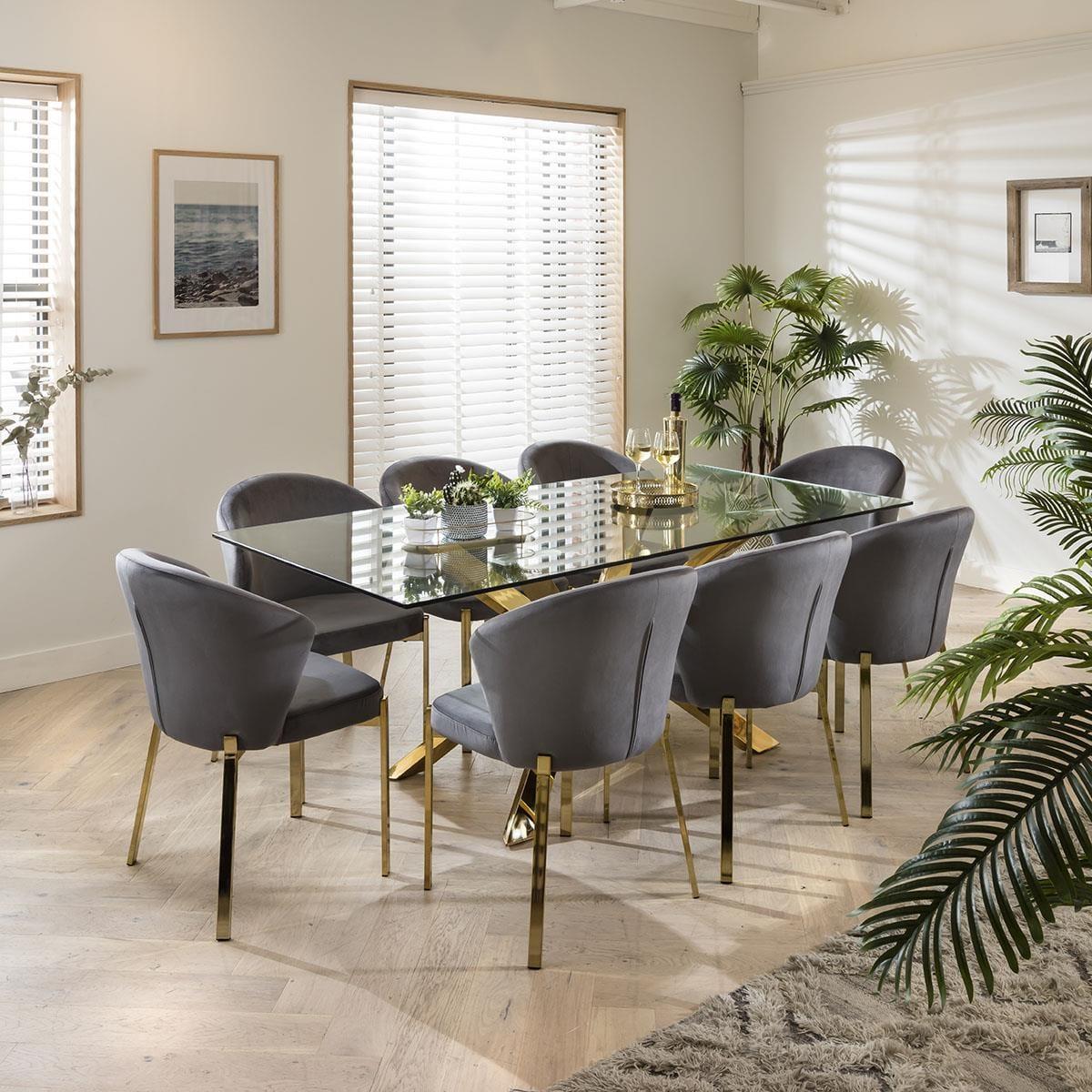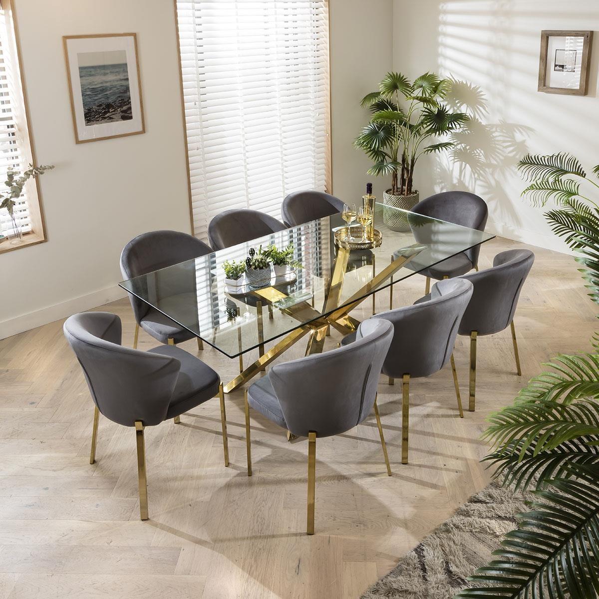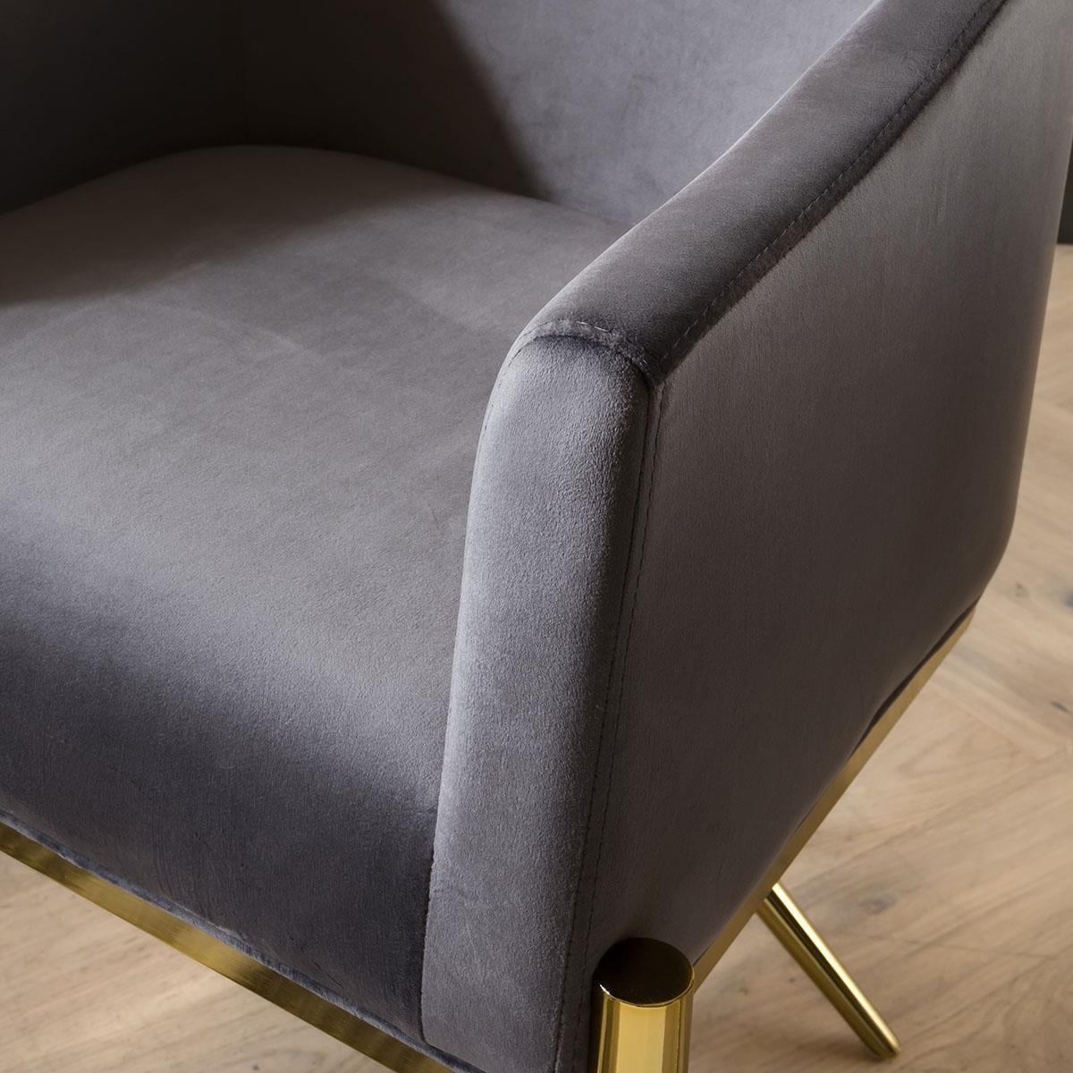Introduce luxe elegance to your dining room or living space with the JLA Performance Grey Velvet Accent Dining Armchair. Resting on a golden tubular metal frame, this versatile dining chair has volumes of character and a charming curved shape. Sitting atop of a unique golden base, the chair design wraps around your back with its sweeping silhouette and supportive club chair design. These dining chairs are upholstered in stain-resistant performance velvet upholstery and feature dense foam padding to offer a comfortable seat while dining, working, reading, or relaxing - this velvet chair is suited for the dining table or living room, entryway, bedroom, or office as an accent chair. As the best kept secret in the furniture business we have been quietly supplying thousands of loyal customers with our unique contemporary furniture since 2004. Seat Height: 46cm W65cm D61.5cm H80cm Complete the look with the JLA Bar Stools