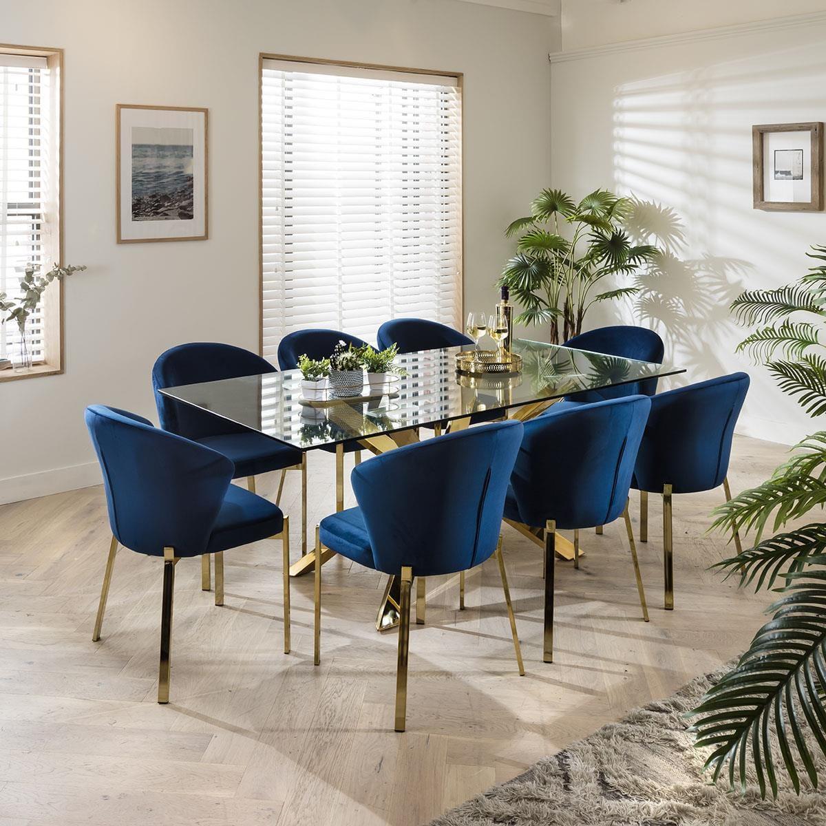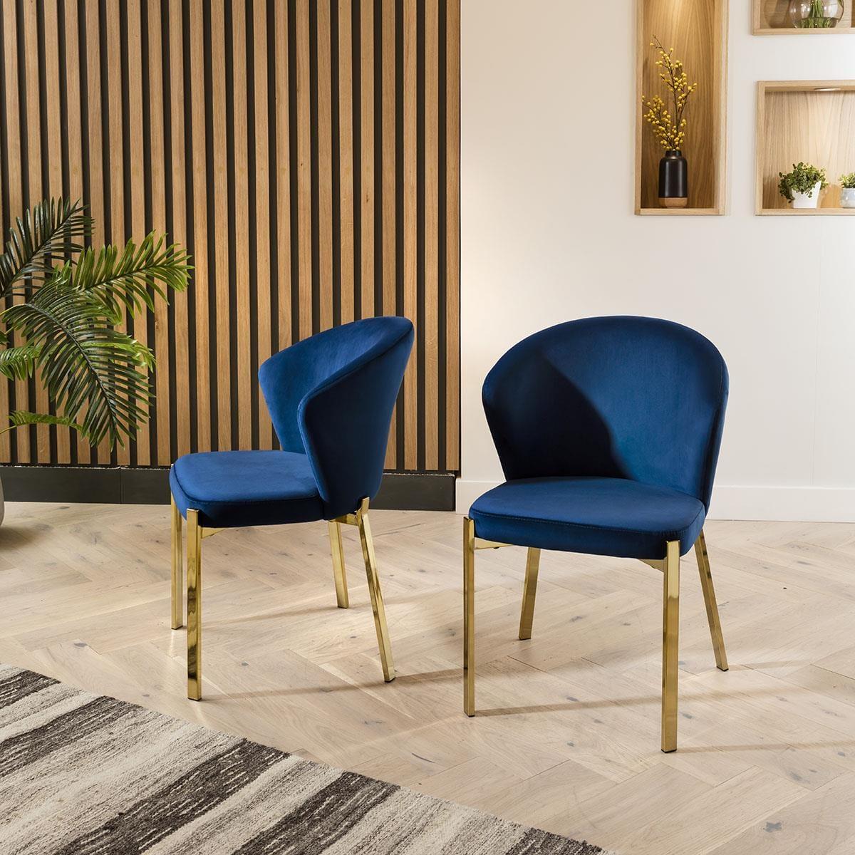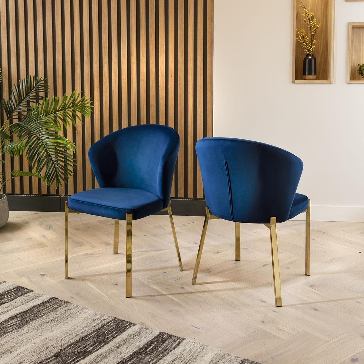 Revitalise your dining room decor with the JLA Luxury Navy Velvet Upholstered Dining Chairs. Graceful, minimalist lines draw inspiration from the signature silhouettes of mid-century dining chairs that blend seamlessly with the luxe comfort of the JLA Collection's soft and stain-resistant performance velvet upholstery. Cleverly proportioned, its curved back is designed to cocoon around you. Supported by dense foam padding and resting atop golden metal tapered legs, the JLA dining chairs are a vintage-modern style that makes this velvet chair ideally suited for a variety of rooms. Seat Height: 46cm W: 57cm, D: 62cm, H: 83cm Also available in Grey or Cream